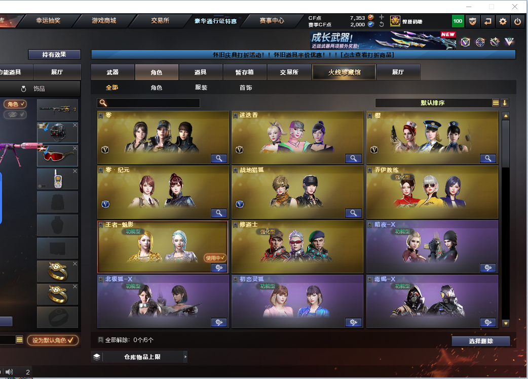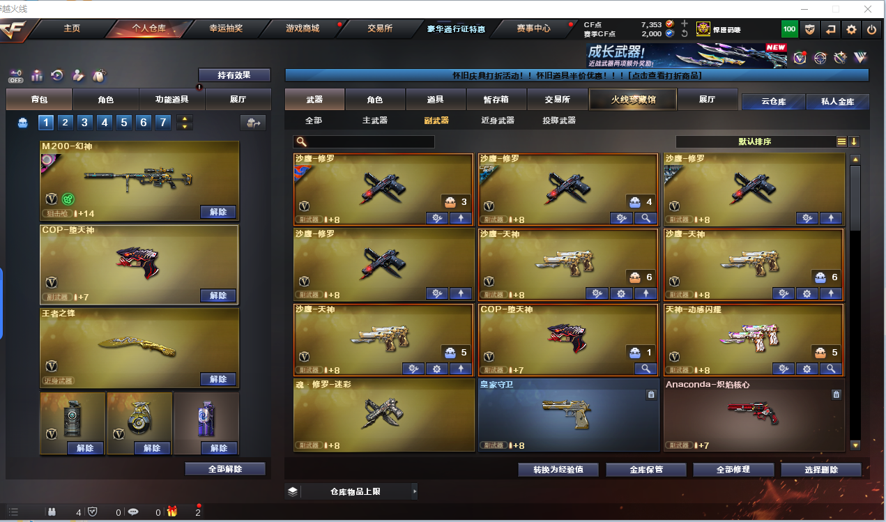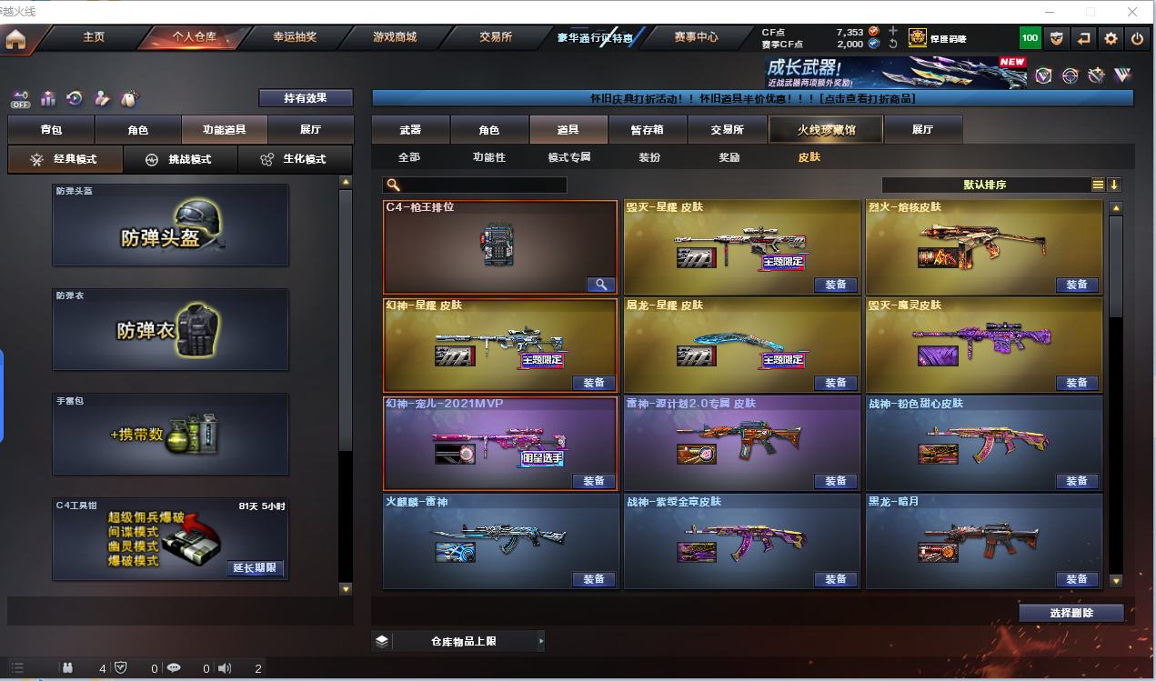 【角色】零。迷迭香,樱,战地猎狐,乔伊教练,王者-魅影,修道士, 【主武器】传说暗裔,M200-幻神,AK47-火麒麟,M4A1-雷神,M4A1-黑骑士,AK12-天启,AN94-超新星,Scar Linght-白虎,机械迷城-穹宇,QBZ03-金色蔷薇,AWM-天龙,Barrett-毁灭,Barrett-极光,AWM-裁决,Kar98K-星神, 【副武器】沙鹰-修罗。沙鹰-天神,COP-堕天神,天神-动感闪耀, 【近身武器】屠龙,擎天, 麒麟刺,斩神刀-雷神,王者之锋, 【投掷武器】雷霆套,雷暴套,堕天神套, 【音效卡】M200-幻神音效卡,AWM-裁决音效卡,M4A1-黑骑士音效卡,屠龙-动感闪耀音效卡,QBZ03-金色蔷薇音效卡,Barrett-毁灭音效卡,M4A1-雷神音效卡,AWM-昌龙-怀旧音效卡,Barrett-碧霄极光音效卡, 【皮肤】幻神-宠儿-2021MVP。幻神-星耀皮肤,毁灭-星耀皮肤,烈火-熔核皮肤,屠龙-星耀皮肤,毁灭-魔灵皮肤,雷神-源计划2.0专属皮肤,战神-粉色甜心皮肤,火麒麟-雷神。战神-紫绶金章皮肤,黑龙-暗月,黑龙-能量核心。 毁灭-星空,修罗-能量核心,毁灭-直播专属,黑龙-暗月,火麒麟-心动糖果,黑骑士-冠军之势,雷神-暗月,修罗-星空,白虎-电玩粉兔皮肤,AK47-B-常胜将军-曹操,;RPK-盘龙,QBZ03-金色蔷薇,M200-幻神,Scar Light-白虎,Kar98K-星神,传说暗裔,