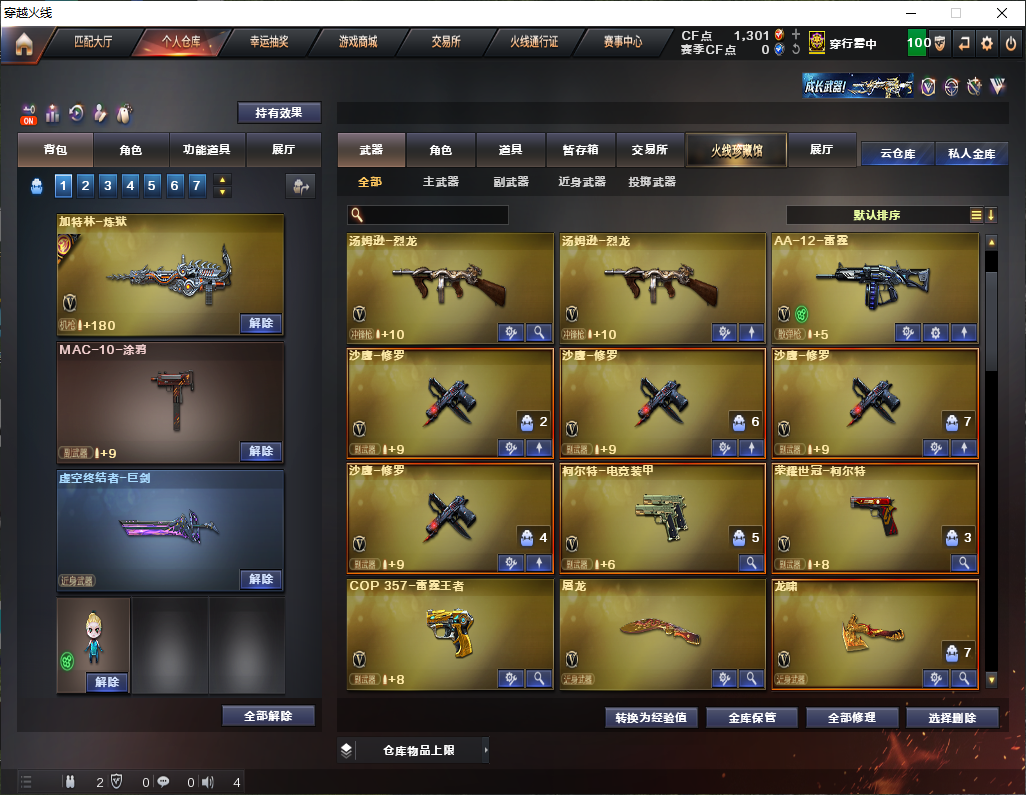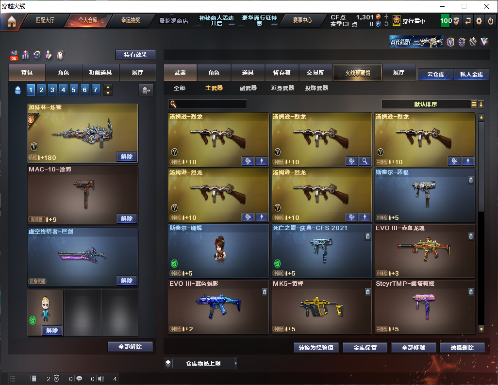 【主武器】白虎/m4夜魔/异变镇魔者/斯太尔蝴蝶/②炼狱/⑥烈龙⑥盘龙/雷神/火麒麟/黑骑士/黑武士/蔷薇qbz/无影/烈火/天龙/毁灭/裁决/电竞装甲大炮/AA12雷霆/圣炎切割者3/神圣爆裂者+末日3/死亡之眼庆典CFS2021/ 【副武器】COP357-雷霆王者觉醒版/柯尔特-荣耀世冠/④修罗/电竞装甲柯尔特/③涂鸦手枪 【近身武器】尼泊尔电竞装甲/屠龙/龙啸/擎天/麒麟刺/手斧镜/黄金生化钩/迷你牛牛/ 【投掷武器】②迷你生化手雷/⑦电竞装甲恶棍雷+烟闪/ 【角色】沙漠玫瑰+四防/葵/炫/灵狐者职业经理+爆破四防/职业选手/炫彩背包/对讲机/圣龙戒/魔龙戒 【皮肤】炼狱-斗鱼平台皮肤/雷神-斗鱼平台皮肤/毁灭-冠军之怒皮肤/黑骑士-战神马超皮肤/雷神-耀金皮肤/ 【音效卡】0 【道具】元首/全背包/VIP6/AC/烟雾头/闪光镜/变异宝贝/疯狂宝贝/灵魂忍者/迷雾幽灵/绿巨人/迷雾幽灵/妖姬/手枪/步枪/冲锋枪/机枪/生化弹夹/时空猎手-幻影猎人皮肤/生化爆破全装;荣耀世冠-柯尔特,沙漠玫瑰,RPK-盘龙,QBZ03-金色蔷薇,Scar Light-白虎,
