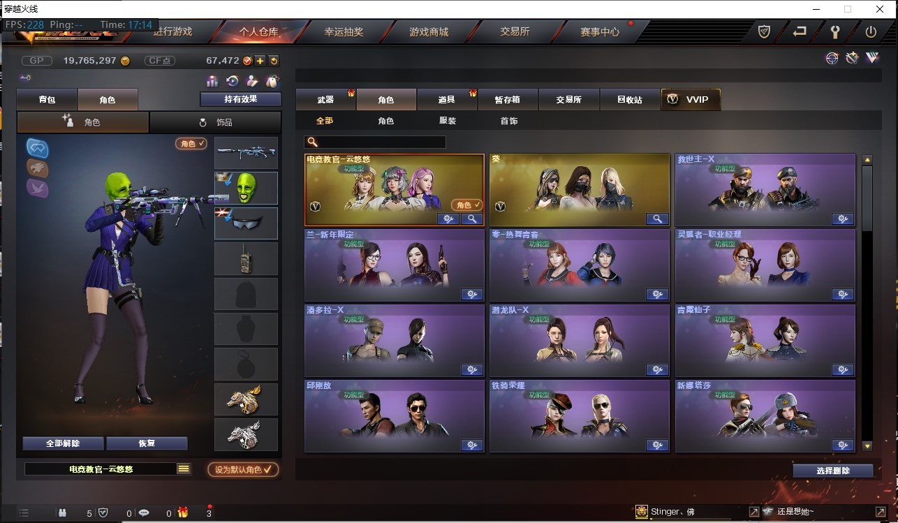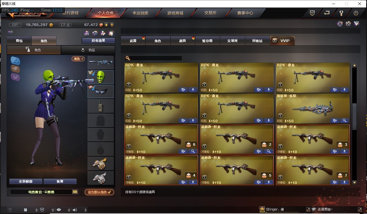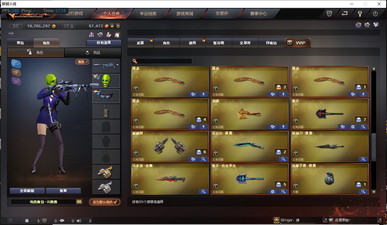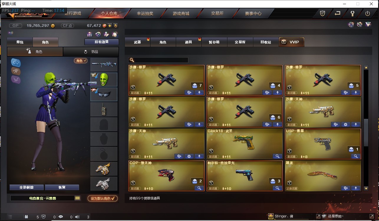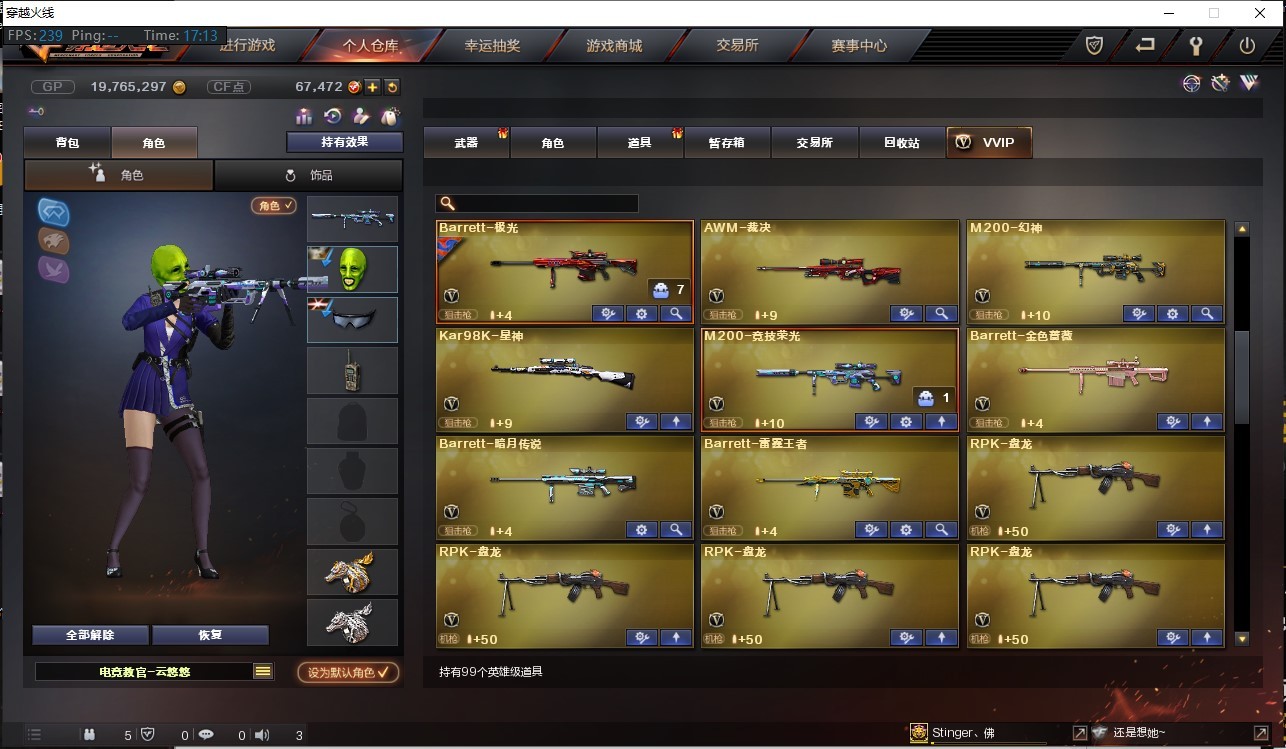 【昵称】GX179 【角色】电竞教官-云悠悠、葵、灵狐者-职业经理、 【主武】M200-幻神、星神、m200-竞技荣光、朱雀、王者之心觉醒、斯泰尔-蝴蝶6烈 6盘、AWM-天龙、AWM-裁决、Barrett-金色蔷薇、Barrett-雷霆王者 【近身】屠龙、龙啸、擎天、麒麟刺、尼泊尔-雷霆、斩神刀-雷暴、马来剑-夜魔、擎天-竞技荣光、 【副武】修罗、天神、武圣、usp-雷暴、COP-堕天神、柯尔特-竞技荣光 【投掷】雷霆太、雷暴套、夜魔套、竞技荣光套、 【音效】绝迹语音包、毁灭音效卡、 【道具】AC套、C4工具钳、手雷包、 【皮肤】火麒麟-雷神、天龙-CFSATr、黑骑士-战神马超、雷神耀金、雷神烈虎 【生化】夺命之镰、变异宝贝、灵魂忍者、生化弹匣、防化服 【更新时间】2022/8/9 【南部战区】广东一区、广东二区、广东三区、广东四区、广西一区、江西一区、南方大区、湖南一区、湖南二区、湖北一区、湖北二区、广东电信一区、广东电信二区、广东电信三区、广东电信四区、广西电信一区、江西电信一区、南方电信大区、湖南电信一区、湖南电信二区、湖北电信一区、湖北电信二区(CF相同战区进入相同频道可以一起玩;USP-雷暴,电竞教官-云悠悠,RPK-盘龙,M200-幻神,Kar98K-星神,