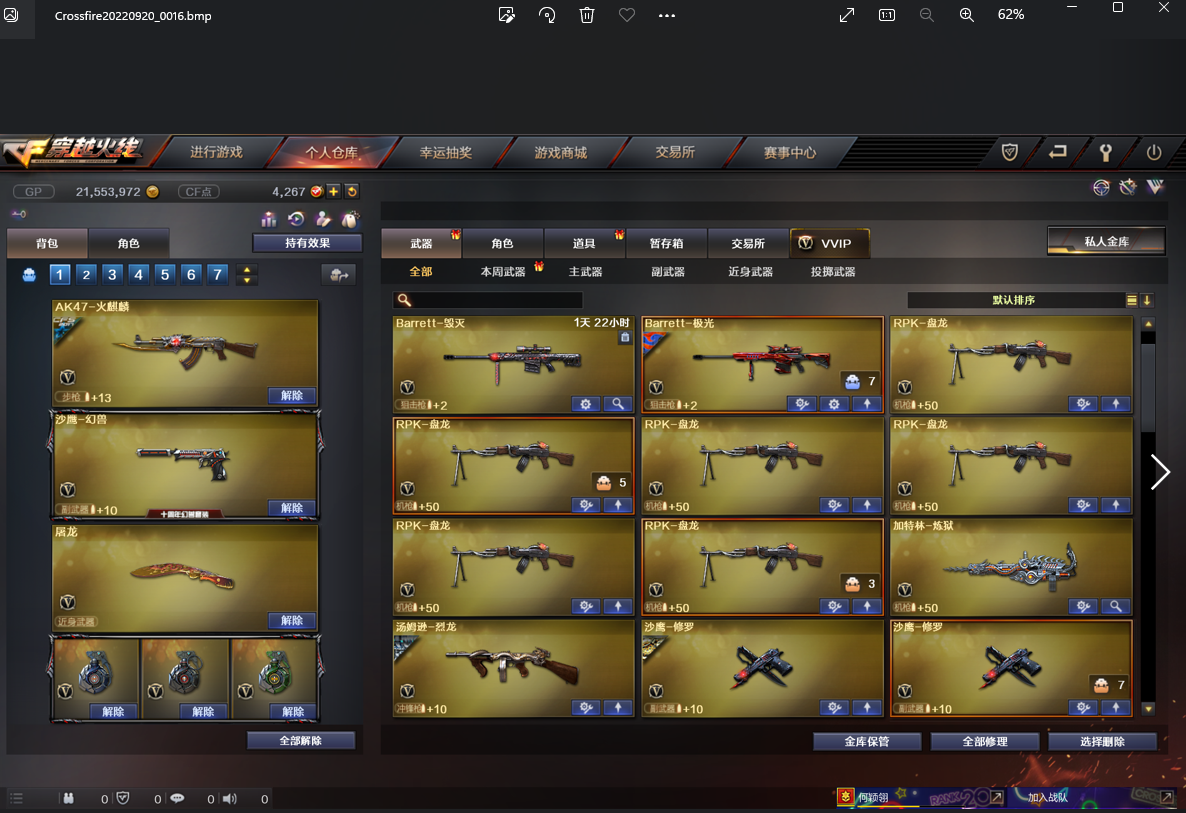 >>>>>>请勿毁号,涉及毁坏虚拟财产罪及计算机安全罪,请文明游戏素质游戏,让我们共建美好租号平台<<<<<< 本游戏账号英雄武器68V; 王者武器21王者。 装备不多,但是主武器、副武器、近身武器够用 可以有完美游戏体验。特殊装备有:麒麟刺、AK47-火麒麟、加特林-炼狱、炫金黑龙、炫金雷神、王者之怒、王者之啸、王者之击、源·火麒麟、源-金色蔷薇、堕天使、蝴蝶、生化弹匣、堕天使道具卡、王者之啸金色光效、M4A1-黑骑士音效卡、等。 注意事项: A.游戏过程中请不要恶意挂机或者不文明发言 B.恶意挂机、顶号等行为将被拉黑无法再次下单 C.进入游戏后中途请勿退出登陆,否则无法再次上号 D.部分账号由于异地登录可能会出现密码错误提示,通常再尝试5-6次后可上号 |||||||||喜欢本账号请点 ☆收藏☆ 方便下次租用,谢谢光临惠顾|||||||||;RPK-盘龙,