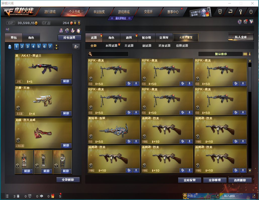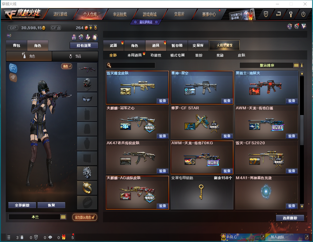 角色:樱、战舰玩偶、胡司令玩偶、电磁巨兽玩偶、关羽玩偶、蝴蝶玩偶、马超玩偶、铁骑荣耀玩偶、15周年玩偶、深渊红玩偶、爆躁猪猪玩偶、8周年死神戒、鹰眼戒、耀银戒、耀金戒、 主武器:火麒麟X2、黑龙X2、雷神X2、黑骑士X3、天启、黑鲨X2、无影神兵利器、金色蔷薇X3、王者之心、雷神葫芦兄弟、天龙、毁灭X2、盘龙X6、炼狱、烈龙X6、雷霆、萌杀、机甲核心、金色蔷薇萌杀、摸金校尉、现代金属、青花瓷、15周年嘉年华、锋芒破茧、火麒麟绝迹、火麒麟桃园结义、青龙魂、黑龙龙太子、黑骑士白马银枪、御雷神葫芦兄弟、机甲刑天、御雷神烈虎、御麒麟18、源超新星、源火麒麟、源雷神X2、黑武士、源机械迷城、源千变、源无影、炫金火麒麟、炫金骑士、毁灭青帝、毁灭神秘黑洞、御毁灭黑大圣、毁灭葫芦兄弟、源毁灭、源极光、源天龙、源朱雀、炼狱玩具枪、炼狱女娲 副武器:沙鹰修罗X4、沙鹰天神X2、魂修罗15周年嘉年华、修罗摸金校尉、源天神、 近身武器:屠龙X2、龙啸X2、擎天、麒麟刺X2、龙啸烈火龙威、王者之刺、源擎天X2、源龙啸 投掷武器:高爆手雷、闪光弹神工天巧X2、烟雾器神工天巧、 道具:7背包全开、防化服、毁灭音效卡、雷神音效卡、火麒麟白虎皮肤、火麒麟大唐荣光皮肤、毁灭墨兰皮肤、火麒麟心动糖果皮肤、黑骑士耀金皮肤、毁灭星空皮肤、毁灭耀金皮肤、火麒麟冠军之心皮肤、黑骑士地狱火皮肤、天龙传奇白鲨皮肤、天龙传奇皮肤、毁灭CFS2020皮肤、火麒麟战队皮肤、步枪弹夹、防弹衣、防弹头盔、闪光护目镜、C4工具钳、手雷包、;RPK-盘龙,QBZ03-金色蔷薇,
