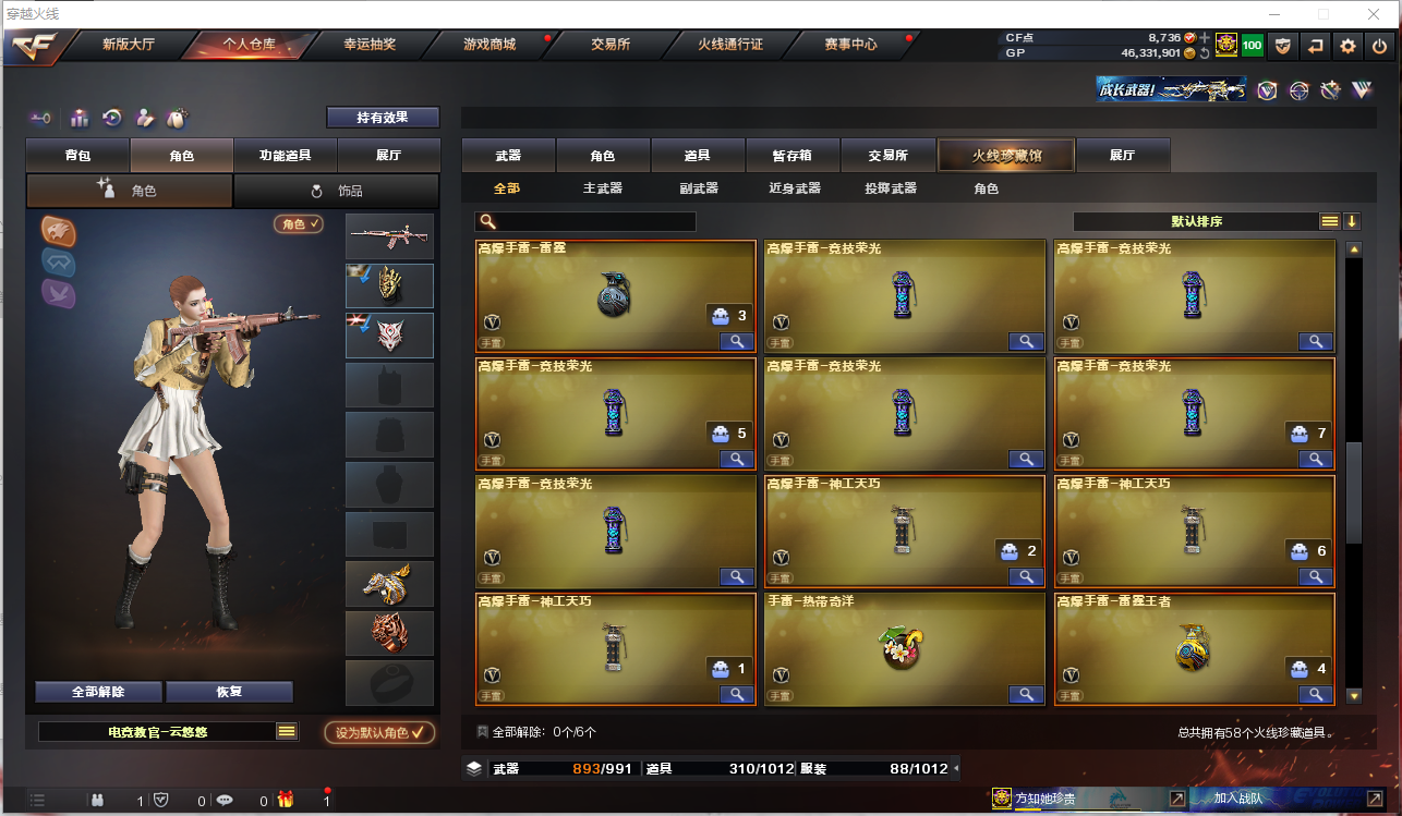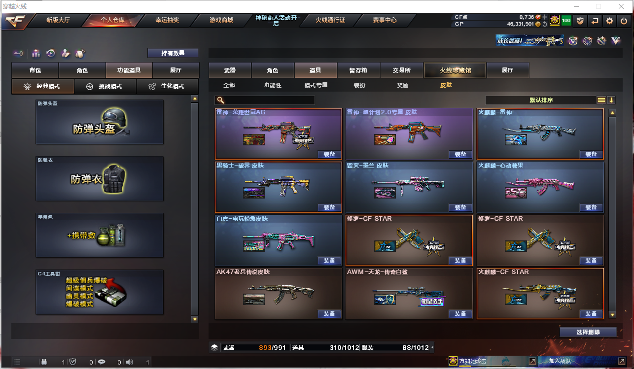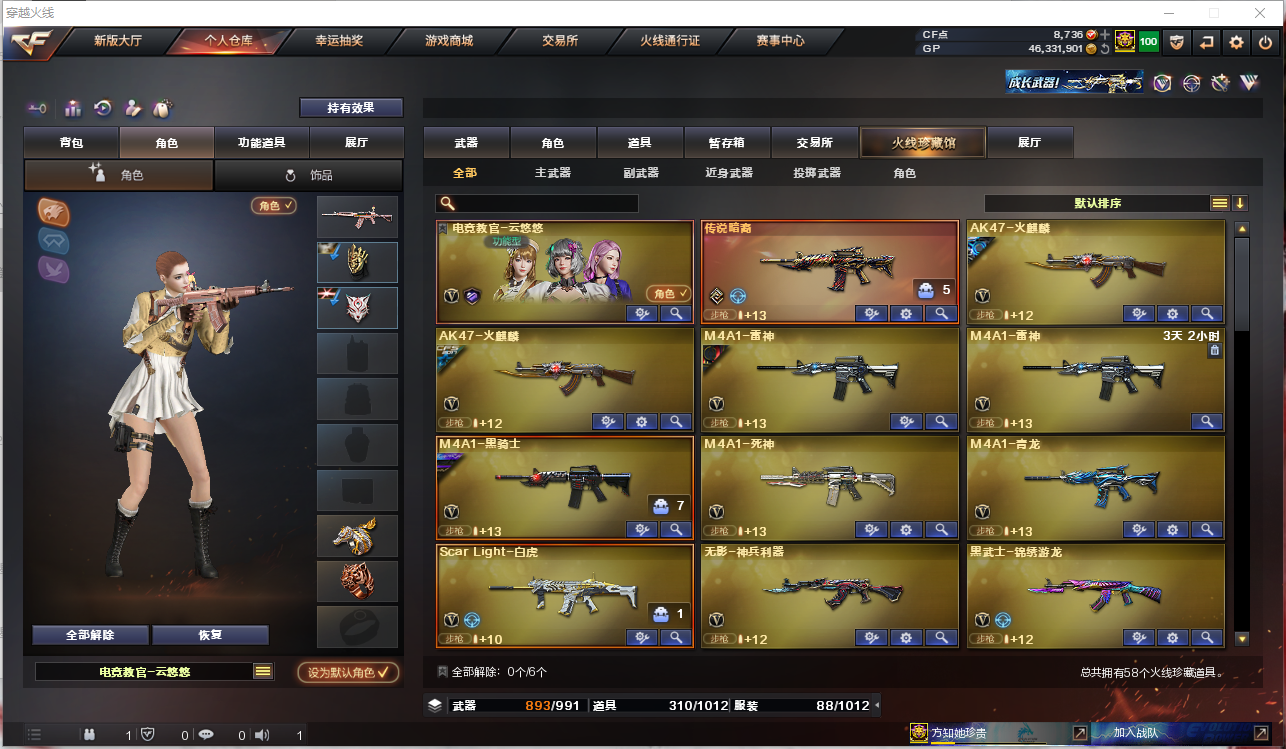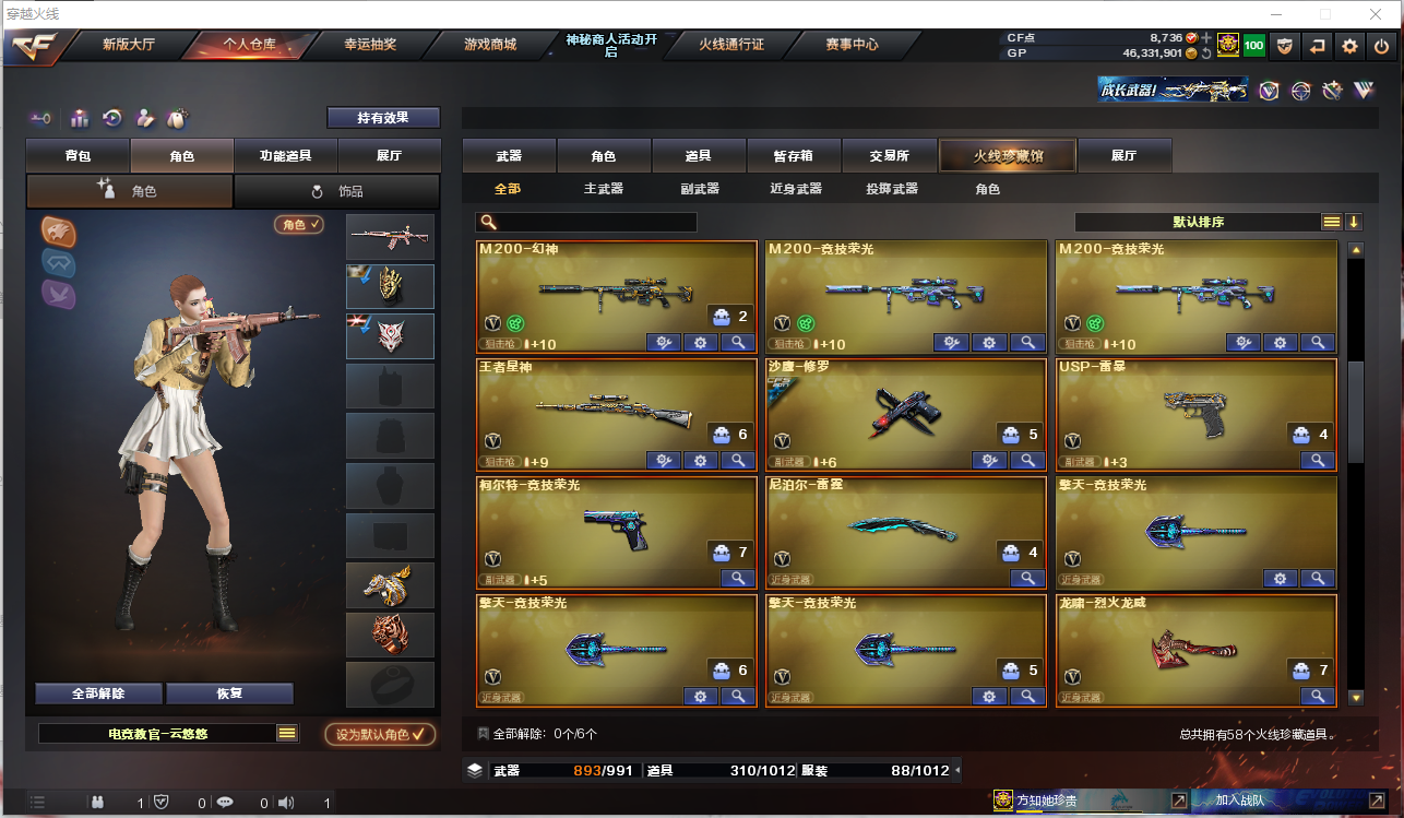 新增:幻神-丹凤、沙鹰-天神。 【角色】电竞教官-云悠悠,狐影,奇洋探员,蛇隐宗, 【主武器】M200-幻神。传说暗裔,AK47-火麒麟,M4A1-雷神,M4A1-黑骑士,M4A1-死神,M4A1-青龙,Scar Linght-白虎,无影-神兵利器,黑武士-锦绣游龙,QBZ03-金色蔷薇。AK47-B-战神,m200-竞技荣光,王者星神, 【副武器】沙鹰-修罗,USP-雷暴,柯尔特-竞技荣光, 【近身武器】尼泊尔-雷霆,擎天-竞技荣光,龙啸-烈火龙威, 【投掷武器】雷霆套。竞技荣光套。神功天巧套,雷霆王者套。 【音效卡】 【皮肤】雷神-荣耀世冠AG,雷神-源计划2.0专属皮肤,火麒麟-雷神,黑骑士-破界,毁灭-墨兰皮肤,火麒麟-心动糖果,白虎-电玩蓝兔皮肤,修罗-CFSTAR。AK47老兵传说皮肤,AWM-天龙-传奇白鲨,火麒麟-CFSTAR。;USP-雷暴,电竞教官-云悠悠,QBZ03-金色蔷薇,M200-幻神,Scar Light-白虎,传说暗裔,