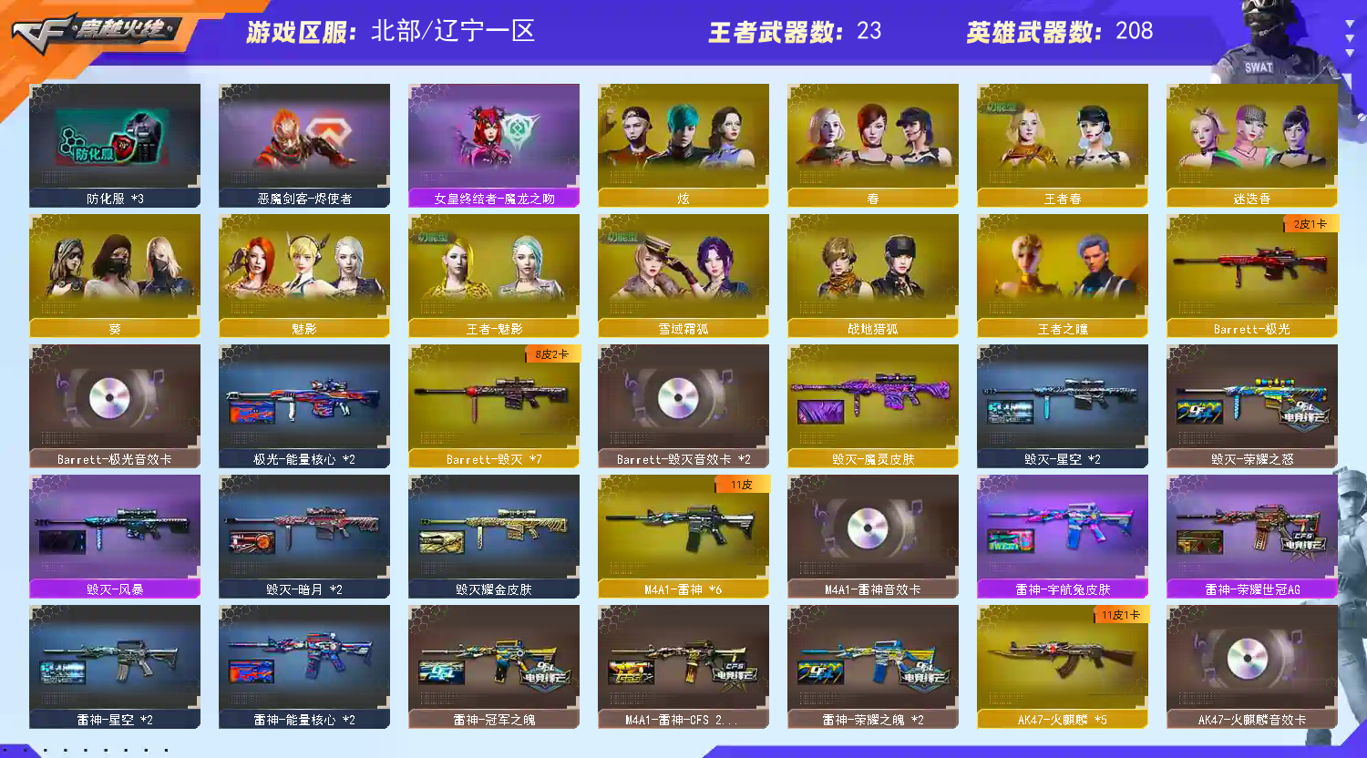【幻神3皮带卡 生化满配 稀有裁决音效卡】【m200幻神+音效卡+冠军之幻+ag17冠军+荣耀世冠白鲨+usp雷暴*2】【98k星神+呛娘皮肤】【王者幻神 王者星神】【6盘龙 6烈龙 炼狱 斯太尔蝴蝶】【传说光耀 传说暗裔】【scar白虎+卡】【qbz金色蔷薇+卡+荣耀世冠白鲨】【hk417朱雀】【火麒麟+卡+呛娘皮肤+荣耀世冠+冠军之心】【黑龙+卡】【雷神+卡+荣耀世冠+荣耀之魄+冠军之魄】【黑骑士*5+卡+冠军之势】【毁灭+卡+荣耀之怒】【极光+卡】【裁决+卡】【荣耀世冠套 雷暴套】 【武器:无影 死神 超新星 武圣 雷暴 青龙 夜魔 王者之心 王者之武 王者冰魄 王者之鲨 王者炎心 qbz王者蔷薇 天龙】 【手呛:修罗*6 沙鹰天神*4 武圣 cop雷霆*3 】 【刀具:屠龙*5 龙啸*3 擎天*4 麒麟刺*3 幻灵之峰 王者之刺 龙啸烈火龙威】 【雷套:雷霆雷*6 雷暴雷*6】 【小人呛:雷神精英刀锋 火麒麟绝迹】 【音效卡:黑骑士音效卡 火麒麟音效卡 毁灭音效卡 极光音效卡 黑龙音效卡 雷神音效卡 裁决音效卡 幻神音效卡 毁灭音效卡 金色蔷薇音效卡 白虎音效卡 】 【四防角色:王者春 王者魅影 职业经理 樱青春偶像】;USP-雷暴,荣耀世冠-柯尔特,RPK-盘龙,QBZ03-金色蔷薇,M200-幻神,Scar Light-白虎,Kar98K-星神,
