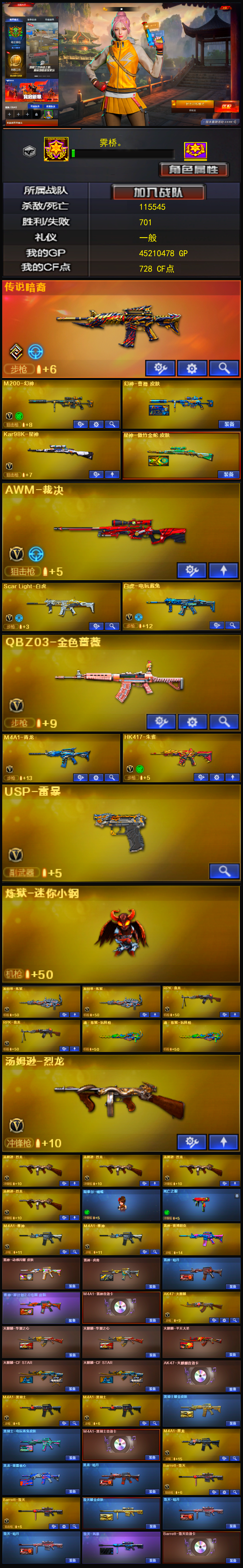 【亮点解析 武器齐全 生化高配】【m200幻神+曹操+usp雷暴】【98k星神+傲竹金蛇】【6烈龙 炼狱*2 盘龙*2 炼狱小刚 斯太尔蝴蝶】【传说暗裔】【scar白虎】【qbz金色蔷薇】【hk417朱雀】【火麒麟+卡】【黑龙】【雷神+卡】【黑骑士+卡】【毁灭+卡】【极光】【裁决】 【武器:武圣 天启 青龙 王者之魄 王者冰魄 白虎电玩蓝兔 天龙 】 【10手呛:修罗*7 沙鹰天神*4 武圣 天神动感闪耀 修罗古蛇迷踪】 【11刀具:屠龙*4 龙啸 擎天 麒麟刺 斩神刀雷暴 神工天巧 屠龙动感闪耀 王者之锋】 【4雷套:雷暴雷*3 电竞装甲雷】 【小人呛:雷神小红 火麒麟灵狐 朱雀蛇隐宗】 【音效卡:毁灭音效卡 黑骑士音效卡 火麒麟音效卡 雷神音效卡 】 【四防角色:王者迷迭香 鹰】;USP-雷暴,RPK-盘龙,QBZ03-金色蔷薇,M200-幻神,Scar Light-白虎,Kar98K-星神,传说暗裔,