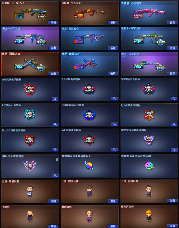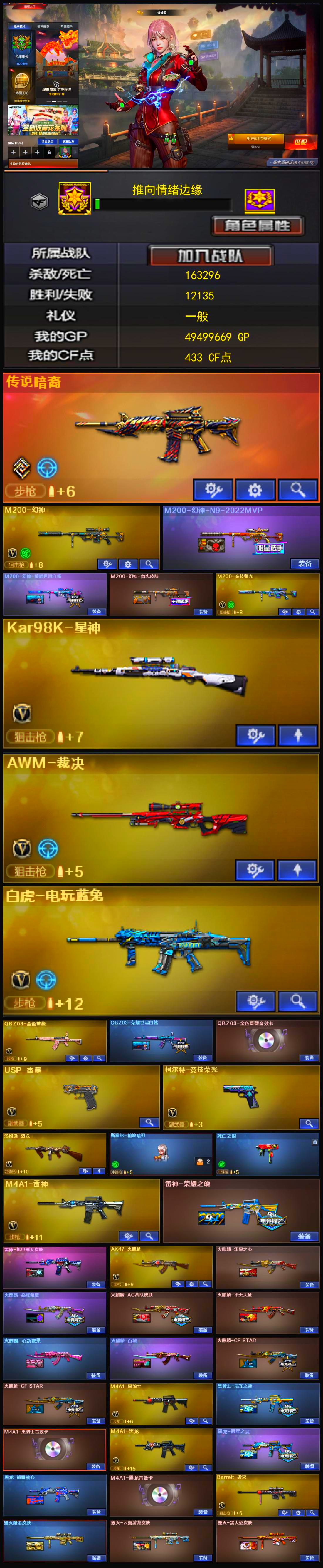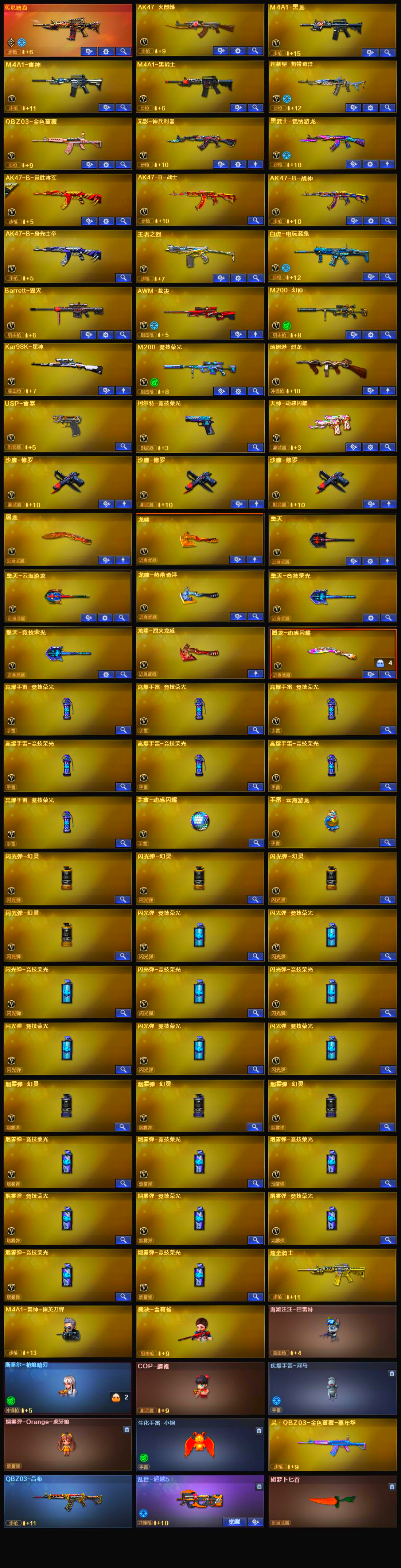 【m200幻神+荣耀世冠白鲨皮肤+n9皮肤+黄忠皮肤+usp雷暴】【m200竞技荣光套装+电竞教官云悠悠】【98k星神】【传说暗裔】【qbz03金色蔷薇+金色蔷薇音效卡+荣耀世冠白鲨皮肤】【雷神+荣耀之魄皮肤】【火麒麟+巅峰荣耀皮肤】【黑骑士+黑骑士音效卡+冠军之势皮肤】【黑龙+黑龙音效卡+冠军之武皮肤】【王者之烈】【毁灭 白虎电玩蓝兔 常胜将军 身先士卒 超新星热带奇洋 黑骑士海王 黑武士锦绣游龙 无影神兵利器 裁决 芭蕾特金色蔷薇 烈龙】——【热门武器/小人呛】【雷神精英刀锋 裁决雪莉杨 cop白鲨 cop旗袍 】——【usp雷暴 柯尔特竞技荣光 修罗 天神动感闪耀】——【龙啸 擎天竞技荣光 屠龙 擎天 龙啸云海游龙 龙啸烈火龙威 龙啸热带奇洋 擎天云海游龙】——【竞技荣光投掷武器套装*7】——【角色】【4防(电竞教官云悠悠 王者春)】【荒漠琉璃 机械姬 】【奇洋探员 乔伊教练 云海玲珑】;USP-雷暴,电竞教官-云悠悠,QBZ03-金色蔷薇,M200-幻神,Kar98K-星神,传说暗裔,