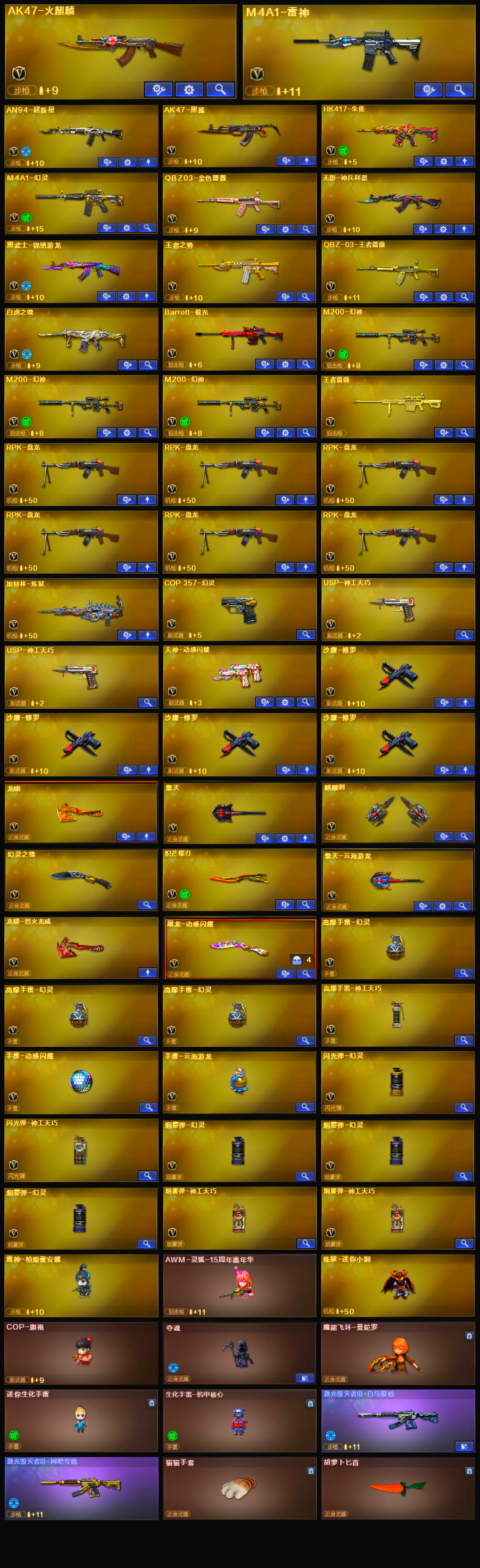 【亮点解析:幻神3皮带卡 生化满配】【m200幻神*3+音效卡+降龙+荣耀世冠白鲨+宠儿皮肤】【6盘龙 炼狱 烈龙云海游龙 炽芒蝶刃 炼狱小刚】【白虎之魄】【qbz金色蔷薇+卡+荣耀世冠白鲨】【hk417朱雀+武当】【火麒麟】【雷神】【极光+卡】【炼狱+卡】 【武器:幻灵 qbz王者蔷薇 王者之势 王者蔷薇】 【7手呛:修罗*4 cop幻灵 usp神工天巧*2】 【7刀具:龙啸 擎天 麒麟刺 幻灵之峰 屠龙动感闪耀 龙啸烈火龙威 擎天云海游龙】 【雷套:幻灵雷 神工天巧雷】 【小人呛:雷神呛娘雷安娜】 【音效卡: 炼狱音效卡 极光音效卡 幻神音效卡 金色蔷薇音效卡】 【四防角色:王者凌霄 王者潘多拉 暗夜审判】;炽芒蝶刃,RPK-盘龙,QBZ03-金色蔷薇,M200-幻神,