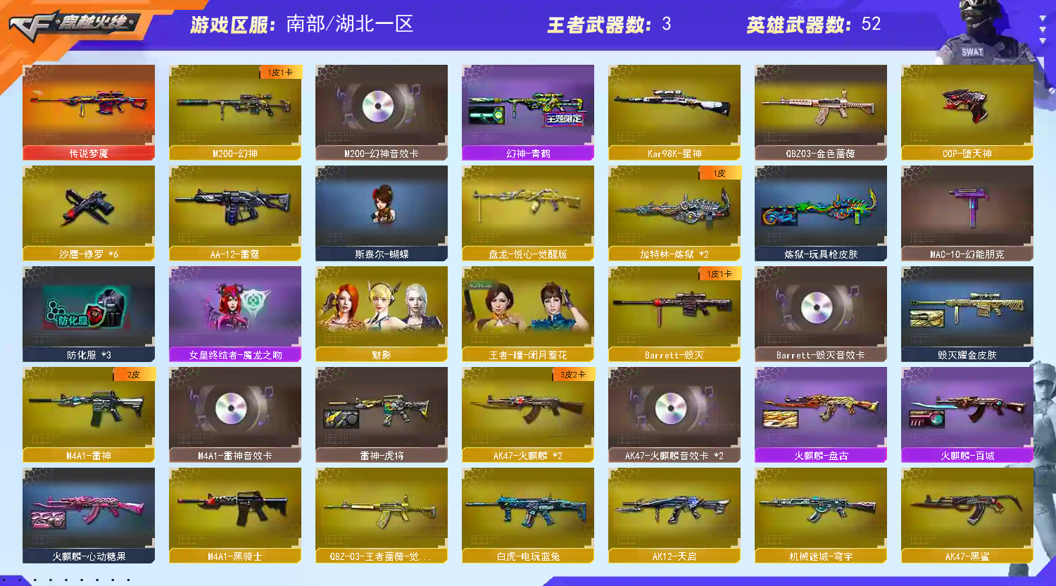 湖北一区、55V、幻神+青鹤皮肤+幻神音效卡/传说梦魇/星神/王者蔷薇/电玩蓝兔/魅影;QBZ03-金色蔷薇,M200-幻神,Kar98K-星神,