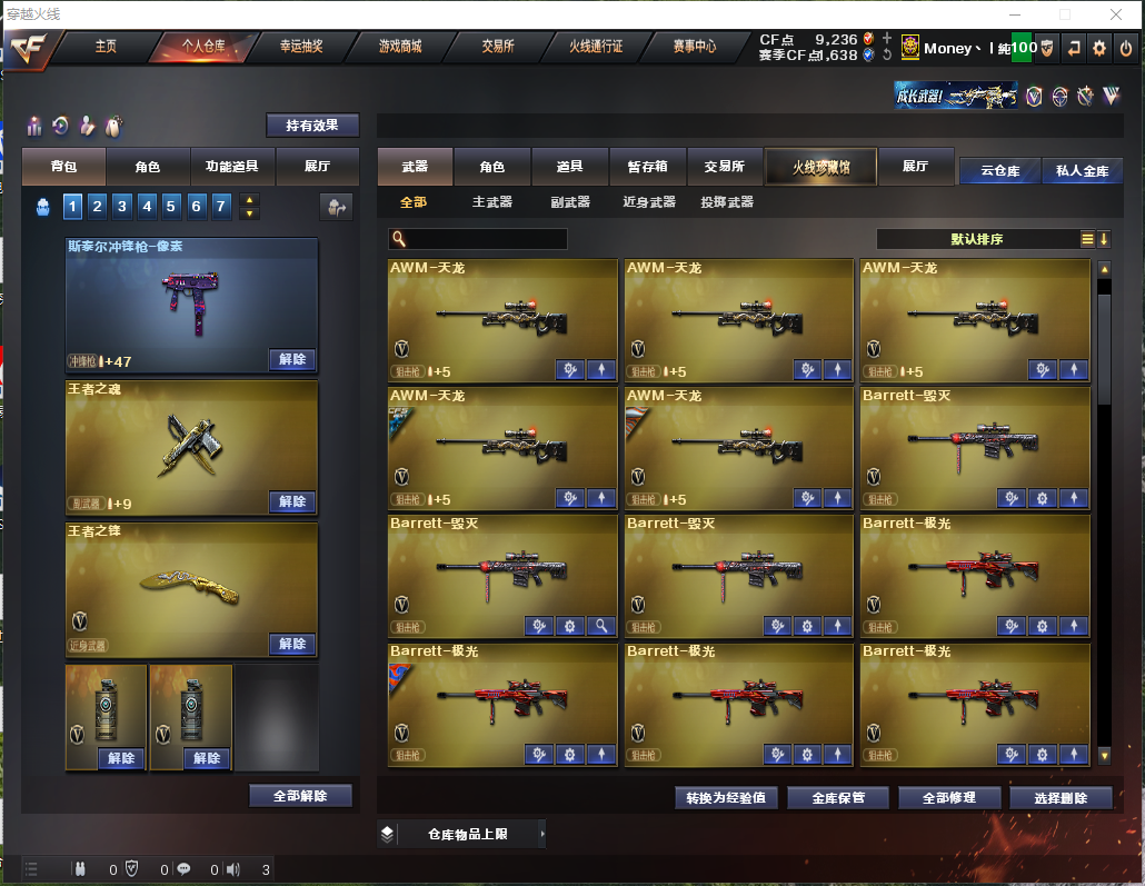 【主武器》②炼狱⑥烈龙⑥盘龙/⑤雷神/③火麒麟/②黑龙/3黑骑士/无影/死神/3黑武士/天启/超新星/武圣/②龙血/2蔷薇qbz/猎神/⑤天龙/③毁灭/⑤极光/蔷薇大炮/暗月传说大炮/AA12雷霆/王者之魄/王者之戮/炫金黑龙/炫金雷神/炫金骑士/③王者之怒/③炫金毁灭/炫金天龙/巨龙咆哮3/激光毁灭者3/死亡之眼/A180蓝色骑士/ 【副武器】COP旗袍/王者之魂/⑦沙鹰修罗/沙鹰天神/武圣手枪/ 【近身武器】尼泊尔雷霆/④屠龙/龙啸/②擎天/②麒麟刺/王者之峰觉醒/黄金生化钩/黄金尼泊尔 【投掷武器】②高爆雷霆+②烟闪/生化手雷机甲核心 【角色】魅影/葵/樱/狐影/空+爆破三防/对讲机/金蛇戒/银蛇戒 【皮肤】天龙star皮肤/修罗star皮肤/火麒麟star皮肤 【音效卡】②毁灭音效卡 【道具】紫金元首/全背包VIP/变异宝贝/疯狂宝贝/灵魂忍者/绿巨人/迷雾幽灵/钩子/防化服/步枪/冲锋枪/机枪/生化弹夹/生化爆破号;RPK-盘龙,QBZ03-金色蔷薇,