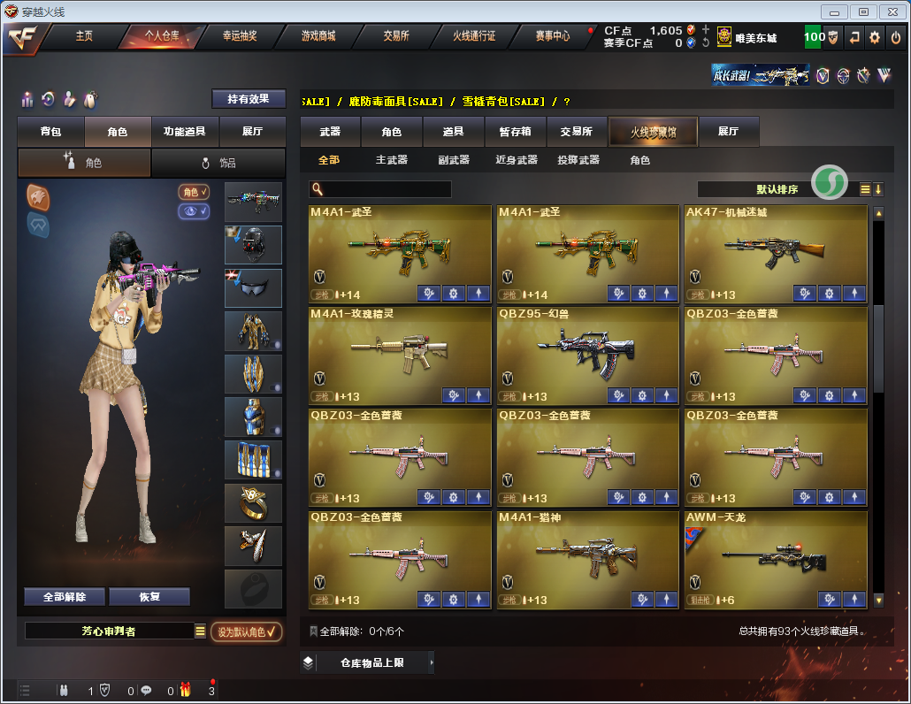 【云南一区-云南】 93V3王者3炫金【主武器类型】 Barrett-毁灭 *3 *3 Barrett-极光 AWM-裁决 M4A1-雷神 *6 *6 QBZ03-金色蔷薇 *5 *5 M4A1-黑龙 M4A1-千变 *2 *2 M4A1-死神 *2 *2 M4A1-猎神 M4A1-武圣 *3 *3 AK47-火麒麟 *4 *4 AK47-无影 *2 *2 AK47-黑武士 *2 *2 AK47-机械迷城 AK12-天启 QBZ95-幻兽 AN94-超新星 汤姆逊-烈龙 *6 *6 RPK-盘龙 *5 *5 加特林-炼狱 AWM-天龙 *3 *3 炫金雷神 炫金黑龙 炫金千变 M4A1-玫瑰精灵 Barrett金色蔷薇 *3 *3 死亡之眼 AK47-B十周年 黄金AK 高爆手雷-幻兽 *5 *5 闪光弹-幻兽 *5 *5 烟雾弹-幻兽 *5 *5 【王者武器】 王者之怒 王者之魂 【副武器类型】 COP-旗袍 沙鹰-修罗 *2 *2 沙鹰-天神 *2 *2 破空枪刃 沙鹰-幻兽 *5 *5 【近身武器类型】 屠龙 *5 *5 龙啸 麒麟刺 擎天 *2 *2 女皇利刃-幻兽 【稀有角色】 王者之瞳 蝴蝶 零 幻影 堕天使 复仇者 透明头盔 超级背包 炫彩背包 【武器皮肤及道具】 雷神-能量核心 毁灭-暗月 黑龙-能量核心 无影-能量核心 天龙-秘银 天龙-能量核心 极光-能量核心 【稀有套装】;RPK-盘龙,QBZ03-金色蔷薇,