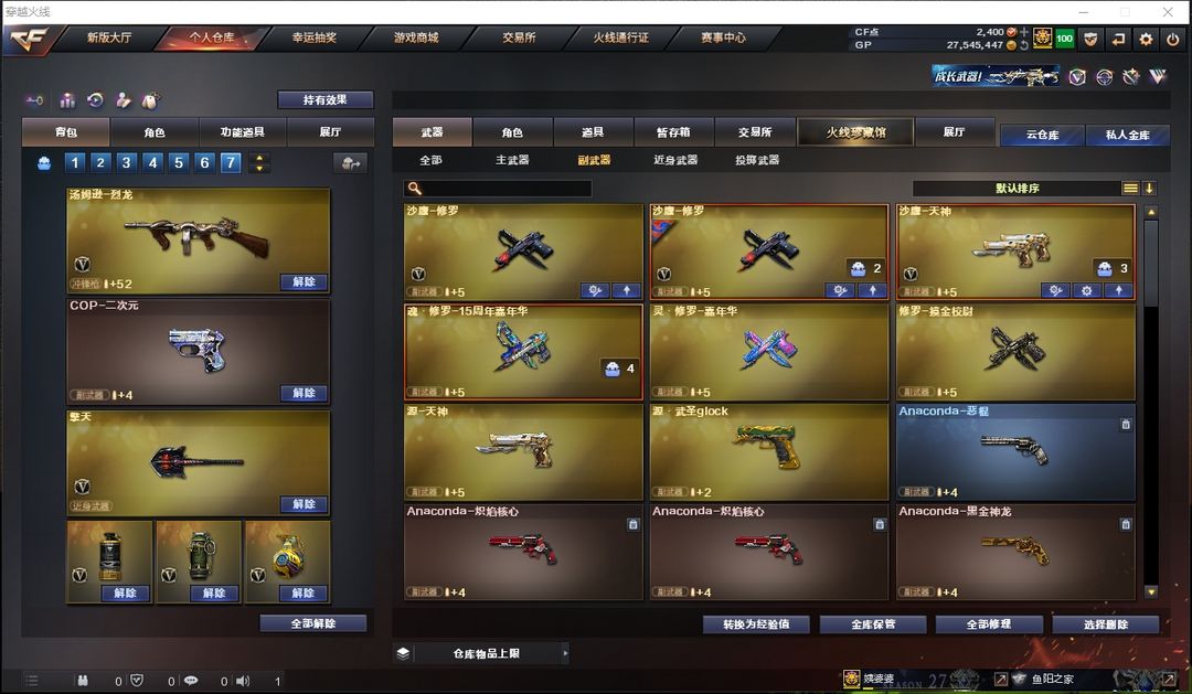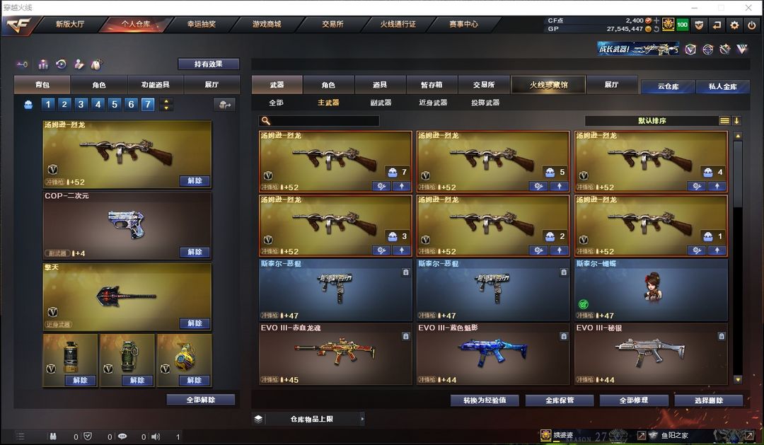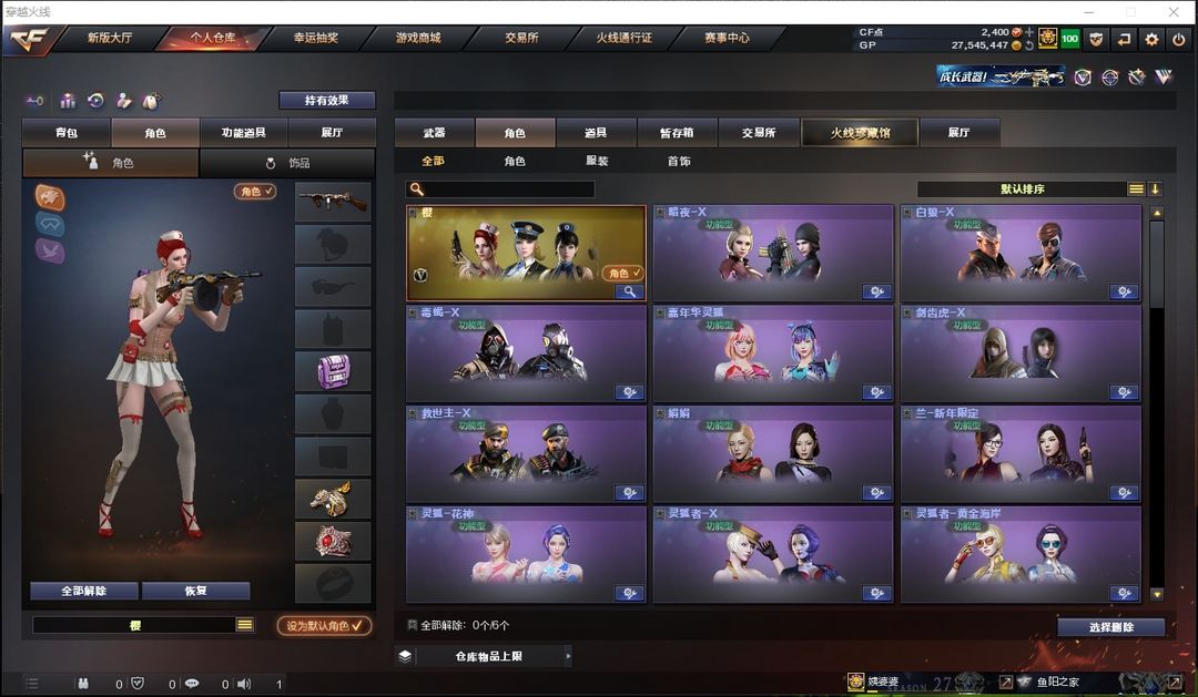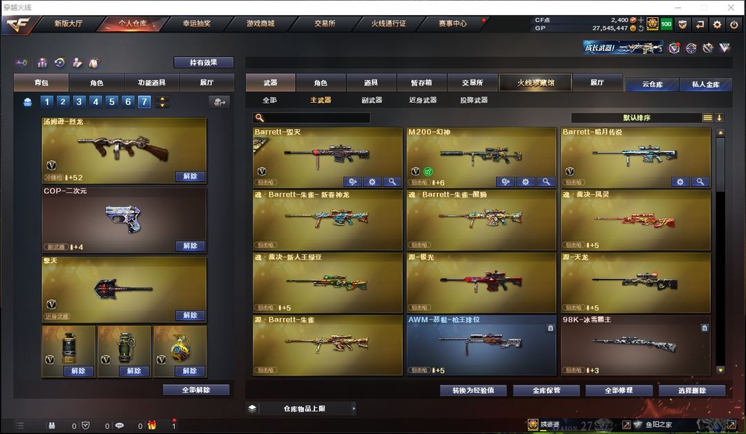 王者武器:炫金雷神;烟雾弹-雷霆王者;闪光弹-雷霆王者;高爆手雷-雷霆王者;王者之啸-觉醒版;闪光弹-雷霆王者-觉醒版;王者炎心 英雄武器:AN94-超新星;M4A1-黑骑士;屠龙;麒麟刺;AK47-火麒麟;Barrett-毁灭;汤姆逊-烈龙;沙鹰-修罗;加特林-炼狱;沙鹰-天神;M4A1-雷神;M4A1-黑龙;M200-幻神;高爆手雷-雷暴;闪光弹-雷暴;烟雾弹-雷暴;斩神刀-雷暴;AK-47-猩红传说;无影-神兵利器;Barrett-暗月传说;QBZ03-金色蔷薇;擎天;AK47-雷暴;AK47-B-常胜将军;AK47-B-身先士卒;闪光弹-幻灵;黑骑士-海王;AK47-B-战士 装饰品:雷神-暗月;黑龙-能量核心;修罗-能量核心;火麒麟-平天大圣;雷神-虎将;火麒麟-心动糖果;黑骑士-摸金校尉;关羽玩偶;AK47-B-常胜将军-曹操;AK47-B-常胜将军-刘备;AK47-B-常胜将军-孙权;毁灭耀金皮肤;毁灭-黑大圣皮肤;魅影玩偶;CFS 击杀图标 角色:金戈;樱;堕天使;复仇者;幻影;雷霆-β;铁骑;飞虎队;猎狐者;曼陀罗;活力灵狐;灵狐者;潜龙队;嘉年华灵狐;木兰;毒蝎-X;灵狐者-黄金海岸;圣诞潘多拉-X;影武者-X;邱刚敖;救世主-X;剑齿虎-X;陈龙野;陈龙野-Y;精英部队;烈锋;猎狐者-X;影武者;白狼-X;代号:翼;新娜塔莎;娟娟;潜龙队-X;剑齿虎;麻雀;社长刀锋;艾比;暗夜-X;灵狐者-职业经理;妲己;灵狐-花神 道具:(极限战斗背包);超级背包;银蛇戒;烟雾保护头盔;闪光护目镜;防弹衣;防弹头盔;手雷包;C4工具钳;防化服;夺命之镰;变异宝贝;灵魂忍者;妖姬;疯狂宝贝;迷雾幽灵;生化弹匣;冲锋枪弹匣;M4A1-雷神音效卡;M4A1-黑骑士音效卡;小萝莉;天使之翼;绿色巨人;黄金头骨护目镜;天使光环;兔子发带;京剧背包;全能枪王黄金面具;QBZ03-金色蔷薇,M200-幻神,