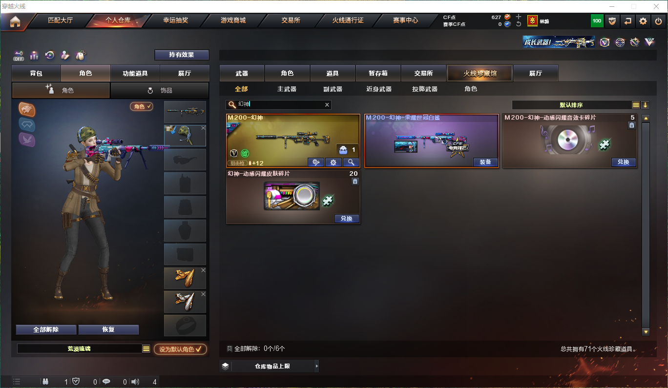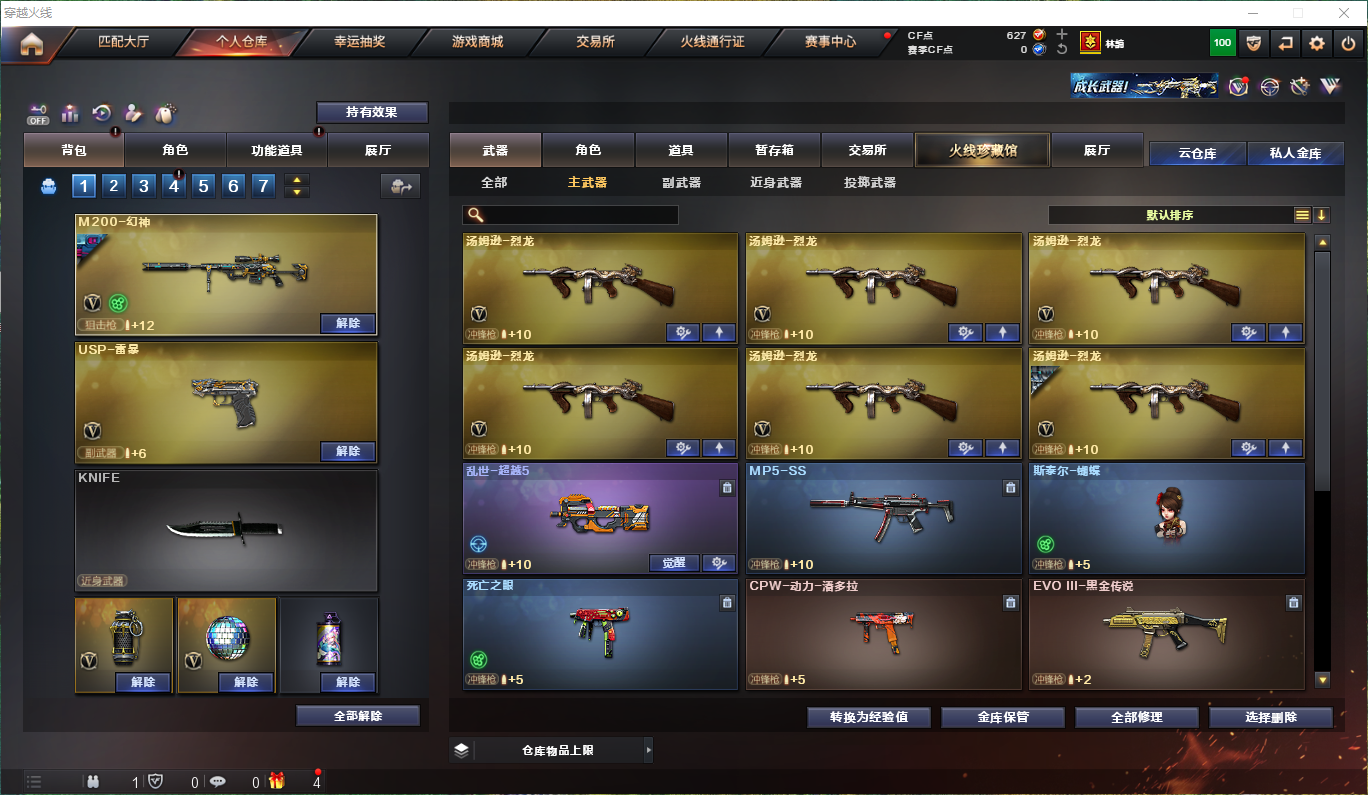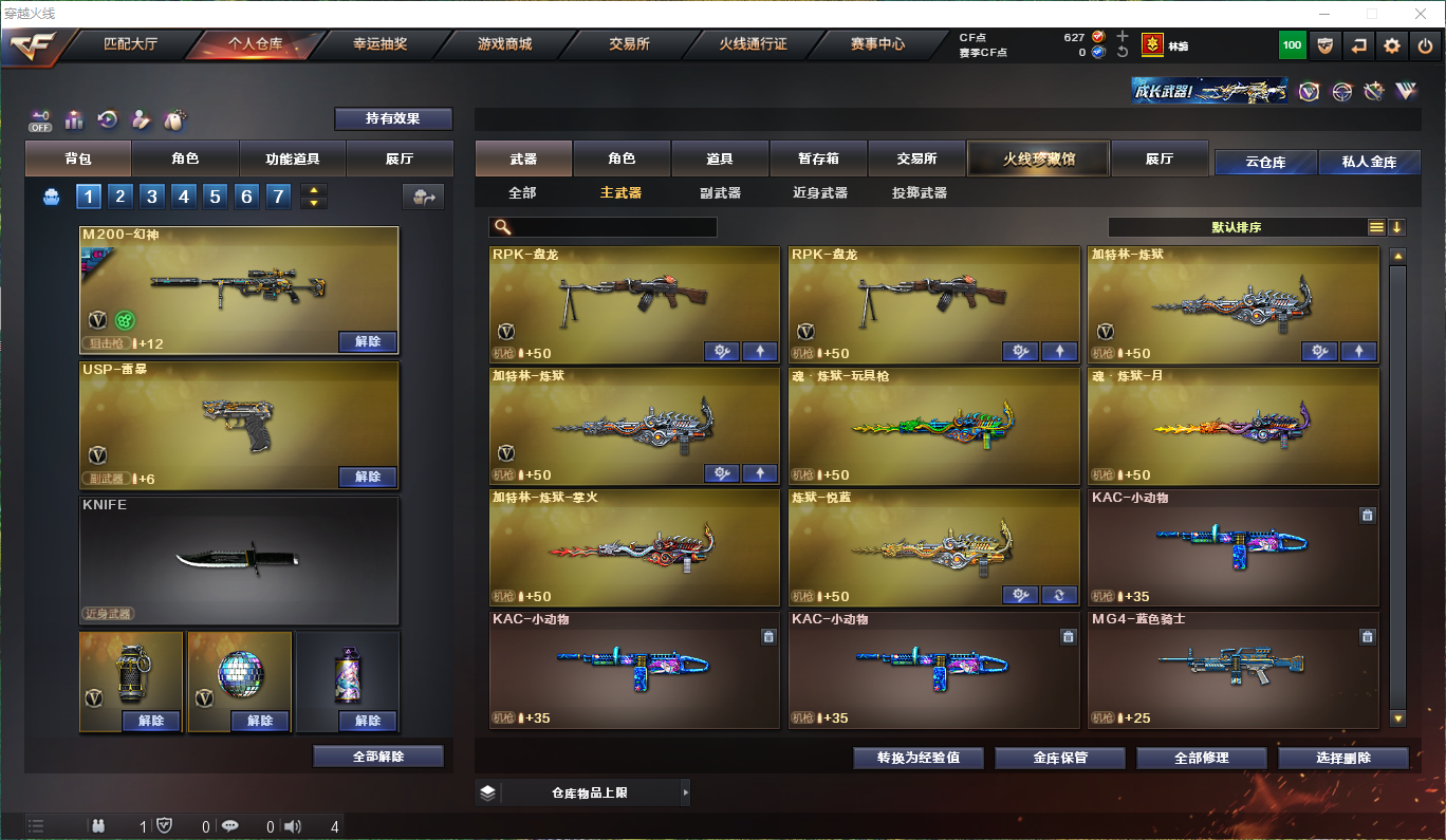 【m200-幻神带幻神-荣耀世冠白鲨】【qbz金色蔷薇×2】【盘龙×2】【炼狱×2】【烈龙×6】【斯泰尔-蝴蝶】【hk417-朱雀】【毁灭×2】【裁决×2】【雷神×3】【barrett-金色蔷薇×2】【usp-雷暴】【屠龙×3】狙击呛:【m200-幻神】【barrett-金色蔷薇×2】【裁决×2】【毁灭×2】【天龙】【王者之怒】步呛:【qbz金色蔷薇×2】【hk417-朱雀】【火麒麟】【黑龙】【雷神×3】【黑骑士】【无影×2】【an94-超新星】【无影-神兵利器】【m4a1-玫瑰精灵】【烈火-动感闪耀】【王者之影--王者之魄--王者之势--王者之翼】机呛:【盘龙×2】【炼狱×2】冲锋呛:【烈龙×6】【斯泰尔-蝴蝶】【死亡之眼】散弹呛:【aa-12-雷霆】手呛:【usp-雷暴】【天神动感闪耀】【王者之魄】刀具:【屠龙×3】【龙啸 擎天 麒麟刺 斩神刀-雷暴 屠龙-动感闪耀 王者之锋】手雷:【雷暴高爆手雷套×4 动感闪耀手雷套 雷暴闪光丹手雷套×4 雷暴盐雾蛋手雷套×4】音效卡:【雷神-动感闪耀音效卡】角色:【荒漠琉璃 葵 樱 乔伊教练 王者复仇】皮肤:【幻神-荣耀世冠白鲨】【雷神-宠儿】【毁灭-荣耀之怒】【雷神-荣耀之魄 雷神-动感闪耀】【黑骑士-冠军之势】;