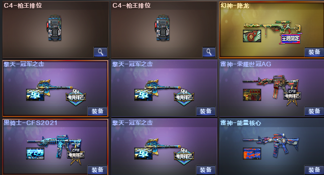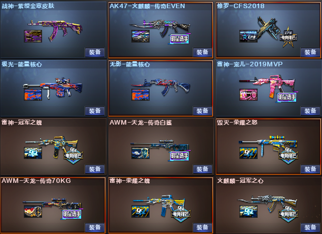 幻神 竞技荣光M200 觉醒白虎之魄/王者芳薇王者蔷薇/QBZ王者蔷薇 COP幻灵x2 柯尔特冠军之特 柯尔特竞技荣光 觉醒COP雷霆王者 雷霆套装x1 夜魔套装x1 幻灵套装x1 竞技荣光套装x2 擎天惨叫迹 角色:关小羽 王者凌霄 鹰 电竞教官云悠悠 灵狐者x 潘多拉x 零水下丽影 音效:黑骑士 毁灭 雷神 皮肤:幻神降龙/黄忠 雷神荣耀之魄/宠儿/冠军之魄/荣耀世冠AG 火麒麟传奇EVEN/AG 毁灭荣耀之怒/星空 擎天冠军之击x3 黑骑士CFS2021 屠龙春桃/荣耀之锋;柯尔特-冠军之特,电竞教官-云悠悠,RPK-盘龙,QBZ03-金色蔷薇,M200-幻神,