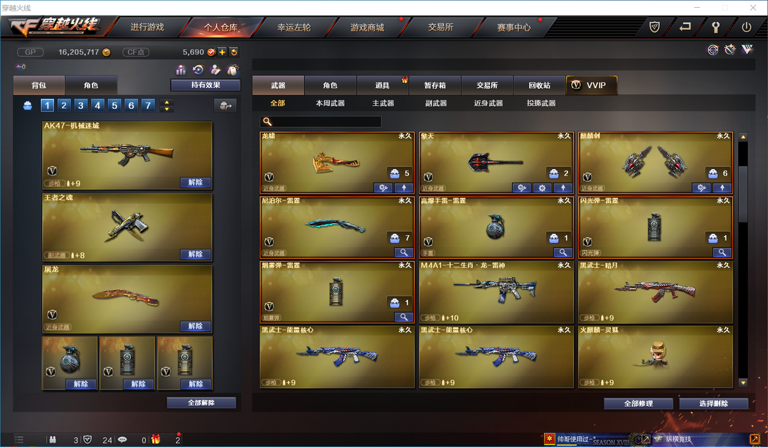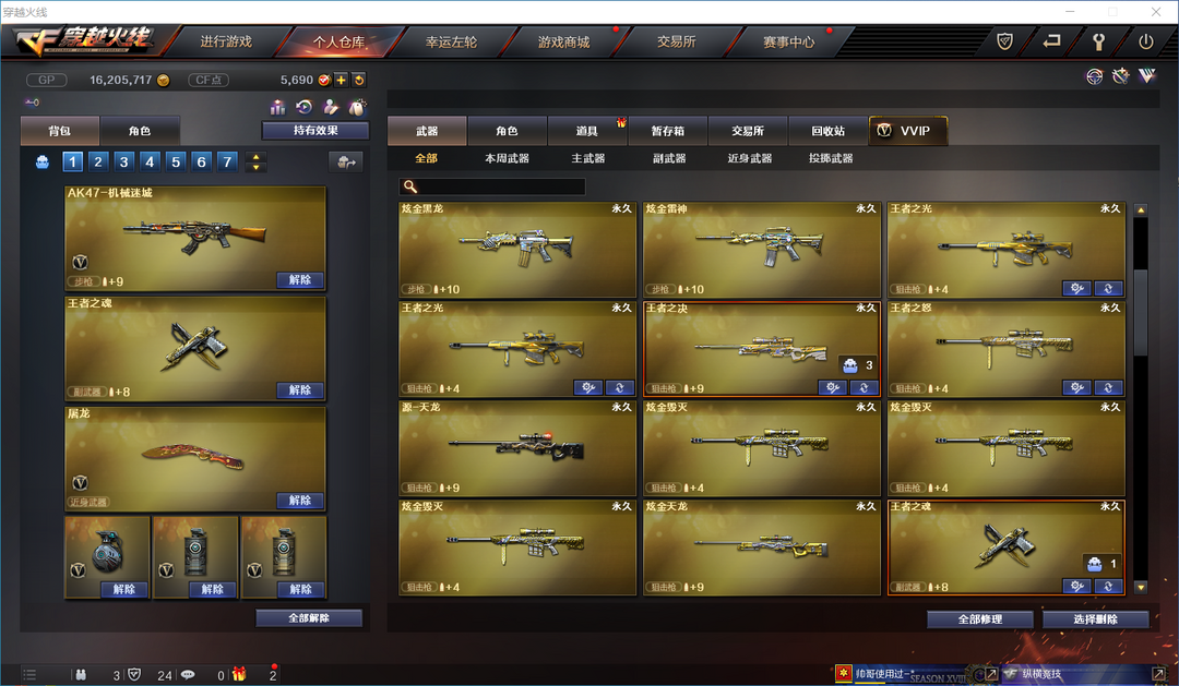 王者武器:炫金天龙;炫金黑龙;炫金雷神;炫金毁灭;王者之怒;王者之光;王者之魂;天启-悦智;王者之心-觉醒版;王者之决;炫金超新星 英雄武器:M4A1-死神;M4A1-武圣;M4A1-黑骑士;AK47-黑武士;屠龙;AK47-机械迷城;龙啸;AK47-无影;麒麟刺;AK47-火麒麟;AWM-天龙;Barrett-毁灭;汤姆逊-烈龙;Barrett-极光;沙鹰-修罗;加特林-炼狱;Glock18-武圣;M4A1-雷神;9A91-烈火;烟雾弹-雷霆;闪光弹-雷霆;高爆手雷-雷霆;AK-47-猩红传说;QBZ03-金色蔷薇;擎天;AWM-裁决;雷霆之锋;M4A1-猎神 主武器:王者之怒;王者之光;天启-悦智;黑武士-暗月;黑武士-能量核心;M4A1-雷神;AK47-黑武士;贝雷塔687-射手座;神罚;乱世;征服者;M240B-苍雷;死亡之眼;AK47-十年火线;AK47-青龙;M4A1-荷鲁斯;源·雷神;巨龙咆哮Ⅲ;源·火麒麟;SPAS-12-卡通;M4A1-十二生肖·龙-雷神;源·青龙;激光毁灭者III;AK47-B-十周年;贝雷塔687-蓝色魅影;HK417-赤血龙魂;黄金Scar-Light;AK47-死亡之翼;G11-暗金;M4A1C-死亡之翼;加特林-蓝水晶;M4A1-水枪;黄金9A91;AK47-牡丹;AK47-齐天大圣;M4A1-樱花;M4A1-秘银赤龙;AK47-三叶草;M14EBR 暗夜;AK47-轮回;黄金QBZ95-A;9A-91-天蝎座;AK47-茉莉;M200-涂鸦;AWM-恶棍-枪王排位;M4A1-战龙;AWM-蓝水晶;黄金AK-47;Barrett-翔龙;M200-圣诞;M4A1-S-银月;红龙AK47;炫金超新星;炫金黑龙;炫金毁灭;炫金雷神;炫金天龙;AK-47黑锋;AWM-2018圣诞;AWM-涂鸦;M200-牡丹;AWM-恶棍;MP7-粉红;P90-迷彩;斯泰尔-赤龙;98K-烛龙;M4A1-S-2018圣诞;AK47-烛龙;QBZ95-烛龙;王者之决;AK-103-甜心;M4A1-SS-枪王排位;M4A1-十年火线;QBZ03-烛龙;源·天龙;M4A1-电音;AWM-灵狐-15周年嘉年华;AK47-绚樱 副武器:王者之魂;胜利之火;Cop357-赤龙;迷你手枪;Anaconda-雷电核心;沙鹰-枪王排位;Desert Eagle-A;RSH-12;沙鹰-青龙;新USP-枪王排位奖励;沙鹰-夜之城;Desert Eagle-S;Anaconda;幻影沙鹰-枪王排位;沙鹰-雷蛇;COP 357-平天大圣;PMR 30-金色豹纹;GLOCK-18;COP357;USP;COP 357-京剧;霓虹左轮-枪王排位;COP 357-万圣节2020;黄金沙漠之鹰;沙漠之鹰-新春特别版;COP 357-牡丹;COP-旗袍;COP-遗迹;USP-新春特别版;MAC-10-涂鸦;Ruger 22 Charger;M66-翔龙;愤怒公牛左轮-枪王排位;COP 357-小白龙 近身:擎天;破天斩魔剑;斩魔刀;金箍棒;丛林匕首;凤凰手斧;金丝匕首;破天灵蛇;扳手;黄金警棍;清刚;青花扇;巨蜥之尾;夺魂;等离切割者;冰火魔兽;军用铁锹-飞龙在天;丛林匕首-枪王排位;鹰爪-暗夜;棒球棒-红色闪电;黄金丛林匕首;唐刀-大唐荣耀;唐刀-盛世太平;啸天;锤子;双龙;丛林匕首-黑虎;激光长刃;伪装;斩神刀;手斧-雷蛇;军用铁锹-赤龙;金砖;扳手-京剧;暗金鹰爪;黄金炒锅;鹰爪-枪王排位;轻型军用手斧-CFS;蝴蝶刀-枪王排位 投掷:胜利之光;激浪烟雾弹;凤凰之息;音乐手雷;双生雷-恶棍;高爆手雷-雷蛇 装饰品:黑龙-暗月;天启-暗月;无影-暗月;天神-暗月;修罗-能量核心;暴躁猪猪玩偶;雷神-星空;关羽玩偶;火麒麟玩偶;雷神-荣耀之魄;毁灭-荣耀之怒 角色:魅影;樱;零;堕天使;复仇者;幻影;雷霆-β;铁骑;潘多拉;刀锋;灵狐者;嘉年华灵狐;救世主;王力宏;圣诞潘多拉-X;影武者-X;救世主-X;剑齿虎-X;陈龙野-Y;猎狐者-X;斯沃特精英;樱-缤纷夏日;王者-零 道具:(王者之魄金色光效);(王者之心金色光效);(M4A1-雷神蓝粉色光效);(M4A1-雷神紫橙光效);超级背包;炫彩背包;银蛇戒;烟雾保护头盔;防弹衣;防弹头盔;手雷包;C4工具钳;防化服;夺命之镰;变异宝贝;生化弹匣;步枪弹匣;Barrett-毁灭音效卡;M4A1-黑骑士音效卡;变相怪杰;QBZ03-金色蔷薇,