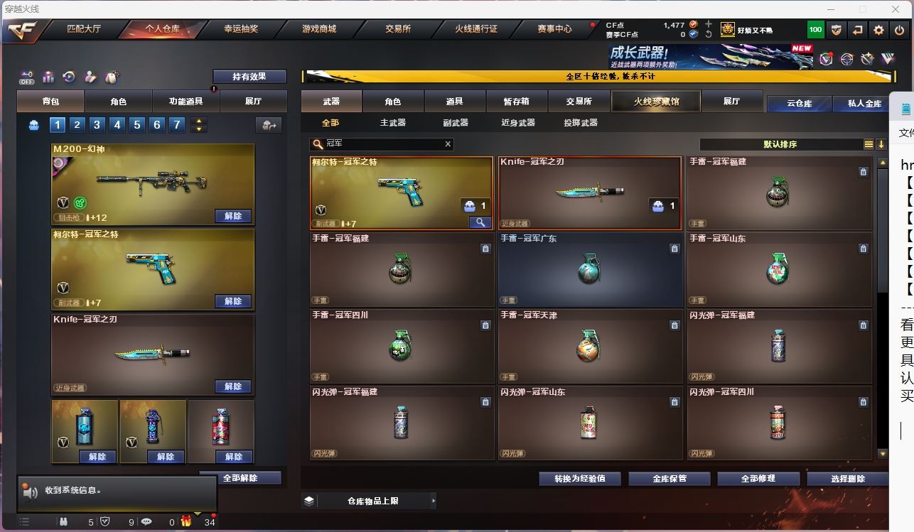 【亮点解析 幻神三件套 冠军套】【m200幻神+音效卡+巅峰荣耀+宠儿+冠军之特+冠军之刃】【m200竞技荣光】【王者星神】【scar白虎+热带奇洋】【qbz金色蔷薇+卡+冠军之薇+ag19冠军】【火麒麟+even+冠军之心】【黑龙+卡】【雷神+卡+荣耀之魄+n9+白鲨冠军】【黑骑士+卡】【毁灭+卡+冠军之怒+ag15冠军+cfs2018】【极光+卡】【裁决+巅峰荣耀】 【武器:王者之心 王者之翼 白虎电玩蓝兔 炼狱】 【8手枪:修罗*2 天神*2 云龙*3 】 【7刀具:屠龙 斩神刀雷暴 竞技荣光 云龙扇 王者玉锋 】 【3雷套:雷暴雷 竞技荣光雷*2】 【小人枪:cop白鲨】 【音效卡:黑龙音效卡 毁灭音效卡 黑骑士音效卡 幻神音效卡 金色蔷薇音效卡 雷神音效卡 极光音效卡 】 【四防角色:王者迷迭香 王者瞳闭月羞花 女主播 】;柯尔特-冠军之特,Knife-冠军之刃,QBZ03-金色蔷薇,M200-幻神,Scar Light-白虎,