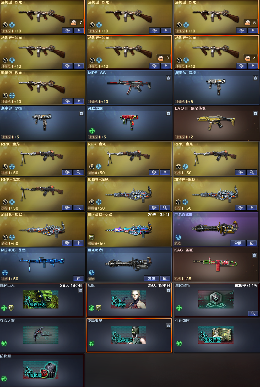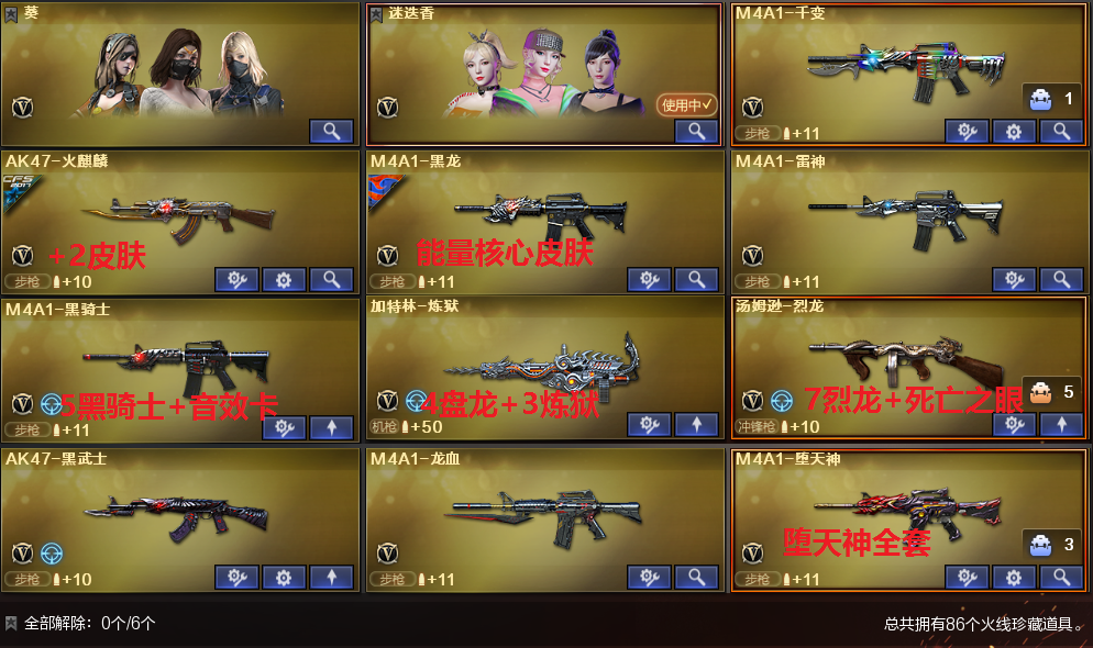 生化性价比✅7烈龙死亡之眼+4盘龙3炼✅堕天神全套✅5黑骑士+音效卡✅葵✅猫猫手套 稀有武器:烈龙X7+斯泰尔恶棍+死亡之眼、盘龙X4+炼狱X3、M4堕天神、千变、火麒麟(雷神皮肤、CFstar皮肤)、黑龙(能量核心皮肤)、雷神(暗月皮肤)、黑骑士X5(黑骑士音效卡)、无影(能量核心皮肤)、黑武士、龙血、玫瑰精灵、9A烈火、超新星悦享、天龙X2、毁灭X2、极光(能量核心皮肤)、暗月传说、A12雷霆、修罗X4、天神、COP堕天神、屠龙X2、龙啸、擎天X2、麒麟刺X2、尼泊尔雷霆、麒麟刺堕天神、龙啸堕天神、炫金黑龙、王者之怒、冰龙粉碎者、激光毁灭者3白马银枪、巨龙咆哮者3、神圣爆裂者3、征服者超越2、阐释者3、巴雷特零水下丽影、MAC10涂鸦、猫猫手套 稀有角色:葵、迷迭香、暗夜X、救世主X、空、兰新年限定、灵狐者黄金海岸、龙儿小淘气、潘多拉X、潜龙队X、圣诞潘多拉、蜀雪、铁骑荣耀、新娜塔莎、影武者X 投掷套装:雷霆套、堕天神套X5、音乐手雷、双生雷恶棍;RPK-盘龙,