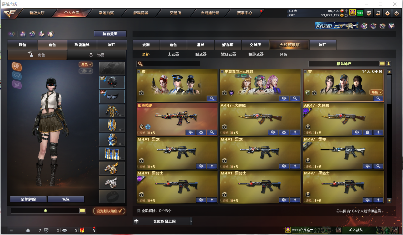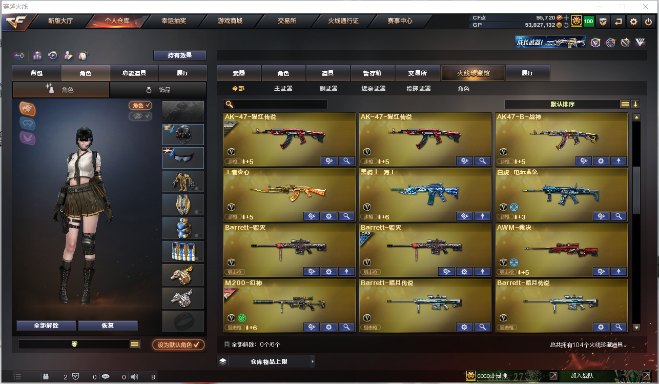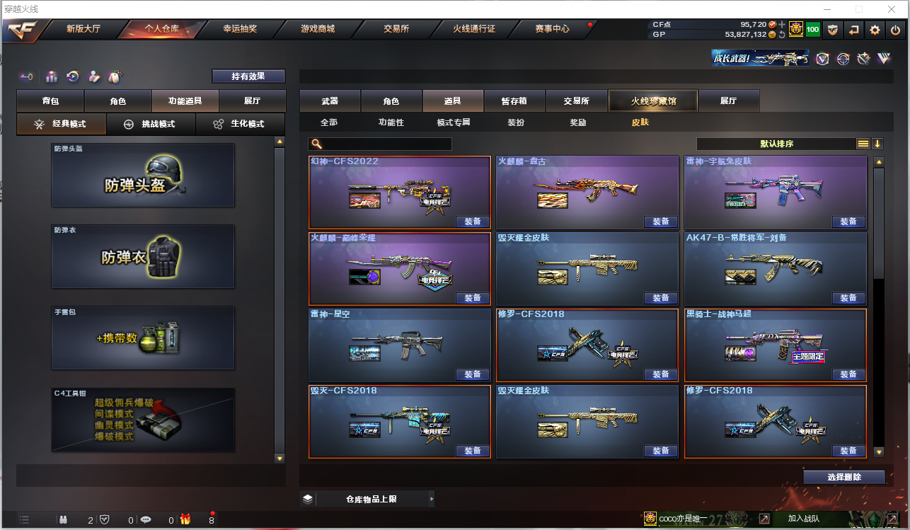 【角色】电竞教官-云悠悠,王者-葵-貂蝉,王者凌霄,樱, 【主武器】传说暗裔,m200-幻神,AK47-火麒麟,M4A1-黑龙,M4A1-雷神,M4A1-黑骑士,AK47-黑武士,AN94-超新星,AK47-黑鲨,HK417-朱雀,Scar Linght-白虎,无影-神兵利器, HK417-朱雀,QBZ03-金色蔷薇,AK47-猩红传说,AK47-B-战神,黑骑士-海王红,白虎-电玩蓝兔,Barrett-毁灭。AWM-裁决,Barrett- 暗月传说,RPK-盘龙*8、加特林-炼狱*3.汤姆逊-烈龙*6.死亡之眼,斯泰尔-蝴蝶,AA-12-雷霆。王者炎心,王者之心,王者之影,王者之势, 【副武器】沙鹰-修罗,USP-雷暴,柯尔特-电竞装甲,USP-雷暴, 【近身武器】屠龙,龙啸,擎天,麒麟刺,斩神刀-雷暴,擎天-竞技荣光,王者之锋,王者之击, 【投掷武器】雷暴套,电竞装甲套,竞技荣光套, 【音效卡】M4A1-雷神音效卡,Barrett-极光音效卡, 【皮肤】幻神-cfs2022,火麒麟-盘古,雷神-宇航兔皮肤,火麒麟-巅峰荣耀,毁灭耀金皮肤,AK47-B-常胜将军-刘备,雷神-星空,修罗-cfs2018,黑骑士-战神马超。毁灭-cfs2018.毁灭耀金皮肤,修罗-cfs2018.火麒麟-心动糖果,修罗-cfs2018、;USP-雷暴,电竞教官-云悠悠,RPK-盘龙,QBZ03-金色蔷薇,M200-幻神,Scar Light-白虎,传说暗裔,