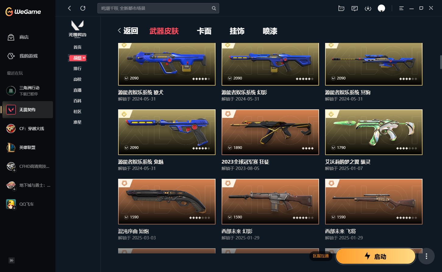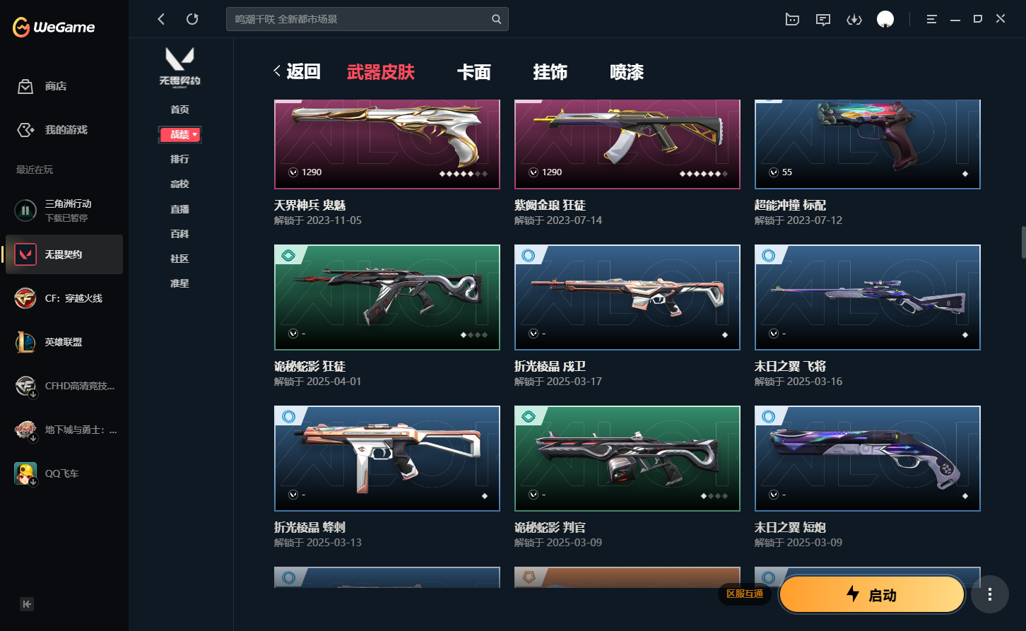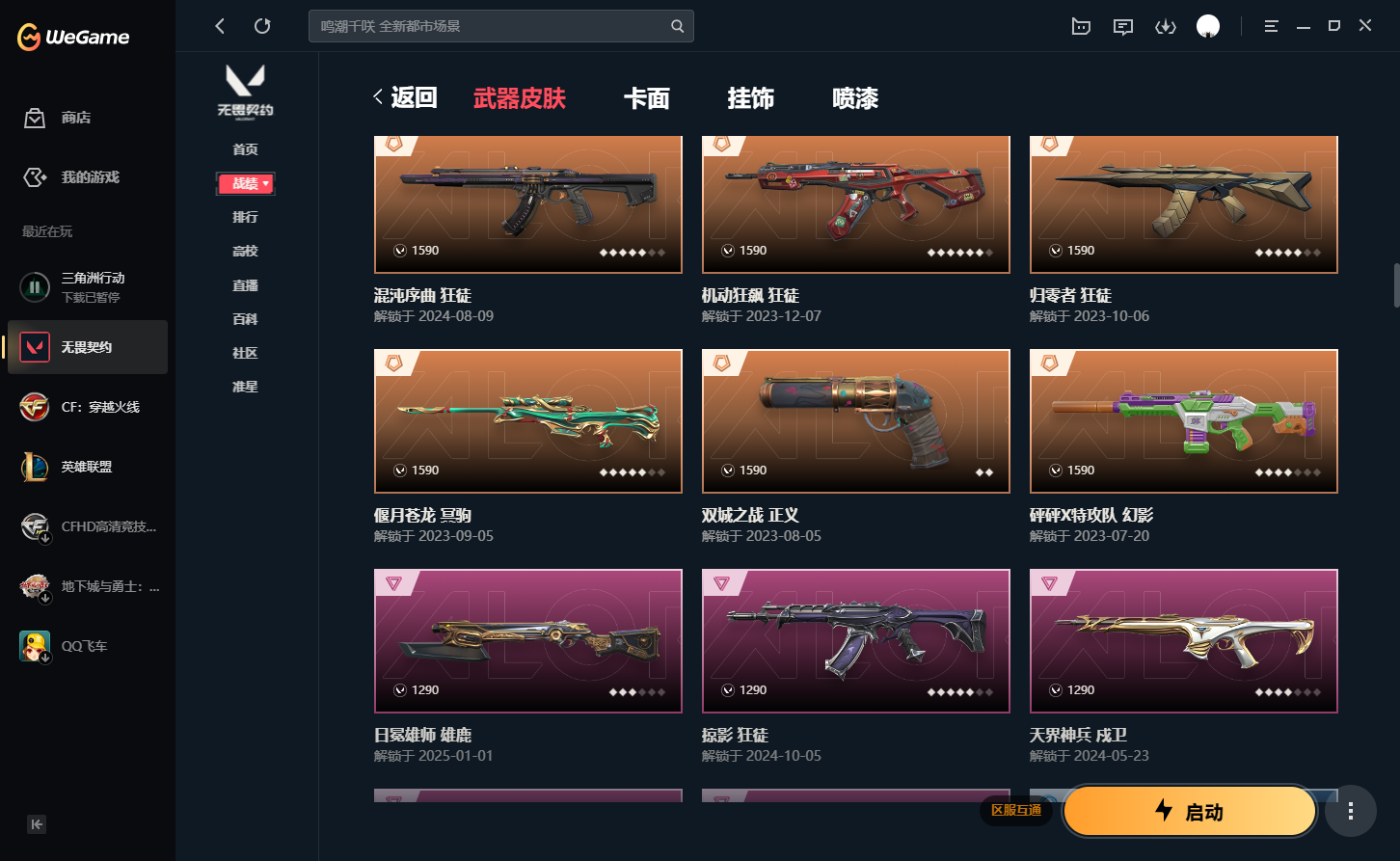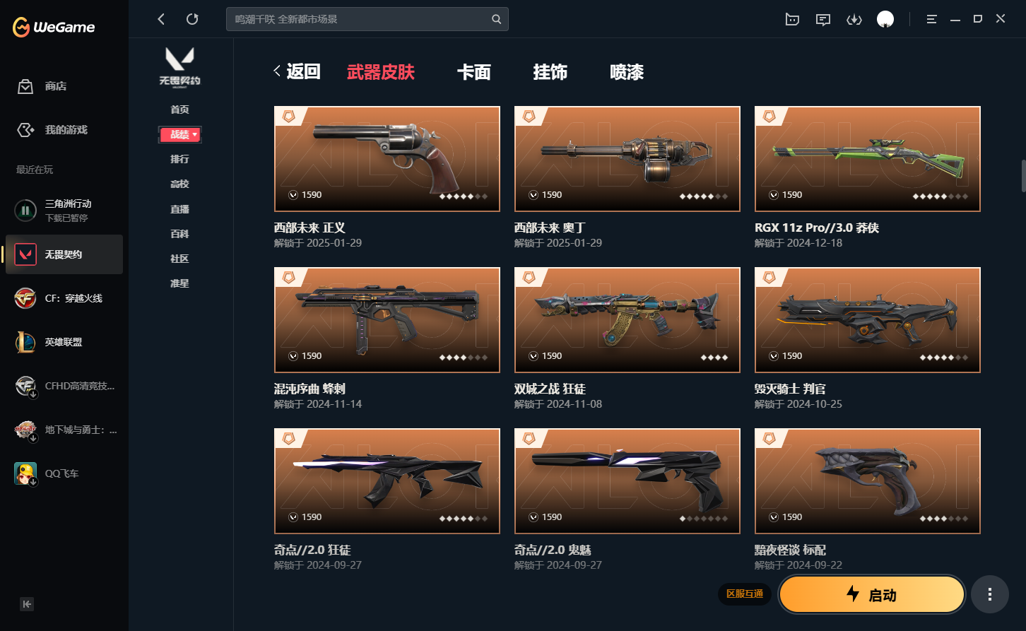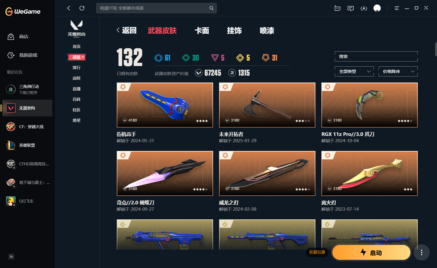 wegame无畏契约★132皮 31限定 离火刃 街机高手 未来开拓者 RGX 3.0爪刀 奇点2.0蝴蝶刀 威龙之刃 源能者娱乐系统套装 西部未来套装 双城之战狂徒 奇点2.0套装 毁灭骑士判官 更多精品皮肤等你来使用