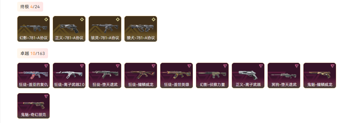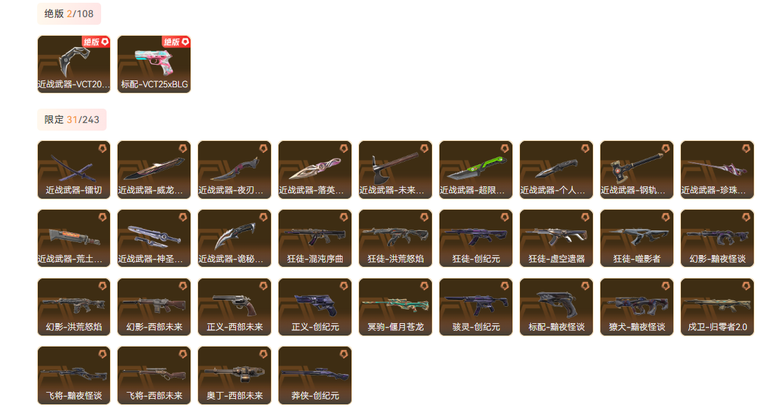 wegame无畏契约★ 刀皮数量13,枪皮数量114(绝版2限定33终极4卓越10);皮肤资产价值76720,已用R点1360;【刀皮】:近战武器-VCT202