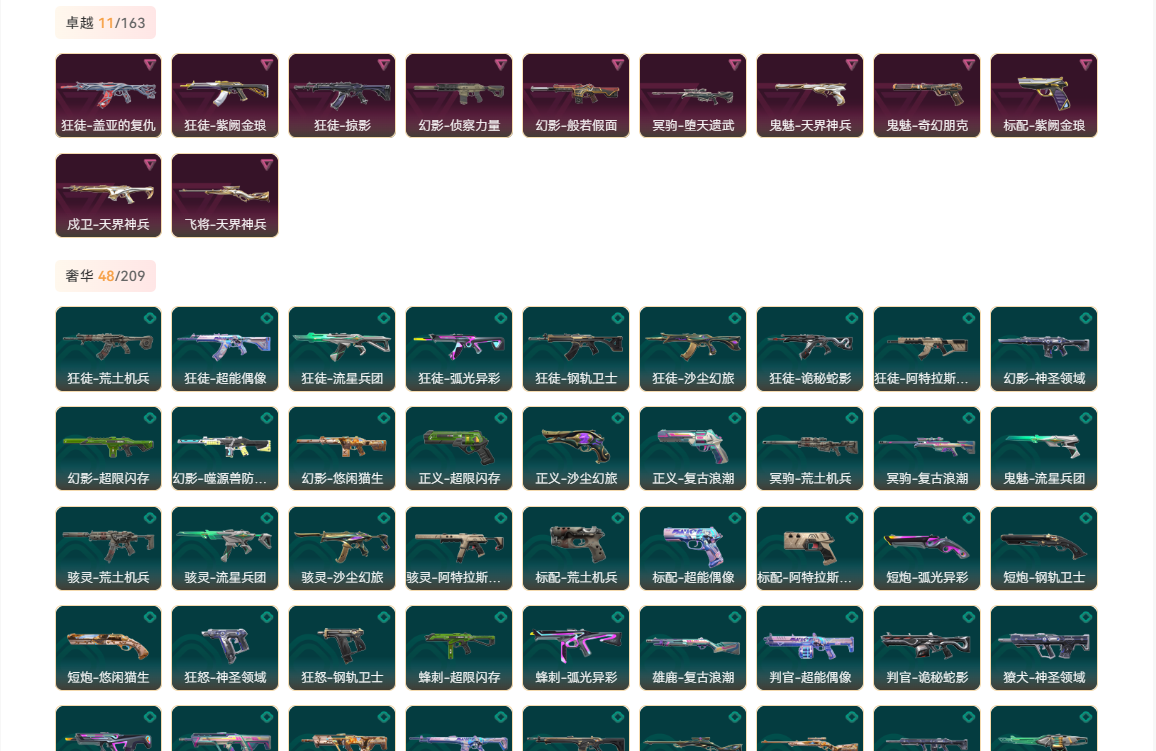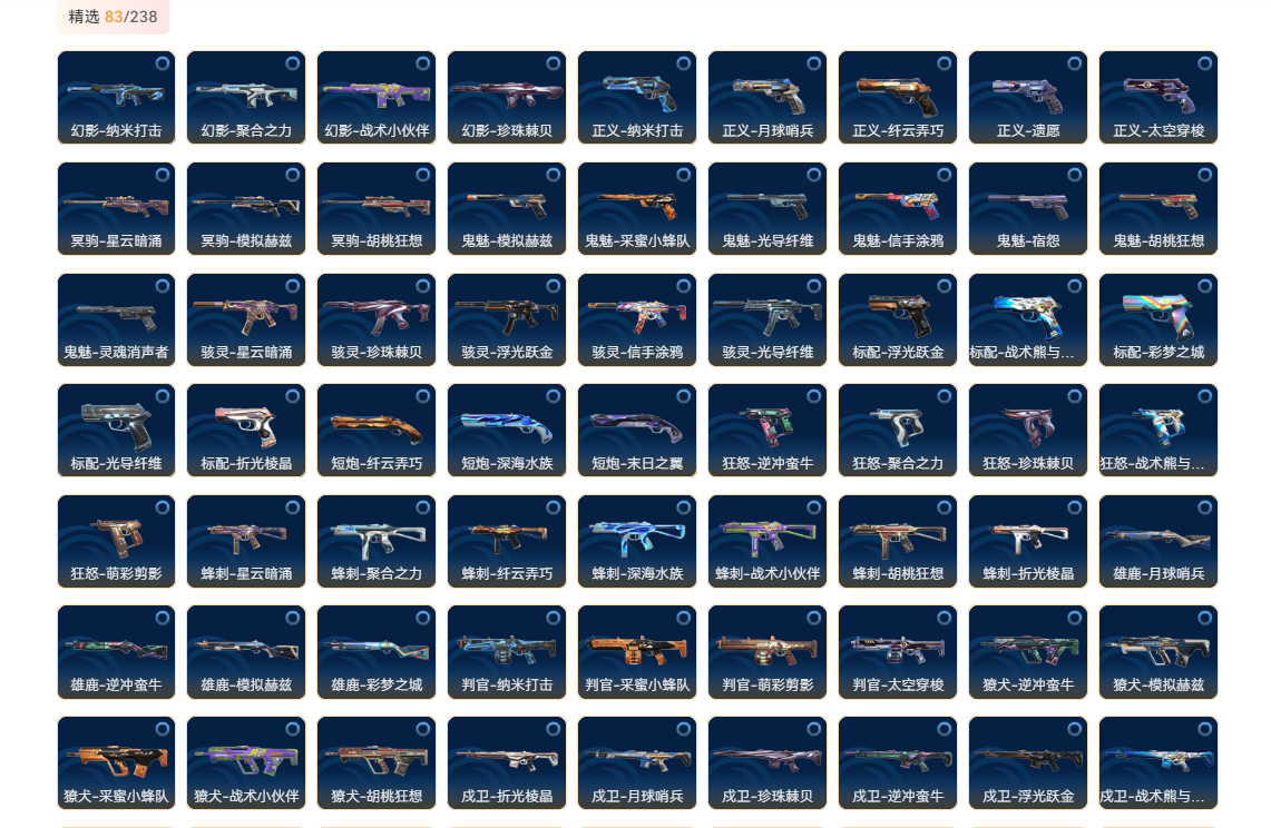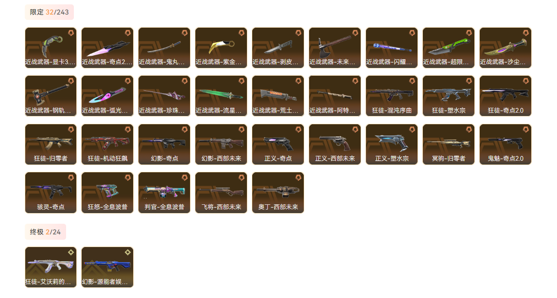 wegame无畏契约★刀皮数量15,枪皮数量161(绝版0限定32终极2卓越11);【刀皮】:近战武器-显卡3.0爪刀,近战武器-闪耀之星荧光棒,近战武器-鬼丸国纲,近战武器-剥皮小刀,鬼魅-奇点2.0,正义-奇点,正义-塑水宗,正义-西部未来,狂怒-全息波普,骇灵-奇点,判官-全息波普,狂徒-奇点2.0,狂徒-塑水宗,狂徒-机动狂飙,狂徒-归零者,狂徒-混沌序曲,幻影-奇点,幻影-西部未来,冥驹-归零者