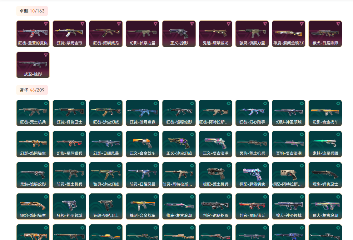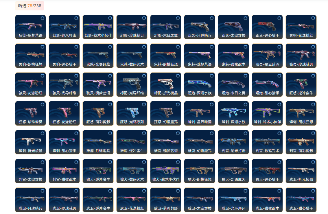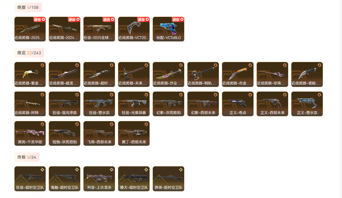 wegame无畏契约★刀皮数量13,枪皮数量153(绝版5限定27终极5卓越10);近战武器-2025全球冠军赛蝴蝶刀,近战武器-2024全球冠军赛战刀,近战武器-VCT2025爪刀,近战武器-紫金爪刀,近战武器-威龙之刃,近战武器-沙尘幻旅匕首,近战武器-钢轨卫士战锤,标配-VCTxBLG,狂徒-2025全球冠军赛,正义-奇点,正义-塑水宗,正义-西部未来,短炮-洪荒怒焰,狂徒-塑水宗,狂徒-混沌序曲,狂徒-光荣异象,幻影-洪荒怒焰
