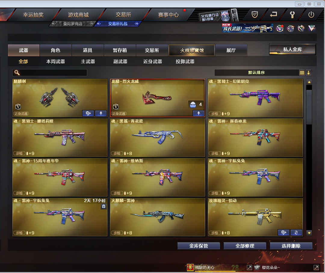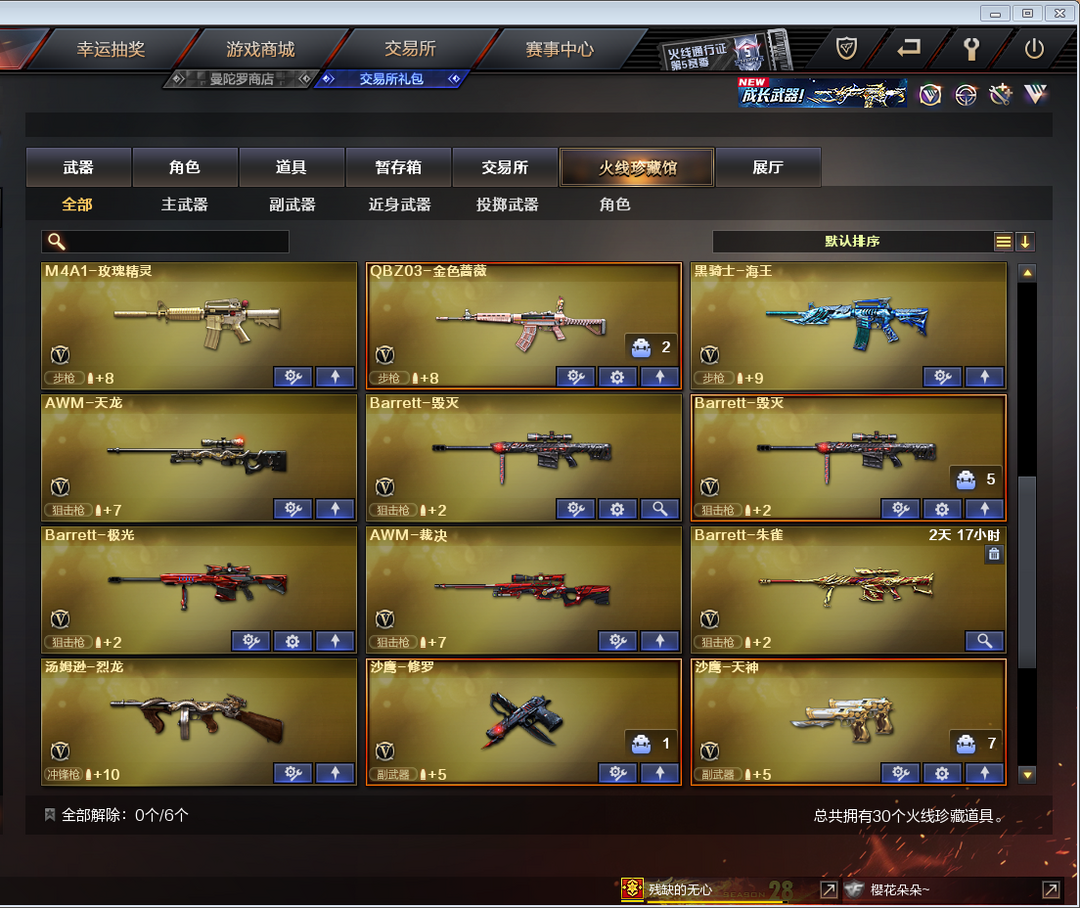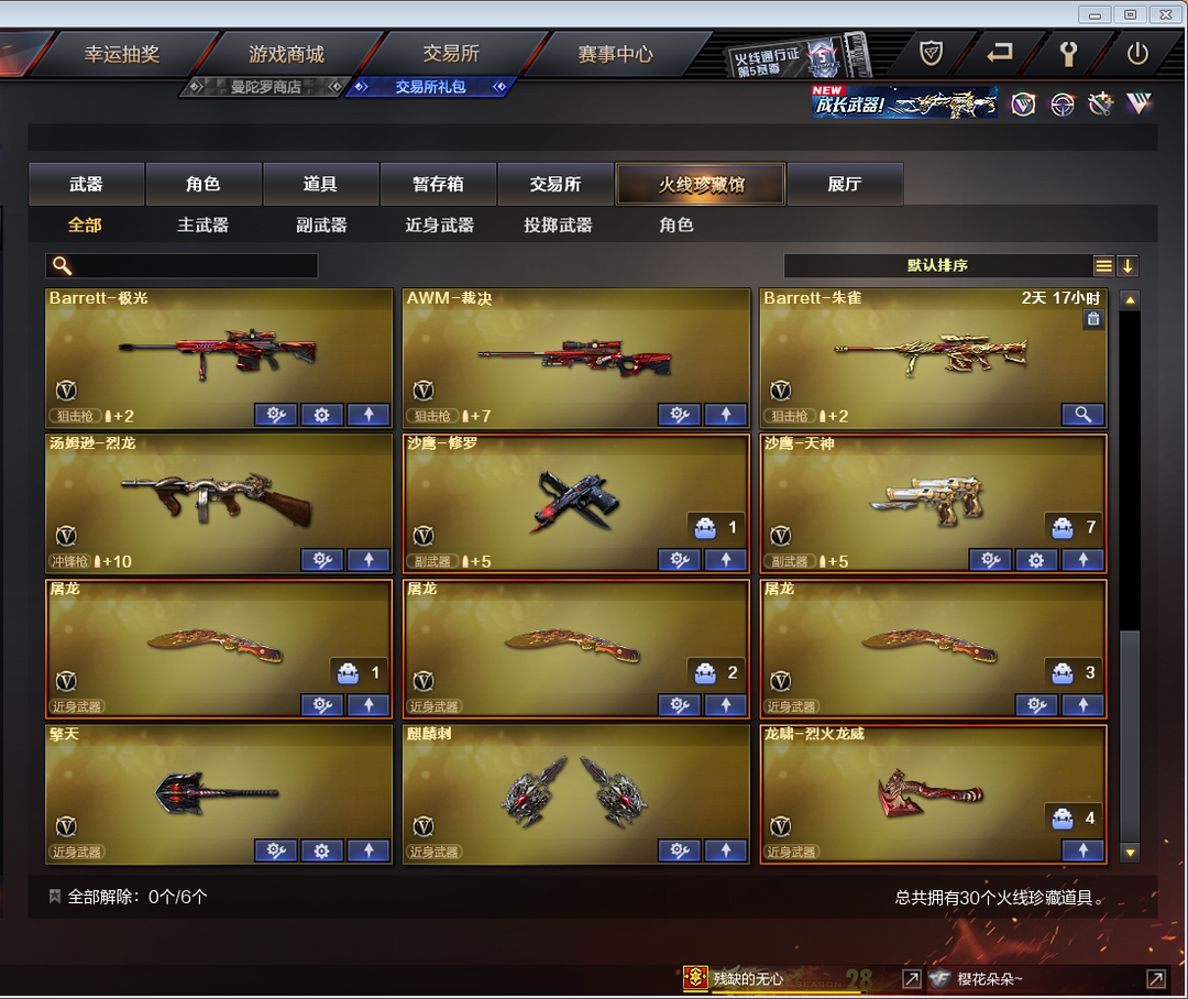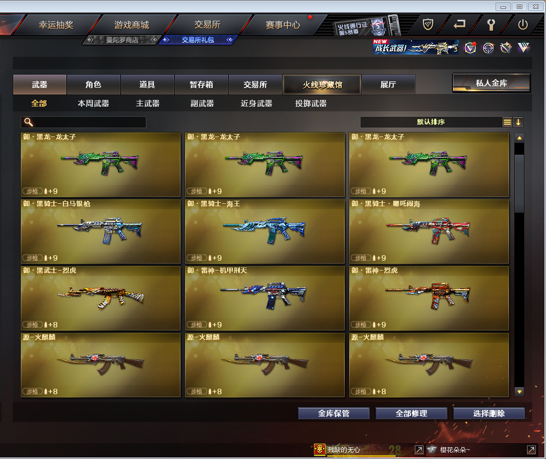 传奇2【王者武器】:【烈龙-悦心-1,王者之怒-1,玫瑰精灵-悦动-1】 【英雄武器】:【M4A1-死神-1,M4A1-黑骑士-1,M4A1-玫瑰精灵-2,AK47-黑武士-1,屠龙-3,麒麟刺-1,AK47-火麒麟-1,AWM-天龙-1,Barrett-毁灭-2,汤姆逊-烈龙-1,Barrett-极光-1,沙鹰-修罗-1,沙鹰-天神-1,M4A1-雷神-1,M4A1-黑龙-1,M200-竞技荣光-1,擎天-竞技荣光-1,柯尔特-竞技荣光-1,烟雾弹-竞技荣光-8,闪光弹-竞技荣光-7,高爆手雷-竞技荣光-7,QBZ03-金色蔷薇-1,黑武士-锦绣游龙-1,擎天-1,AWM-裁决-1,龙啸-烈火龙威-1】 【装饰品】:【黑龙-能量核心-1,曼陀罗玩偶-1】 【角色】:【葵,堕天使,复仇者,铁骑,飞虎队,猎狐者,潘多拉,黑鹰,夜玫瑰,活力灵狐,灵狐者,嘉年华灵狐,木兰,救世复仇,威锋,救世主,王力宏,电竞教官-云悠悠,圣诞潘多拉-X,救世主-X,精英部队,猎狐者-X,猎狐者-英特尔,斯沃特精英,娜塔莎,新斯沃特-英特尔,妲己】 【道具】:【炫彩背包-1,金蛇戒-1,银蛇戒-1,闪光护目镜-1,防弹衣-1,防弹头盔-1,手雷包-1,C4工具钳-1,防化服-1,夺命之镰-1,步枪弹匣-1,变相怪杰-1,兔子发带-1,大圣头盔-1】;电竞教官-云悠悠,QBZ03-金色蔷薇,