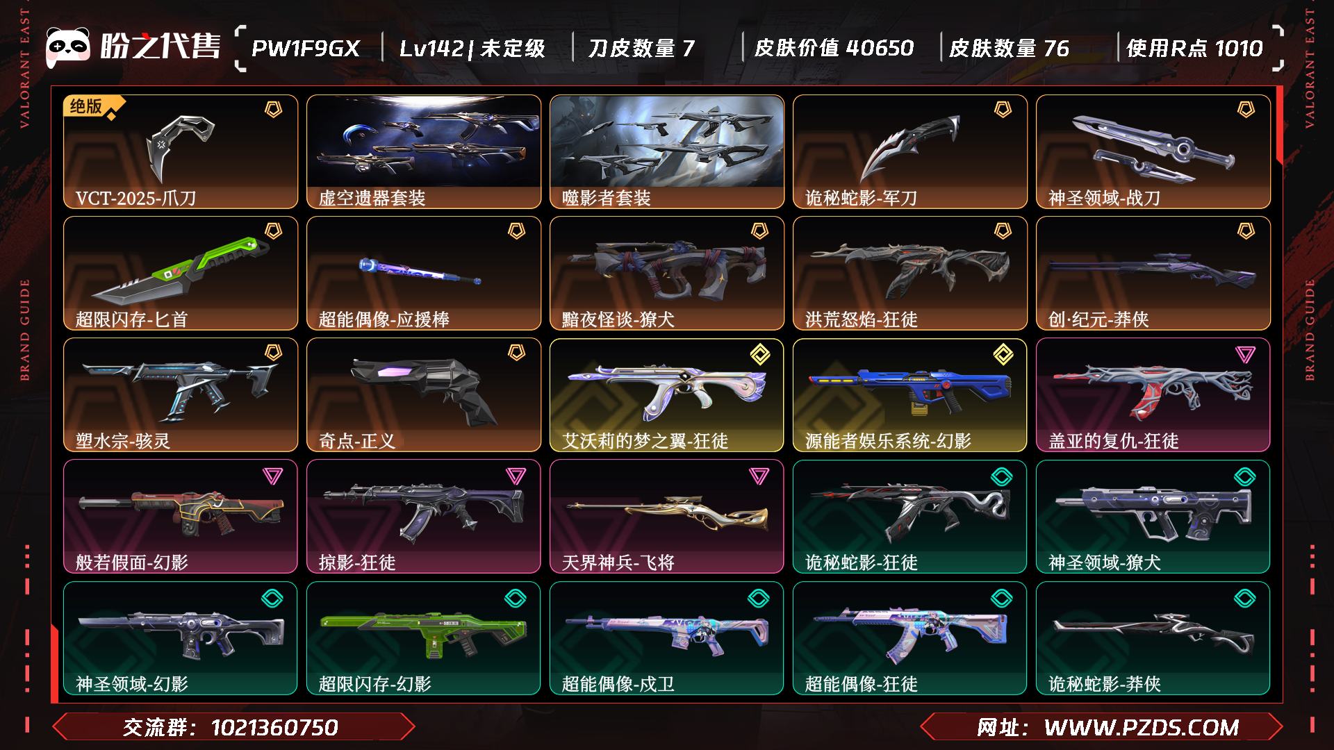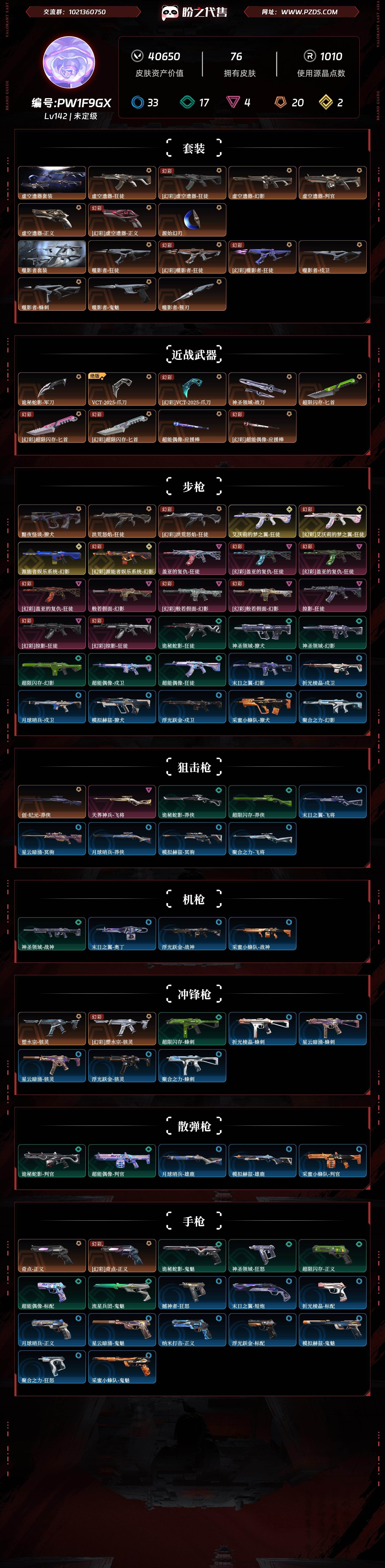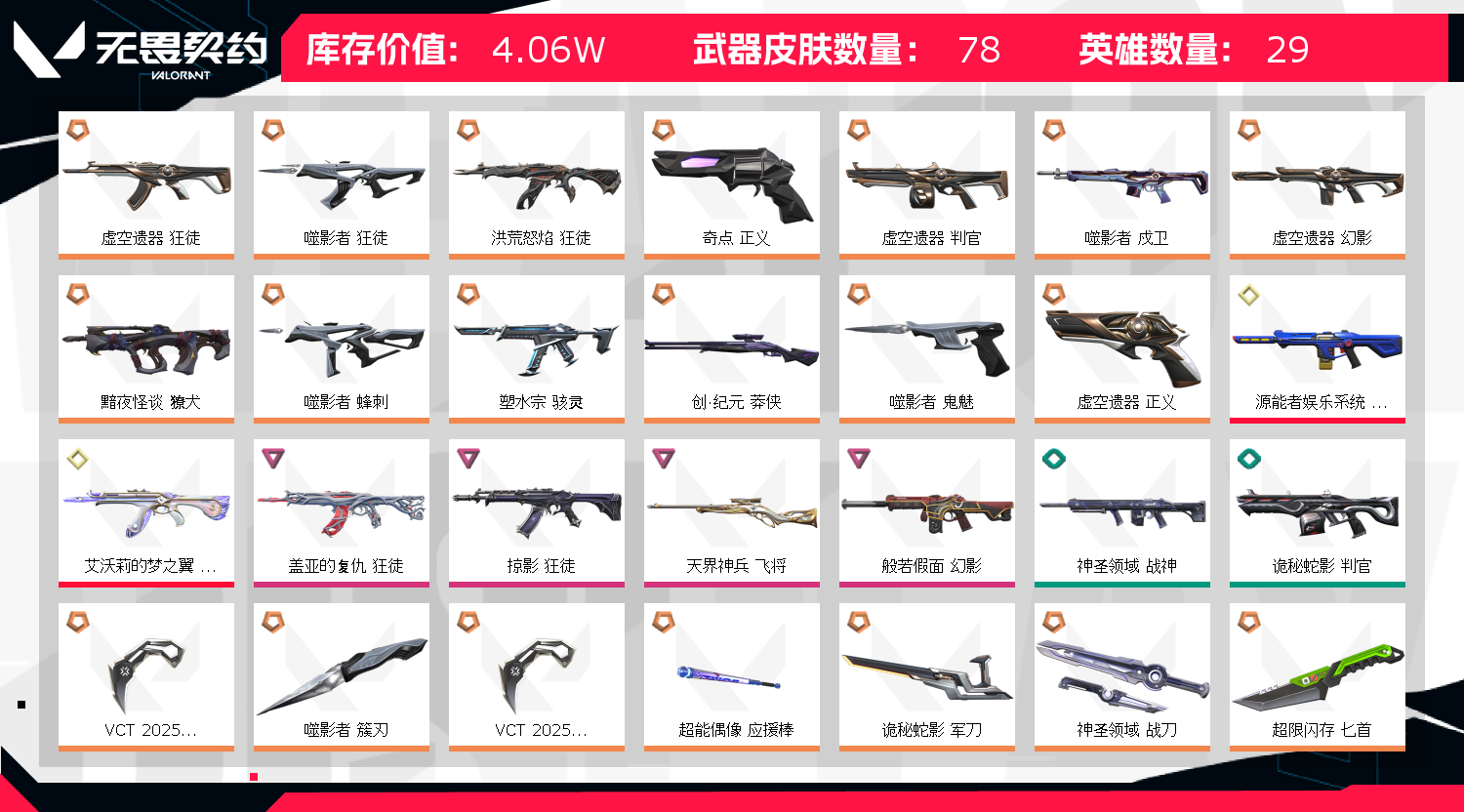 【皮肤资产价值】40650 【使用R点】1010 【英雄数量】27 【皮肤数量】76 【卡面数量】113 【喷漆数量】91 【挂件数量】78 【拥有套装】虚空遗器套装(虚空遗器-狂徒,虚空遗器-幻影,虚空遗器-判官,虚空遗器-正义,源始幻刃)噬影者套装(噬影者-狂徒,噬影者-戍卫,噬影者-蜂刺,噬影者-鬼魅,噬影者-簇刃) 【拥有近战武器】诡秘蛇影-军刀,VCT-2025-爪刀,神圣领域-战刀,超限闪存-匕首,超能偶像-应援棒, 【拥有步枪】黯夜怪谈-獠犬,洪荒怒焰-狂徒,艾沃莉的梦之翼-狂徒,源能者娱乐系统-幻影,盖亚的复仇-狂徒,般若假面-幻影,掠影-狂徒,诡秘蛇影-狂徒,神圣领域-獠犬,神圣领域-幻影,超限闪存-幻影,超能偶像-戍卫,超能偶像-狂徒,末日之翼-幻影,折光棱晶-戍卫,月球哨兵-戍卫,模拟赫兹-獠犬,浮光跃金-戍卫,采蜜小蜂队-獠犬,聚合之力-幻影, 【拥有狙击枪】创·纪元-莽侠,天界神兵-飞将,诡秘蛇影-莽侠,超限闪存-莽侠,末日之翼-飞将,星云暗涌-冥驹,月球哨兵-莽侠,模拟赫兹-冥驹,聚合之力-飞将, 【拥有机枪】神圣领域-战神,末日之翼-奥丁,浮光跃金-战神,采蜜小蜂队-战神, 【拥有冲锋枪】塑水宗-骇灵,超限闪存-蜂刺,折光棱晶-蜂刺,星云暗涌-蜂刺,星云暗涌-骇灵,浮光跃金-骇灵,聚合之力-蜂刺, 【拥有霰弹枪】诡秘蛇影-判官,超能偶像-判官,月球哨兵-雄鹿,模拟赫兹-雄鹿,采蜜小蜂队-判官, 【拥有手枪】奇点-正义,诡秘蛇影-鬼魅,神圣领域-狂怒,超限闪存-正义,超能偶像-标配,流星兵团-鬼魅,撼神者-狂怒,末日之翼-短炮,折光棱晶-标配,月球哨兵-正义,星云暗涌-鬼魅,纳米-正义,浮光跃金-标配,模拟赫兹-鬼魅,聚合之力-狂怒,采蜜小蜂队-鬼魅, 【稀有挂件】V25第三幕铂金挂饰,第九季黄金挂饰,终章猫猫木乃伊挂饰,源晶工程挂饰,拳击战术熊挂饰,熔岩灯挂饰,超能偶像挂饰,采蜜小蜂队挂饰,袖珍捷风挂饰,糖葫芦挂饰,迷你浓缩挂饰,第八季青铜挂饰,终章迷你机甲挂饰,战术河童挂饰,薰衣草之心挂饰,幸运中国结挂饰, 【卡面信息】噬影者卡面,VCT2025CN联赛卡面,双城之战拥抱卡面,超能偶像卡面,分神的决斗者卡面,;