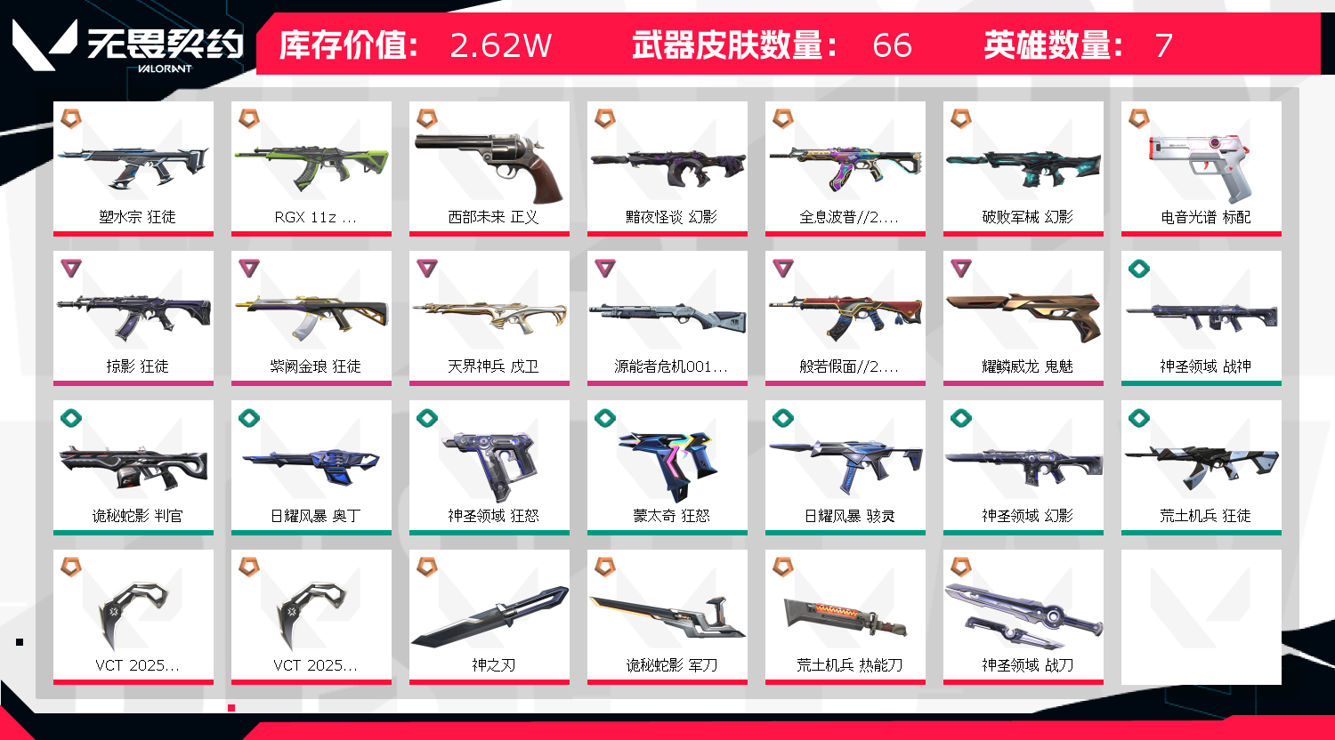 允许 英雄6 武器皮肤数量64;VCT 2025 爪刀,掠影 狂徒,紫阙金琅 狂徒,RGX 11z Pro 狂徒,天界神兵 戍卫,塑水宗 狂徒,西部未来 正义,