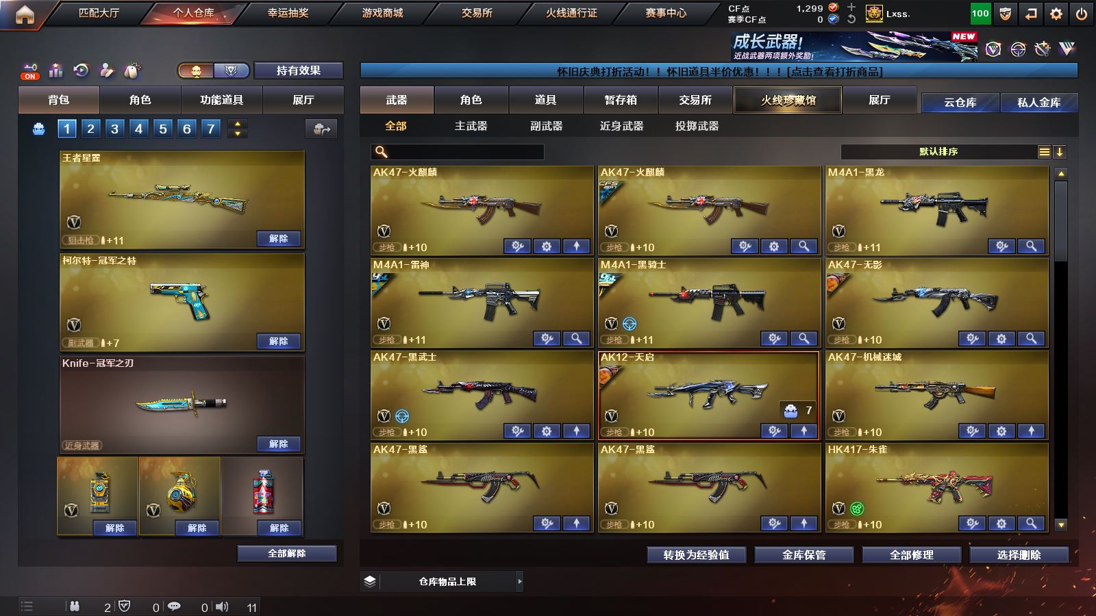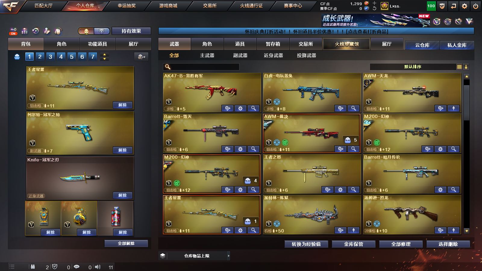 【M200幻神+冠军之幻皮肤+CFPLS17冠军皮肤+冠军之特+炽芒蝶刃】【王者星霆+冠军之刃】【白虎】【qbz03金色蔷薇+冠军之薇皮肤】【王者之魄 王者之势力 王者之武 王者之怒】【雷神+荣耀之魄皮肤】【黑骑士+冠军之势皮肤】【毁灭+毁灭音效卡+荣耀之魄皮肤】【火麒麟 黑龙 无影 黑武士 天启 机械迷城 黑鲨 朱雀 无影神兵利器 超新星热带奇洋 玫瑰精灵 9A91烈火 烈火动感闪耀 猩红传说 常胜将军 白虎电玩 天龙 裁决 巴雷特暗月传说 加特林炼狱 烈龙 AA12雷霆】——【冠军之特 沙鹰修罗 沙鹰天神 柯尔特竞技荣光 天神动感闪耀】——【炽芒蝶刃 擎天 屠龙 尼泊尔雷霆 斩神刀雷暴 屠龙动感闪耀 龙啸热带奇洋 王者之刺】——【雷霆投掷武器套装*2 雷暴投掷武器套装 雷霆王者投掷武器套装】——【赤狱骑士 雷神精英刀锋 炫金火麒麟 炫金雷神 炫金骑士 炫金毁灭 天龙曼陀罗 AWM灵狐15周年嘉年华】——【角色】【零 樱】;柯尔特-冠军之特,炽芒蝶刃,Knife-冠军之刃,QBZ03-金色蔷薇,M200-幻神,Scar Light-白虎,