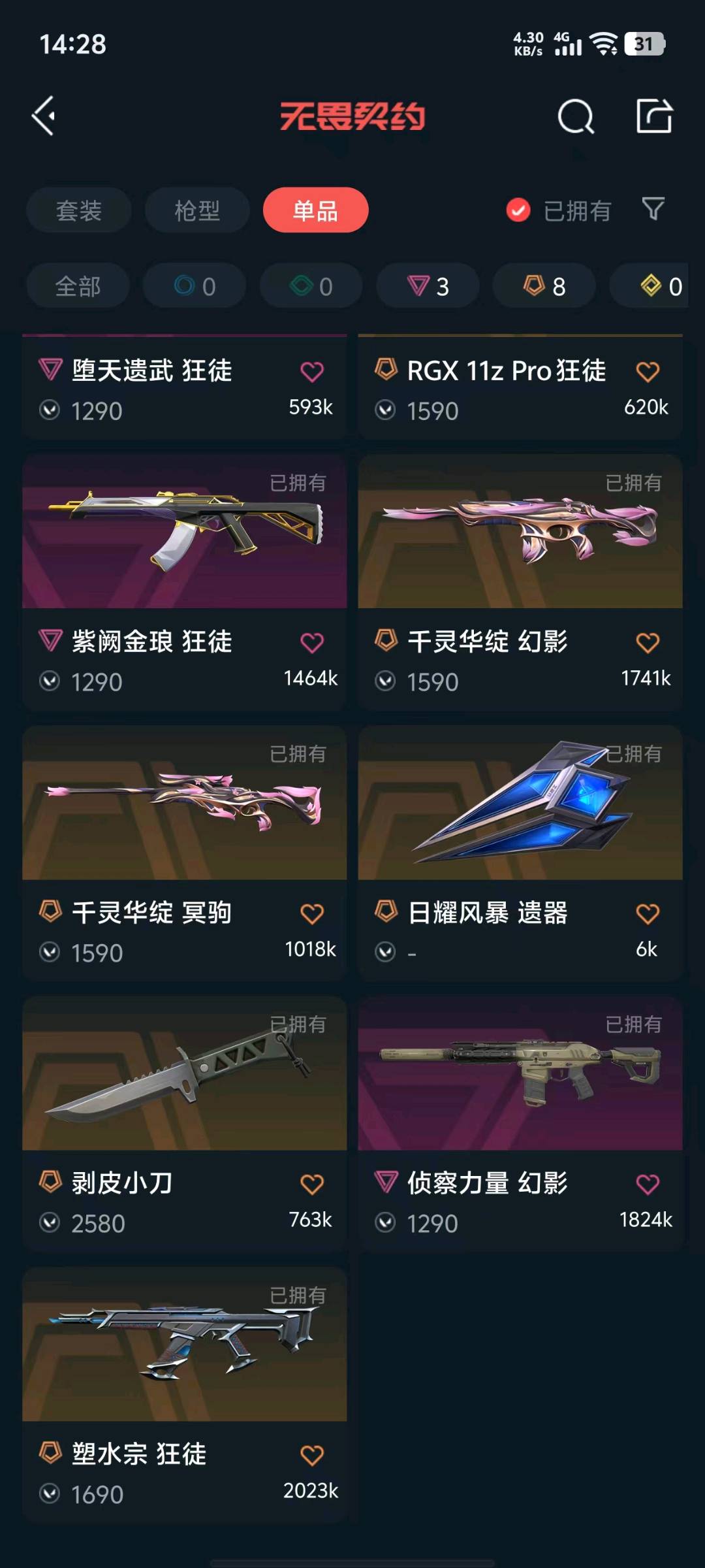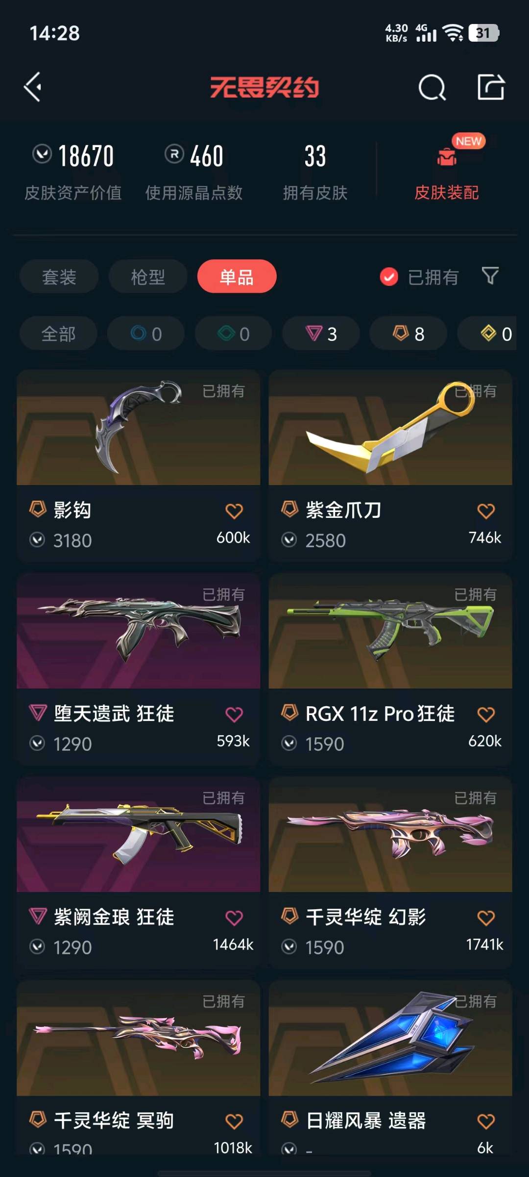 可排位1.8w库存33皮;紫金爪刀,剥皮小刀,侦察力量 幻影,紫阙金琅 狂徒,RGX 11z Pro 狂徒,堕天遗武 狂徒,塑水宗 狂徒,