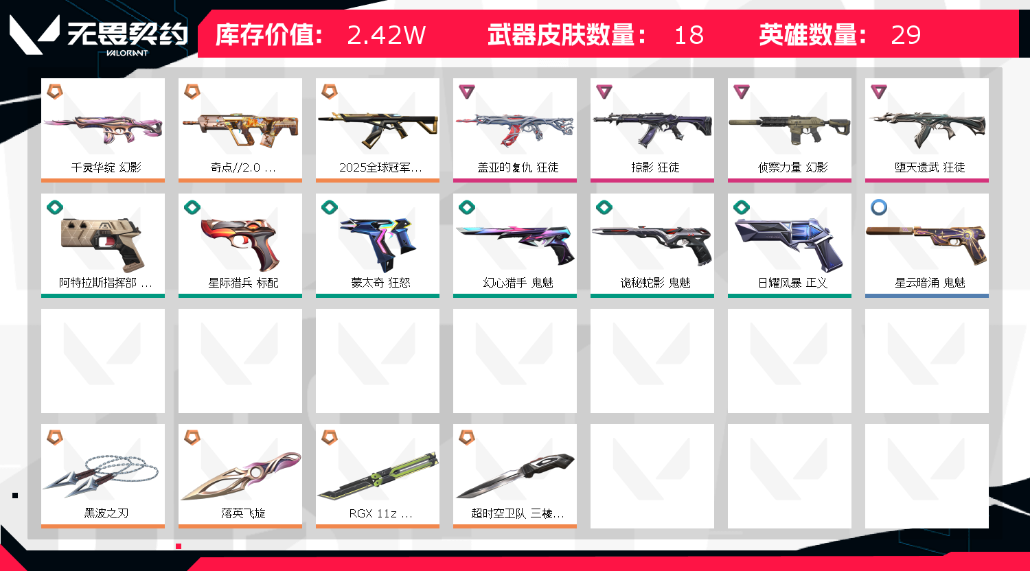 英雄27 武器皮肤数量18;黑波之刃,盖亚的复仇 狂徒,掠影 狂徒,侦察力量 幻影,堕天遗武 狂徒,