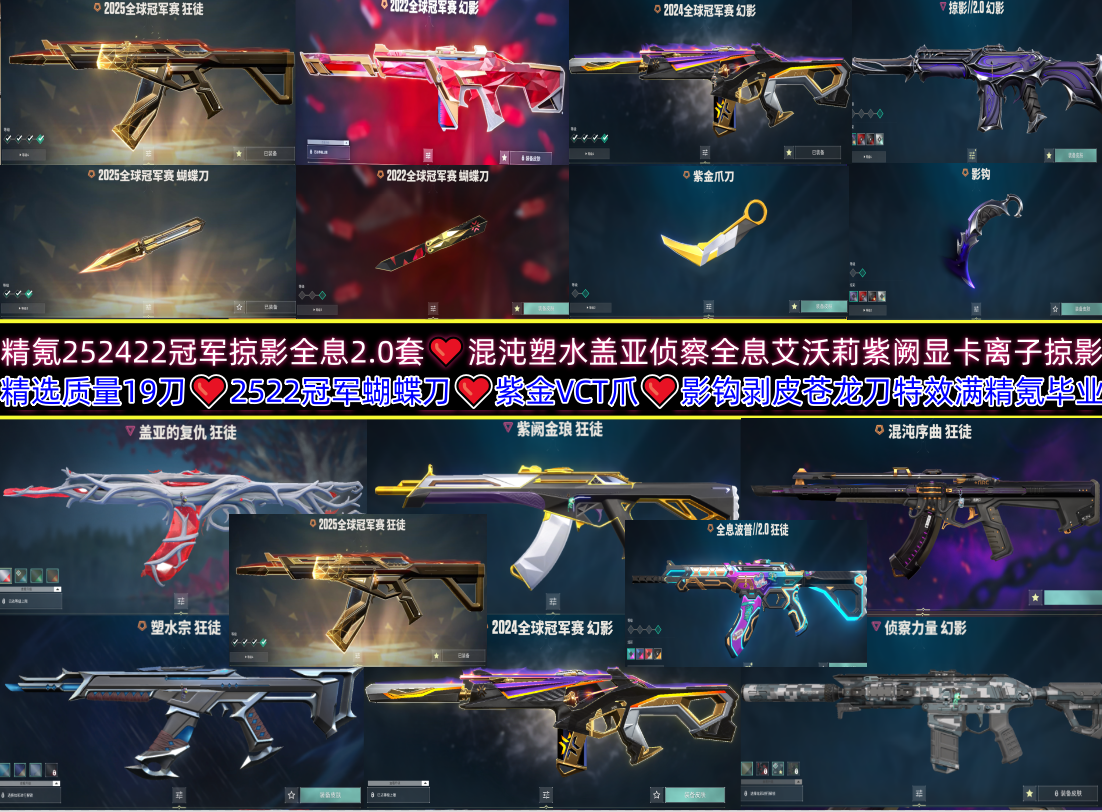 精氪252422冠军掠影全息2.0❤️混沌塑水盖亚侦察艾沃莉紫阙显卡离子掠影❤️ 精选质量19刀❤️2522冠军蝴蝶刀❤️影钩紫金VTC爪❤️剥皮苍龙特效满;5周年//公测重制版 苍龙之刃,紫金爪刀,剥皮小刀,镭切,VCT 2025 爪刀,归零者 獠犬,盖亚的复仇 狂徒,