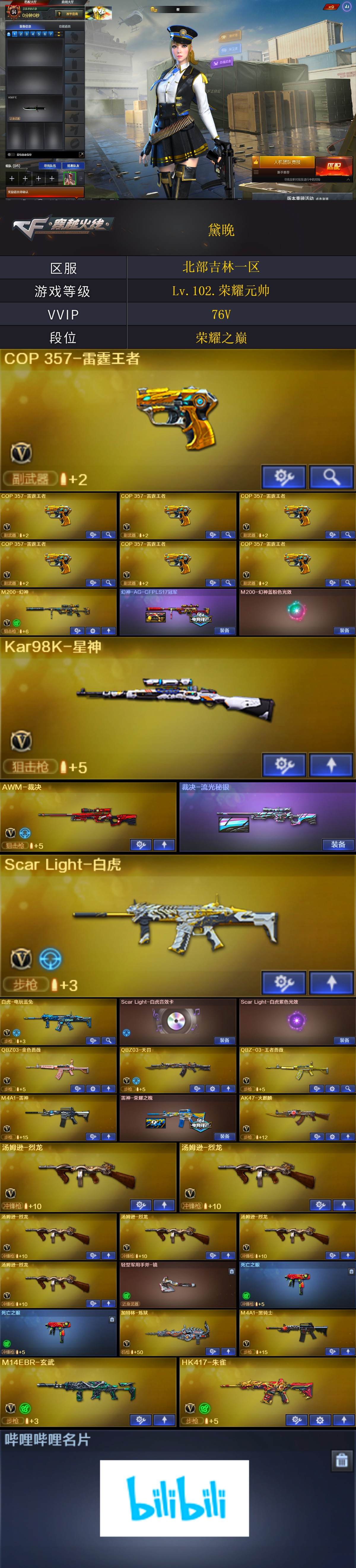 【商品标题】:北部吉林一区-76V-可二次实名-【Lv.102.荣耀元帅】-【段位:荣耀之巅】 【稀有武器】:M200-幻神/Kar98K-星神/ScarLight-白虎/M14EBR-玄武/HK417-朱雀/QBZ03-天罚/天神-动感闪耀/COP357-雷霆王者-觉醒版(7)/QBZ03-金色蔷薇/AK47-火麒麟(2)/M4A1-黑龙/M4A1-雷神/M4A1-黑骑士/AK47-无影/白虎-电玩蓝兔/Barrett-毁灭(2)/Barrett-极光/AWM-裁决/加特林-炼狱/悦蓝-惊涛骇浪-觉醒版/汤姆逊-烈龙(6)/斩神刀-雷暴/麒麟刺-堕天神/马来剑-夜魔 【王者武器】:M4A1-雷霆王者-觉醒版/QBZ-03-王者蔷薇-觉醒版/王者之怒-觉醒版 【热门角色】:乔伊教练/王者-葵-貂蝉/女主播/潘多拉-X/兔囡囡/幽/潘多拉 【热门音效卡】:Scar Light-白虎音效卡/Barrett-毁灭音效卡/M4A1-黑骑士音效卡 【热门皮肤】:幻神-AG-CFPLS17冠军/裁决-流光秘银/毁灭-直播专属/屠龙-荣耀之锋/雷神-荣耀之魄 【其他亮点】:贝雷塔687-射手座/金刚伞-电玩红兔/哔哩哔哩名片 (截图展示段位不代表实际段位,如赛季更新等不可抗拒因素发生变化,其余道具看截图或咨询客服);QBZ03-金色蔷薇,M200-幻神,Scar Light-白虎,Kar98K-星神,