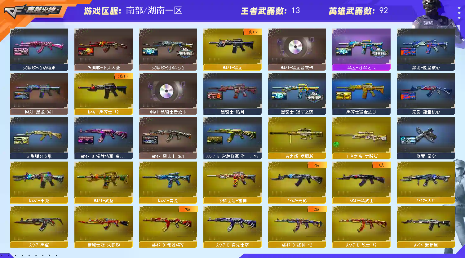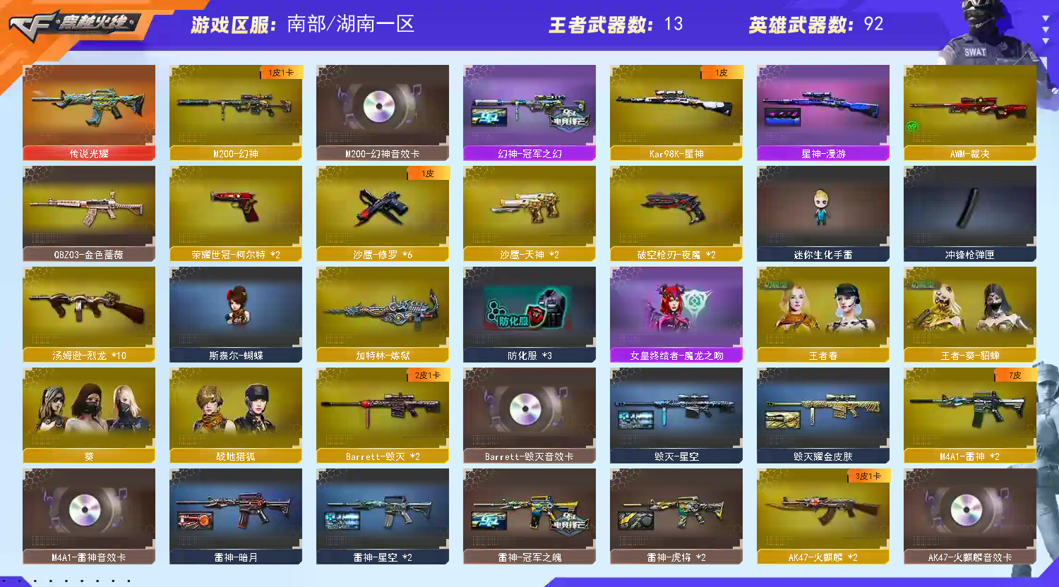 >>>>>>毁号,涉及毁坏虚拟财产罪及计算机安全罪,请文明游戏素质游戏,让我们共建美好租号平台>>>>>> 本游戏账号:英雄武器89个; 王者武器18个。 装备不多,但是主武器、副武器、近身武器够用 拥有完美游戏体验。重要的是,特殊装备有:AK47-火麒麟、QBZ03-金色蔷薇、龙啸-堕天神、烟雾弹-堕天神、闪光弹-堕天神、麒麟刺-堕天神、荣耀世冠-柯尔特、荣耀世冠-龙啸、荣耀世冠-雷神、荣耀世冠-火麒麟、M4A1-黑龙、Kar98K-星神、AN94-超新星、AK47-黑武士、AWM-天龙、麒麟刺、Barrett-毁灭、M4A1-雷神、破空枪刃-夜魔、传说光耀、M4A1-青龙、HK417-朱雀、M200-幻神、加特林-炼狱、M4A1-黑骑士、王者之锋-觉醒版、王者之魄闪光弹、王者之魄高爆手雷、王者之刺、王者之怒-觉醒版、王者之翼、炫金火麒麟、王者之势、炫金毁灭、王者之魄-觉醒版、王者炎心、炫金骑士、雷霆-β、堕天使、王者-葵-貂蝉、王者-春、M4A1-黑龙音效卡、M200-幻神音效卡、AK47-火麒麟音效卡、M4A1-雷神音效卡、王者之啸金色光效、M4A1-黑骑士音效卡、Barrett;荣耀世冠-柯尔特,QBZ03-金色蔷薇,M200-幻神,Kar98K-星神,