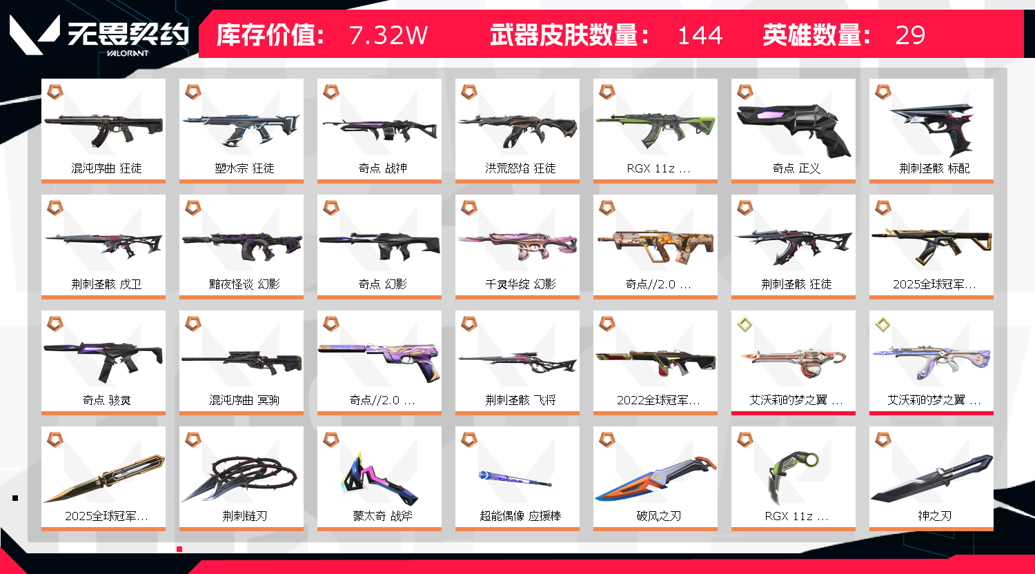 ak皮肤较多,玫瑰套也有 尽量别挂机,晚上十一点到第二天七八点号主要睡觉解不了冻 炸鱼轻点炸 难道是我小科比肘妈妈这个ID不拉风吗?给我ID还改了,何意为;艾沃莉的梦之翼 奥丁,奇点 战神,盖亚的复仇 狂徒,洪荒怒焰 狂徒,紫阙金琅 狂徒,RGX 11z Pro 狂徒,混沌序曲 狂徒,