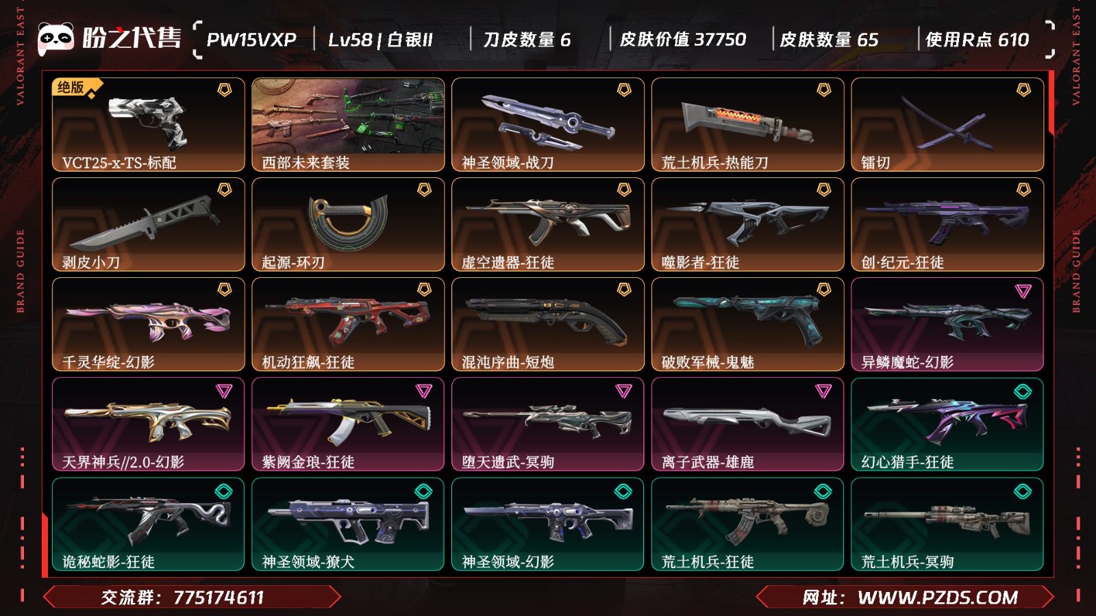 【皮肤资产价值】37750 【使用R点】610 【英雄数量】15 【皮肤数量】65 【卡面数量】70 【喷漆数量】72 【挂件数量】48 【拥有套装】西部未来套装(西部未来-幻影,西部未来-奥丁,西部未来-飞将,西部未来-正义,未来开拓者) 【拥有近战武器】神圣领域-战刀,荒土机兵-热能刀,镭切,剥皮小刀,起源-环刃, 【拥有步枪】虚空遗器-狂徒,噬影者-狂徒,创·纪元-狂徒,千灵华绽-幻影,机动狂飙-狂徒,异鳞魔蛇-幻影,天界神兵//2.0-幻影,紫阙金琅-狂徒,幻心猎手-狂徒,诡秘蛇影-狂徒,神圣领域-獠犬,神圣领域-幻影,荒土机兵-狂徒,甜心猎手-幻影,甜心猎手-戍卫,诛心猎手-獠犬,折光棱晶-戍卫,月球哨兵-戍卫,纳米-幻影,逆冲蛮牛-戍卫,逆冲蛮牛-獠犬, 【拥有狙击枪】堕天遗武-冥驹,荒土机兵-冥驹,诛心猎手-冥驹,甜心猎手-莽侠,末日之翼-飞将,星云暗涌-冥驹,月球哨兵-莽侠, 【拥有机枪】神圣领域-战神,诛心猎手-奥丁,末日之翼-奥丁,纳米-奥丁, 【拥有冲锋枪】荒土机兵-骇灵,甜心猎手-蜂刺,折光棱晶-蜂刺,星云暗涌-骇灵,星云暗涌-蜂刺, 【拥有霰弹枪】离子武器-雄鹿,诡秘蛇影-判官,月球哨兵-雄鹿,逆冲蛮牛-雄鹿,纳米-判官, 【拥有手枪】VCT25-x-TS-标配,混沌序曲-短炮,破败军械-鬼魅,神圣领域-狂怒,荒土机兵-标配,诛心猎手-正义,甜心猎手-短炮,末日之翼-短炮,折光棱晶-标配,星云暗涌-鬼魅,月球哨兵-正义,纳米-正义,逆冲蛮牛-狂怒, 【稀有挂件】薰衣草之心挂饰,V25第三幕黄金挂饰,第九季白银挂饰,终章猫猫木乃伊挂饰,猫猫木乃伊挂饰, 【卡面信息】万圣夜卡面,西部未来卡面,先驱者卡面,分崩离析卡面,;西部未来 奥丁,剥皮小刀,镭切,天界神兵//2.0 幻影,虚空遗器 狂徒,噬影者 狂徒,异鳞魔蛇 幻影,