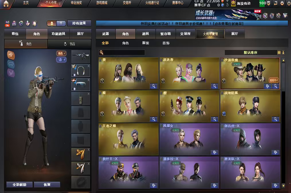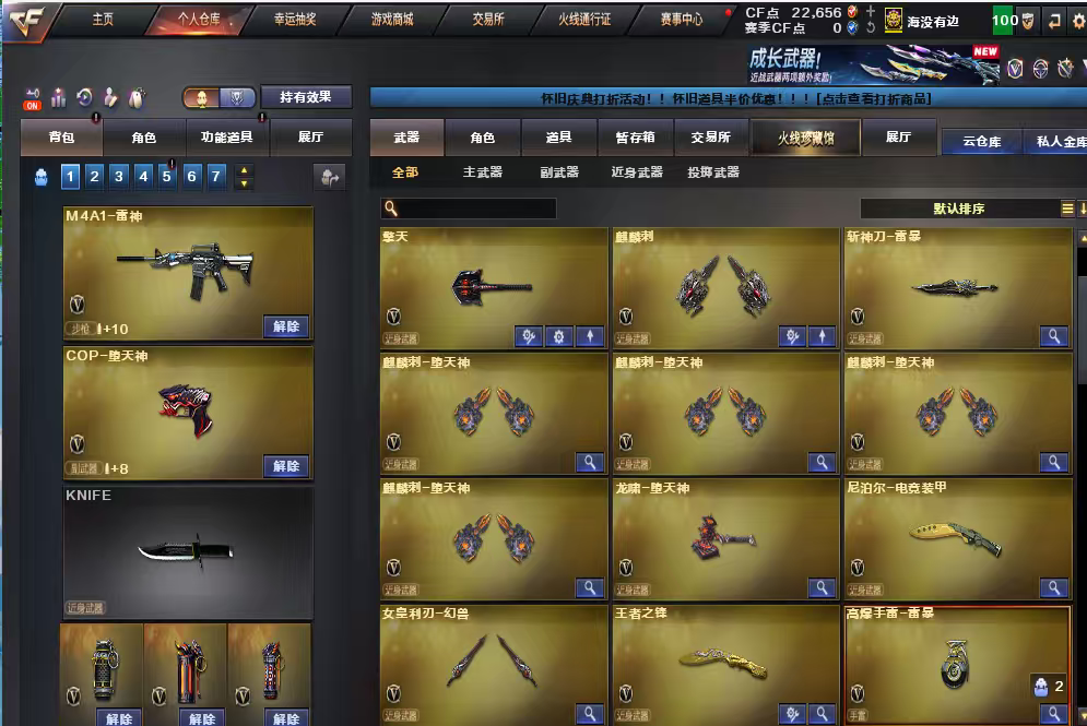 130V,0传说,9王者,1炫金,【稀有套装3】:雷暴套装/堕天神套装/电竞装甲套装;【重要角色8】:沙漠玫瑰/迷迭香/瞳/樱/葵/王者之瞳/新灵狐者/铁骑荣耀;【武器皮肤28】:M200-幻神-荣耀世冠白鲨/毁灭-黑大圣/毁灭-暗月/极光-能量核心*2/天龙-CFSTAR/天龙-秘银/黑龙-能量核心*3/雷神-能量核心/雷神-暗月/黑骑士-暗月/战神-粉色甜心/战神-紫绶金章/战神-流金岁月/无影-暗月*3/无影-能量核心/修罗-15周年嘉年华/修罗-能量核心*4/天神-暗月*2/雷神耀金;【英雄武器124】:M200-幻神/Barrett-电竞装甲/Barrett-暗月传说/Barrett-极光*2/Barrett-毁灭*2/AWM-天龙/QBZ03-独角-I/黑骑士-海王/M4A1-夜魔*2/M4A1-青龙/M4A1-堕天神/M4A1-雷神*3/M4A1-黑骑士/M4A1-千变/AK47-雷暴/AK47-火麒麟/AK47-B-战神/AK47-B-战士/AK-47-猩红传说/AK47-黑鲨/AK47-机械迷城*2/HK417-朱雀/AN94-超新星/RPK-盘龙*2/汤姆逊-烈龙*6/AA-12-雷霆/柯尔特-电竞装甲/COP-堕天神*2/USP-雷暴/沙鹰-修罗*5/沙鹰-幻兽/沙鹰-天神/尼泊尔-电竞装甲/屠龙*3/龙啸-堕天神/龙啸*2/擎天/麒麟刺-堕天神*4/麒麟刺/女皇利刃-幻兽/斩神刀-雷暴/恶棍-电竞装甲*7/高爆手雷-雷暴*5/高爆手雷-堕天神*7/高爆手雷-幻兽/闪光弹-电竞装甲*7/闪光弹-雷暴*5/闪光弹-堕天神*7/闪光弹-幻兽/烟雾弹-电竞装甲*7/烟雾弹-雷暴*5/烟雾弹-堕天神*7/烟雾弹-幻兽;【热门武器14】:2盘龙/5修罗/6烈龙/1黑骑士;【音效卡2】:M4A1-黑骑士音效卡/Barrett-毁灭音效卡;【王者武器8】:王者之武-觉醒版/王者之魄-觉醒版/玫瑰精灵-悦动/王者之心/炼狱-悦蓝*3/王者之锋-觉醒版;【炫金武器1】:炫金修罗;【小人枪6】:M4A1-雷神-精英刀锋/迷你深渊冰龙/魔能飞环-曼陀罗/斯泰尔-蝴蝶/巴雷特-零-水下丽影*2;【暴走生化2】:斯泰尔-蝴蝶/死亡之眼;【挑战大师8】:KAC-圣炎切割者III*2/神圣爆裂者III/迷你深渊冰龙/AK47-冰龙粉碎者/阐释者III/神罚/征服者;USP-雷暴,沙漠玫瑰,RPK-盘龙,M200-幻神,