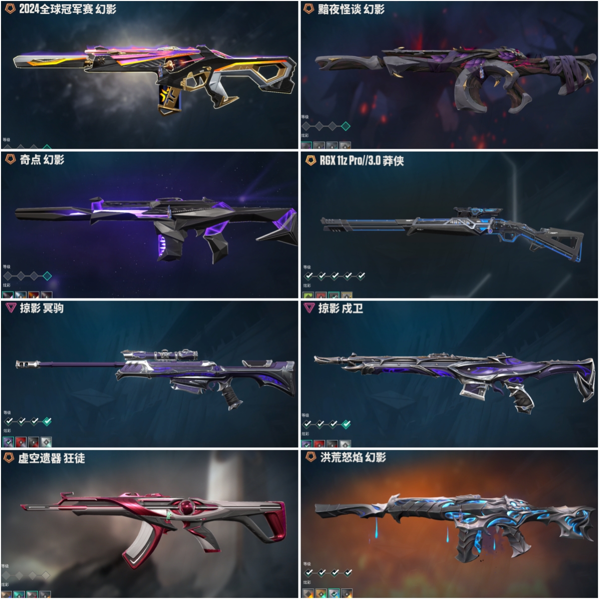 【拥有步枪】多弥尔的复仇-狂徒,虚空遗器-狂徒,噬影者-狂徒,混沌序曲-狂徒,黯夜怪谈-幻影,洪荒怒焰-幻影,塑水宗-狂徒,全息波普//2.0-狂徒,奇点-幻影,ORA-x-颗秒-狂徒,艾沃莉的梦之翼-狂徒,堕天遗武-狂徒,紫阙金琅-狂徒,盖亚的复仇-狂徒,幻心猎手-狂徒,星际猎兵-幻影,日耀风暴-幻影,诡秘蛇影-狂徒,神圣领域-獠犬,神圣领域-幻影,荒土机兵-狂徒,超限闪存-幻影,超能偶像-戍卫,超能偶像-狂徒,甜心猎手-幻影,甜心猎手-戍卫,诛心猎手-獠犬,光环序列-戍卫,瑰梦艺语-狂徒,幻语魔咒-獠犬,甜蜜战术-戍卫,末日之翼-幻影,折光棱晶-戍卫,月球哨兵-戍卫,纳米击-幻影,逆冲蛮牛-戍卫,逆冲蛮牛-獠犬,模拟赫兹-獠犬,浮光跃金-戍卫,聚合之力-幻影,采蜜小蜂队-獠犬,
