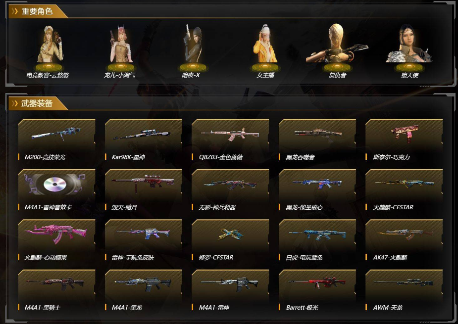 【山东一区/51V/vip1】【竞技荣光套】【M200-竞技荣光】【Kar98K-星神】【柯尔特-竞技荣光*2】【QBZ03-金色蔷薇】【QBZ03-天罚】【M4A1-雷神/M4A1-雷神音效卡/雷神-宇航兔皮肤】【COP-堕天神】【Barrett-毁灭*2/毁灭-暗月】【AK47-火麒麟*2/火麒麟-CFSTAR*2/火麒麟-心动糖果】【M4A1-黑骑士/黑骑士-海王】【M4A1-黑龙/黑龙-能量核心】【无影-神兵利器】【黑武士-锦绣游龙】【AWM-天龙/天龙-CFSTAR】【Barrett-极光/极光-能量核心】【RPK-盘龙】【修罗-CFSTAR】【沙鹰-天神/天神-动感闪耀】【麒麟刺/麒麟刺-萌杀皮肤】【擎天*2/擎天-竞技荣光】【屠龙/屠龙-动感闪耀】【荣耀世冠-龙啸】【电竞教官-云悠悠/女主播/龙儿-小淘气/暗夜-X/木兰/乔伊教练/兔囡囡/萌儿/麻雀/紫霞/灵狐者-黄金海岸/妲己/潘多拉-X/斯沃特-X/堕天使/复仇者】【白虎-电玩蓝兔/AK47-B-战神*2/AK-47-猩红传说*5】【Barrett-暗月传说*2】【Colt1911-小故障/Colt 1911-大黄蜂/柯尔特-萌杀/新USP-枪王排位奖励*3】【金刚伞-电玩红兔】【神圣爆裂者-末日III/激光毁灭者III/冰龙粉碎者-白马银枪】【黑龙吞噬者/斯泰尔-巧克力】【黄金迷你深渊冰龙】【高爆手雷-竞技荣光*2/闪光弹-竞技荣光*2/烟雾弹-竞技荣光*3】【高爆手雷-神工天巧】【炫金雷神/炫金骑士】【火线妹语音包】【透明护目镜/烟雾保护头盔/闪光护目镜/超级对讲机/超级背包/炫彩背包/防弹头盔*4/防弹衣*4/C4工具钳*4/手雷包*4/防化服*3】;电竞教官-云悠悠,RPK-盘龙,QBZ03-金色蔷薇,Kar98K-星神,