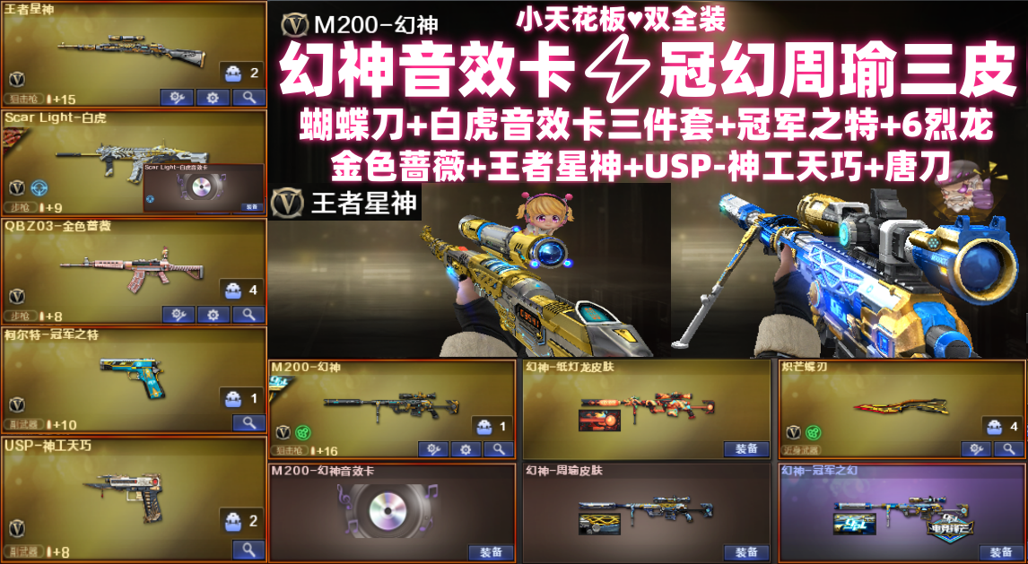 >>>>>>毁号,涉及毁坏虚拟财产罪及计算机安全罪,请文明游戏素质游戏,让我们共建美好租号平台>>>>>> 【蝴蝶刀】M-幻神音效卡⚡冠军之幻周瑜纸灯龙三皮⚡白虎三件套⚡王者星神⚡冠军之特炽芒蝶刃✅生化6烈龙 潘多拉、雷霆-β、堕天使、王者-迷迭香、圣诞潘多拉-X、生化弹匣、Scar Light-白虎音效卡、Barrett-毁灭音效卡、M200-幻神音效卡、王者之啸金色光效、M4A1-黑骑士音效卡、 注意事项: A.游戏过程中请不要恶意挂机或者不文明发言 B.恶意挂机、顶号等行为将被拉黑无法再次下单 C.进入游戏后中途请勿退出登陆,否则无法再次上号 D.部分账号由于异地登录可能会出现密码错误提示,通常再尝试5-6次后可上号 |||||||||喜欢本账号请点 ☆收藏☆ 方便下次租用,谢谢光临惠顾|||||||||;柯尔特-冠军之特,炽芒蝶刃,RPK-盘龙,QBZ03-金色蔷薇,M200-幻神,Scar Light-白虎,
