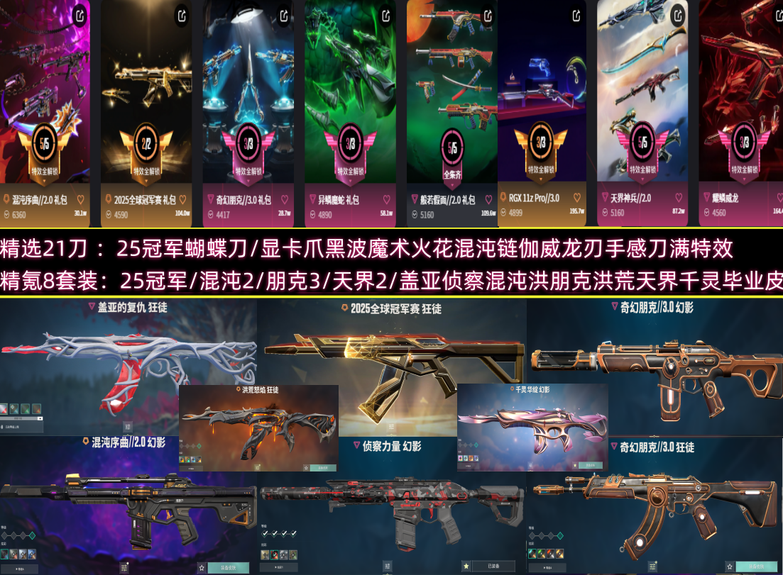 精选21刀 :25冠军蝴蝶刀/显卡爪黑波魔术火花混沌链伽威龙刃手感刀满特效 精氪8套装:25冠军/混沌2/朋克3/天界2/盖亚侦察混沌洪朋克洪荒天界千灵毕业皮;艾沃莉的梦之翼 奥丁,黑波之刃,威龙之刃,天界神兵//2.0 幻影,盖亚的复仇 狂徒,洪荒怒焰 狂徒,异鳞魔蛇 幻影,