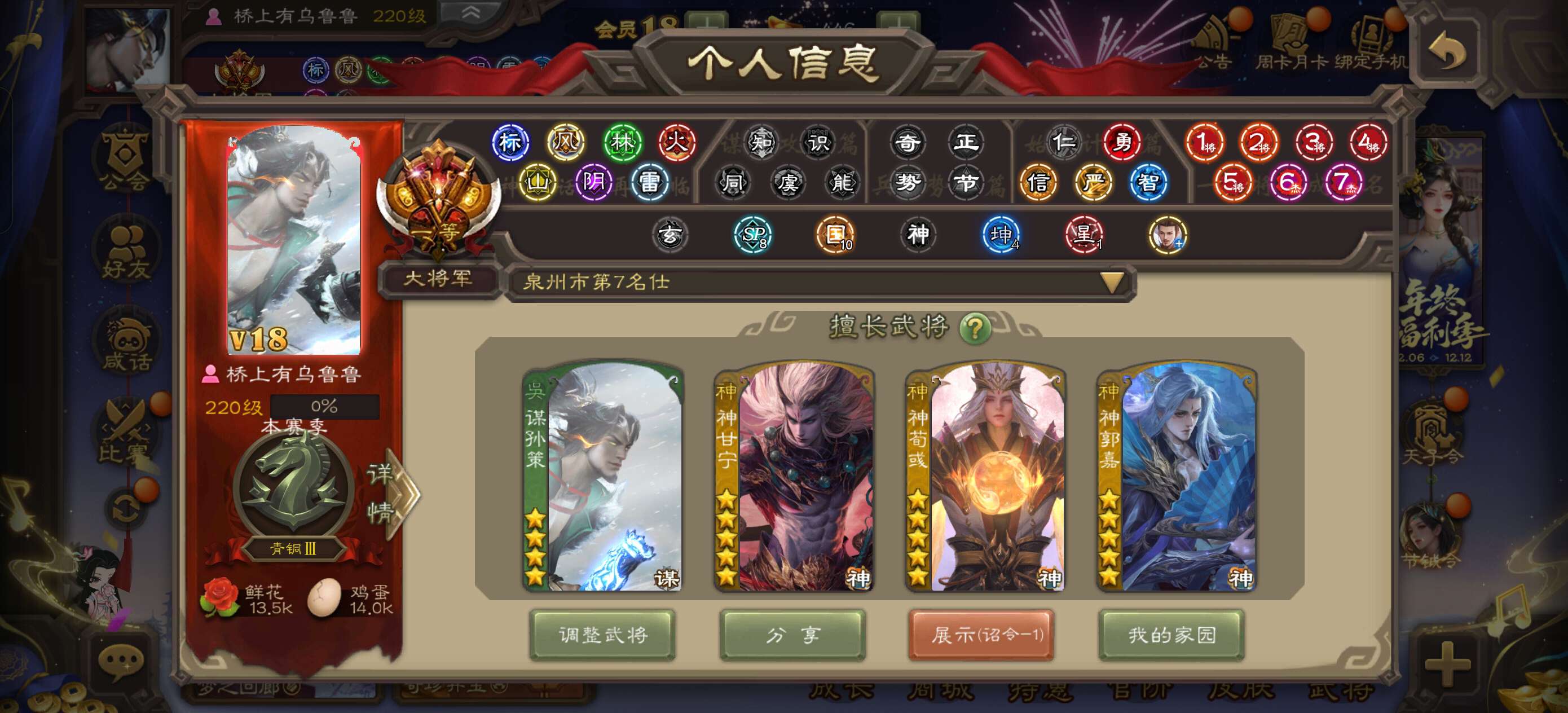 【VIP等级】VIP18[官阶]一等大将军【游戏等级]220【史诗武将数量】109【所有武将数量】517【所有皮肤数量]807【动态皮肤数量]137 【武将】崔芙至臻谋孙策至臻神郭嘉回廊神荀彧回廊神甘宁刘焉势董昭谋曹丕曹髦谋诸葛谋关羽鲍三娘势太史慈谋黄盖张奋孙寒华友诸葛十常侍谋刘备谋张角势于吉杜预杨彪司马昭祢衡星董卓谋郭淮文鸯清河公主马钧司马孚谋黄月英界沮授…… [动态皮肤]逐鹿天下。曹操,虎啸生风。许褚,牛年立冬。司马懿,明珠耀躯。甄姬,洛水神韵。甄姬,龙生九子。张辽,墨点