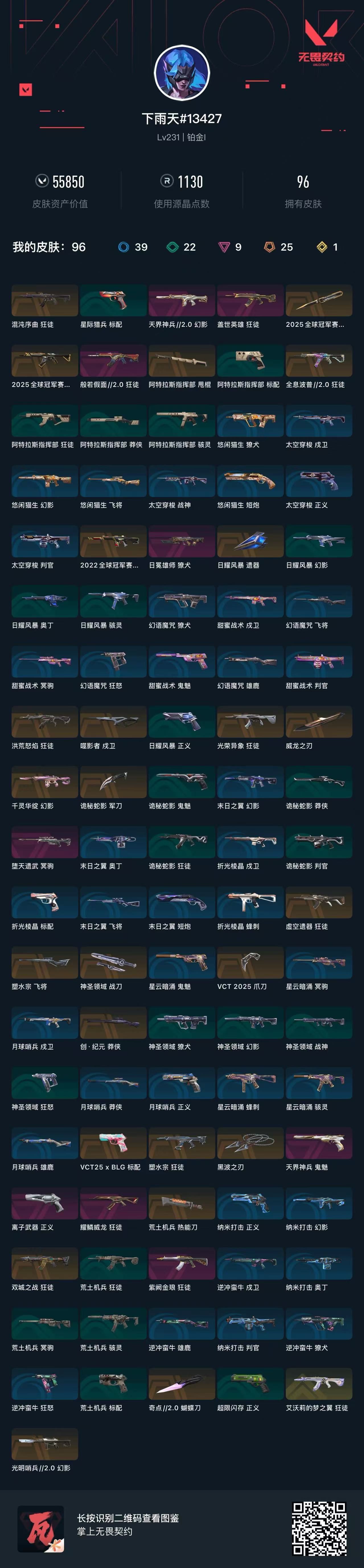 武器皮肤数量 96 英雄数量 14 卓越武器数量 9;黑波之刃,威龙之刃,VCT 2025 爪刀,天界神兵//2.0 幻影,虚空遗器 狂徒,洪荒怒焰 狂徒,紫阙金琅 狂徒,