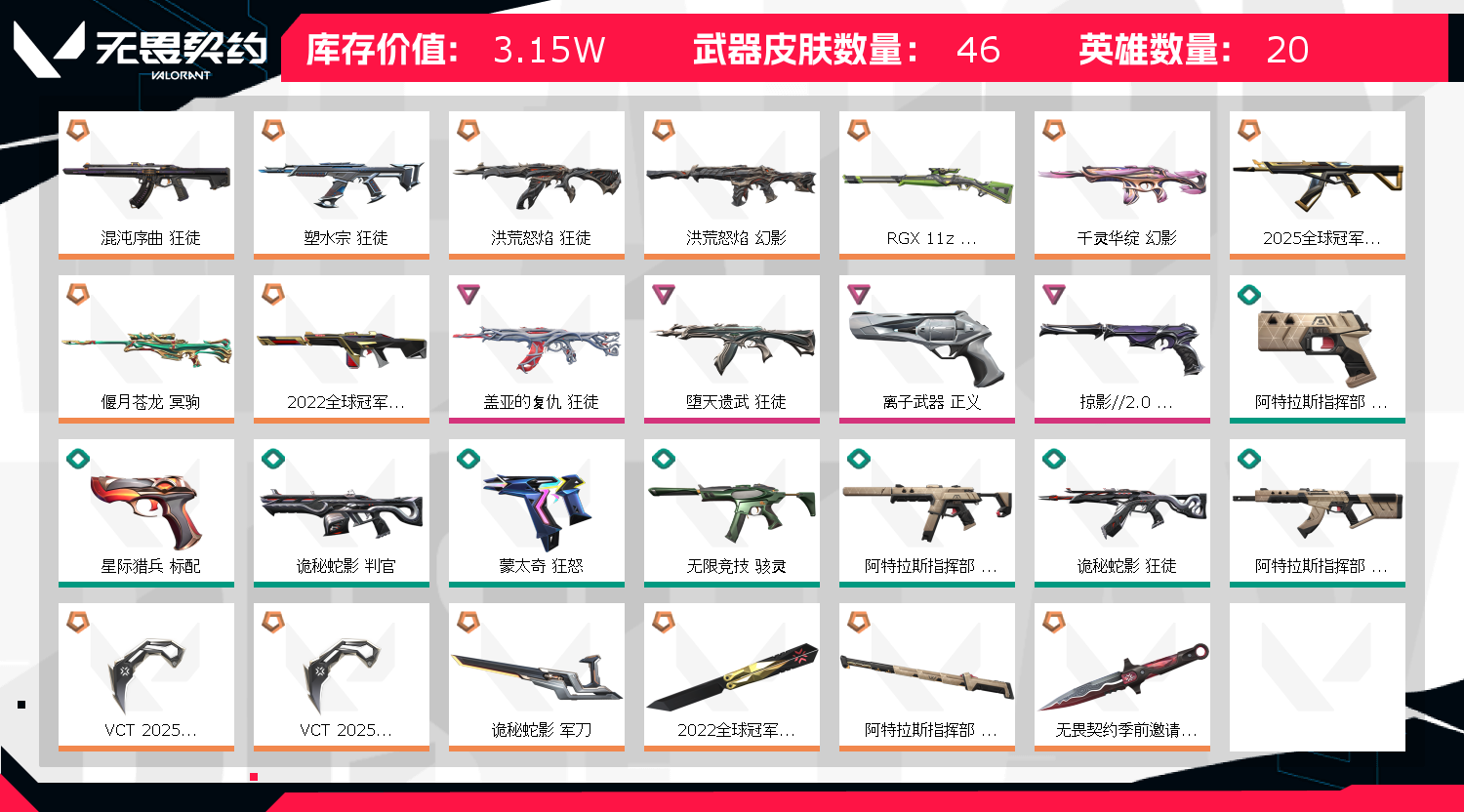 超凡挂饰,允许排位 怜悯之刃,大量热门主武器,时间快到请勿开游戏否则拉黑!请各位兄弟姐妹素质游戏喔~😙;VCT 2025 爪刀,盖亚的复仇 狂徒,洪荒怒焰 狂徒,洪荒怒焰 幻影,堕天遗武 狂徒,混沌序曲 狂徒,塑水宗 狂徒,