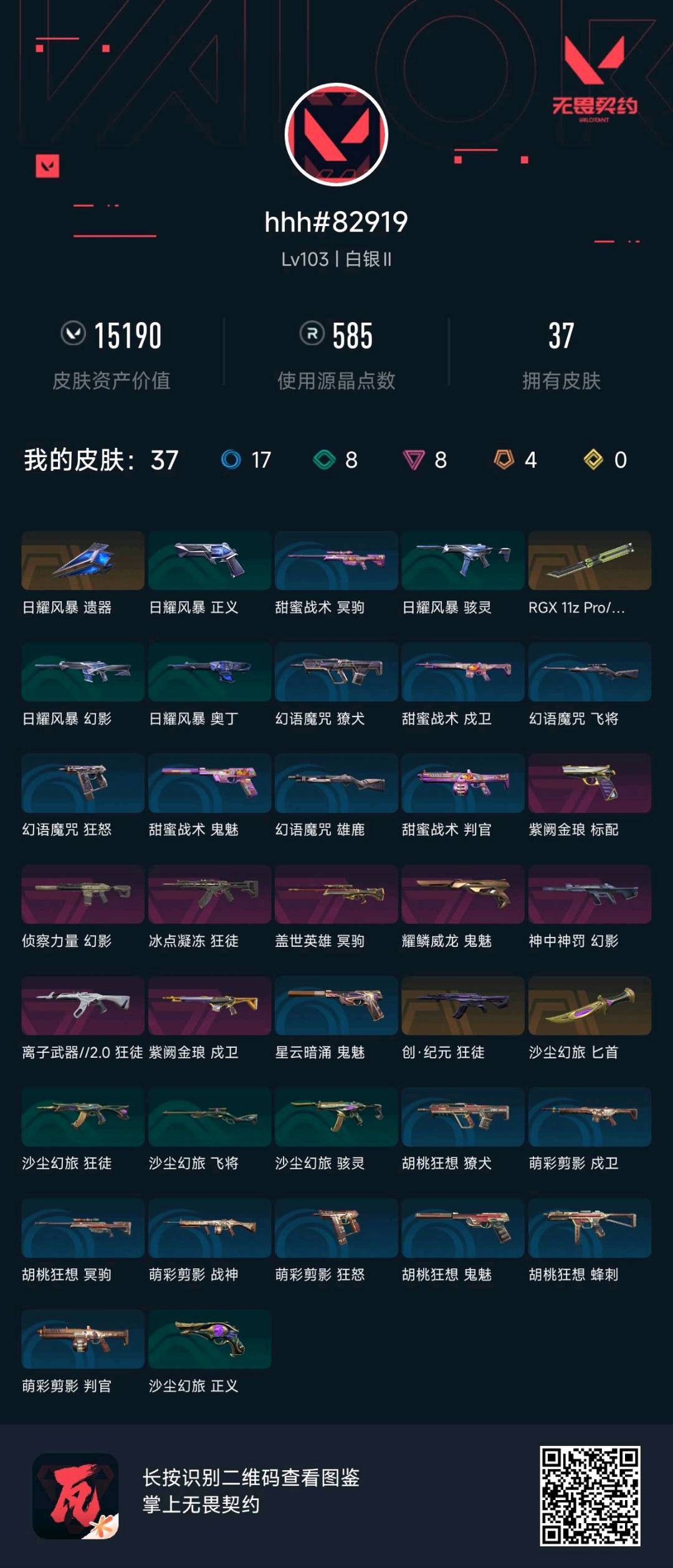 【白银II高性价比号】37款皮肤+可排位,日耀/甜蜜战术系列齐活! 段位:白银II,可正常排位/匹配,无封禁风险 - 等级:103级 - 剩余资源:源晶点数585,可兑换道具 - 皮肤资产价值:15190,共37款皮肤 皮肤详情: 涵盖多个人气系列: 日耀风暴系列:遗器、正义、骇灵、幻影、奥丁 - 甜蜜战术系列:冥驹、戍卫、鬼魅、判官 - 幻语魔咒系列:獠犬、飞将、狂怒、雄鹿 - 其他限定/热门款:RGX 11z Pro、紫阙金琅标配、侦察力量幻影、冰点凝狂徒、盖世英雄冥驹等 租号规则: 1. 禁止使用外挂、挂机等违规行为,否则永久拉黑 3. 文明租号,保持账号清洁,感谢配合;侦察力量 幻影,离子武器//2.0 狂徒,紫阙金琅 标配,