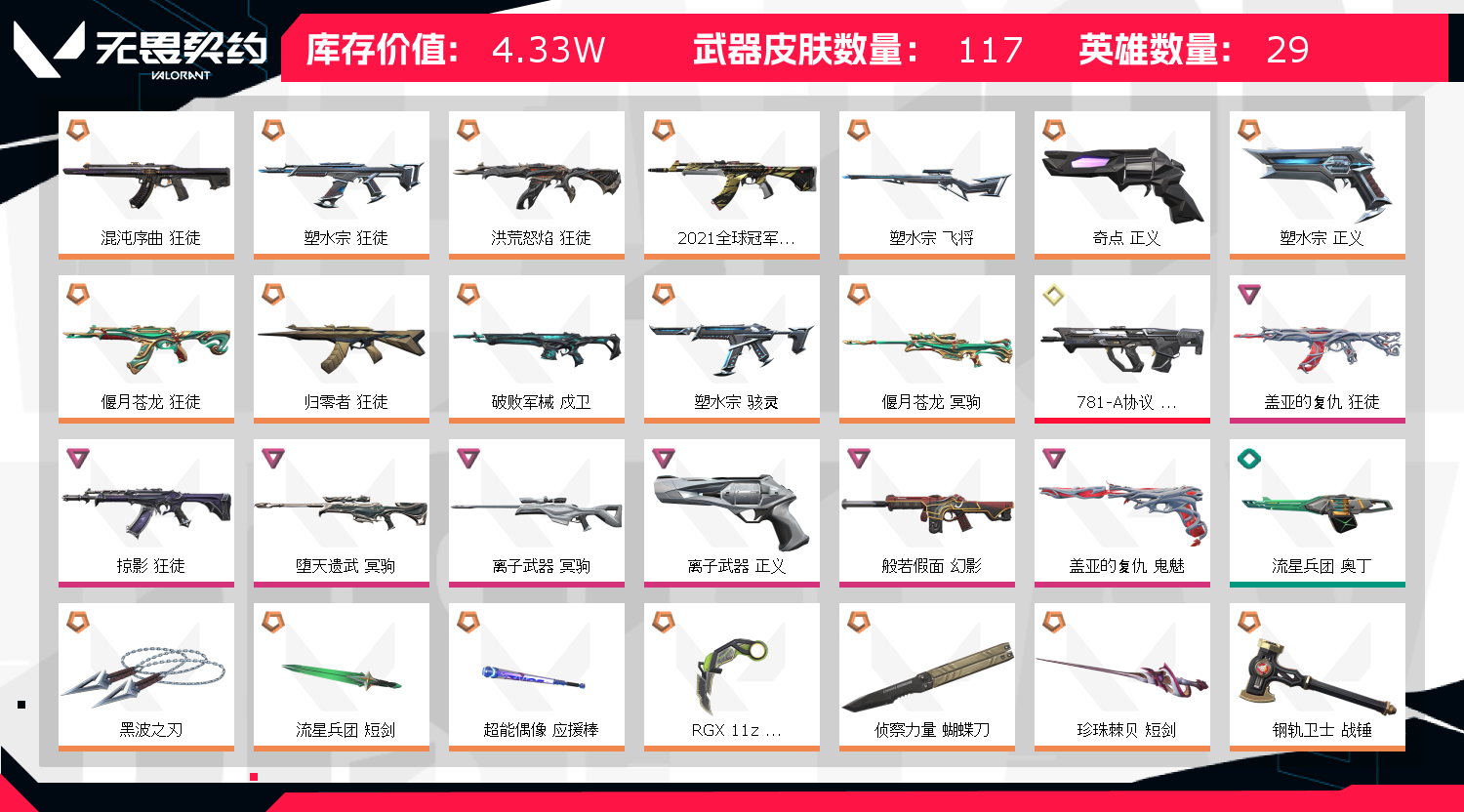 可排位 英雄28 武器皮肤数量115 2021冠军狂徒 塑水宗全套 奇点蝴蝶刀 显卡爪刀