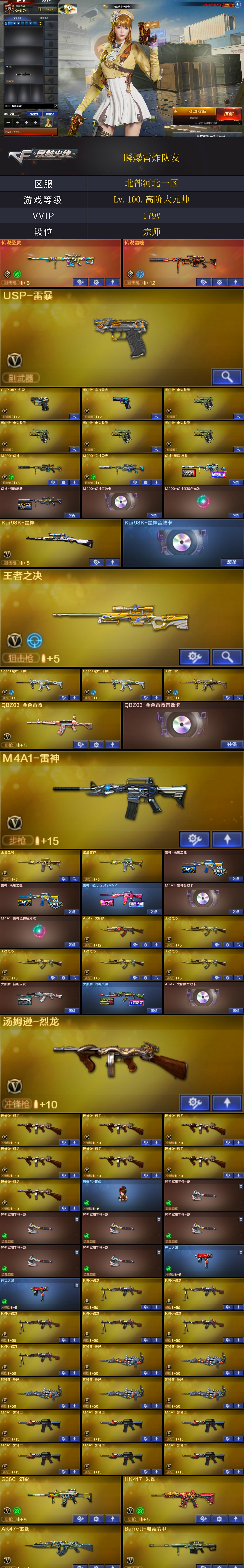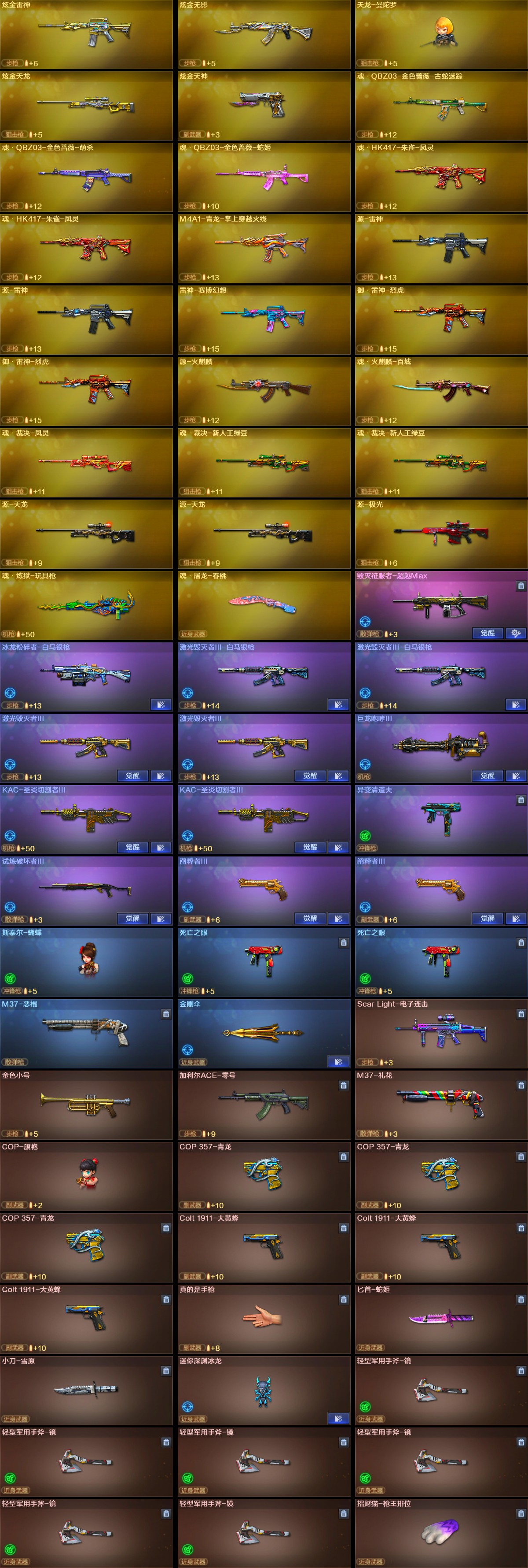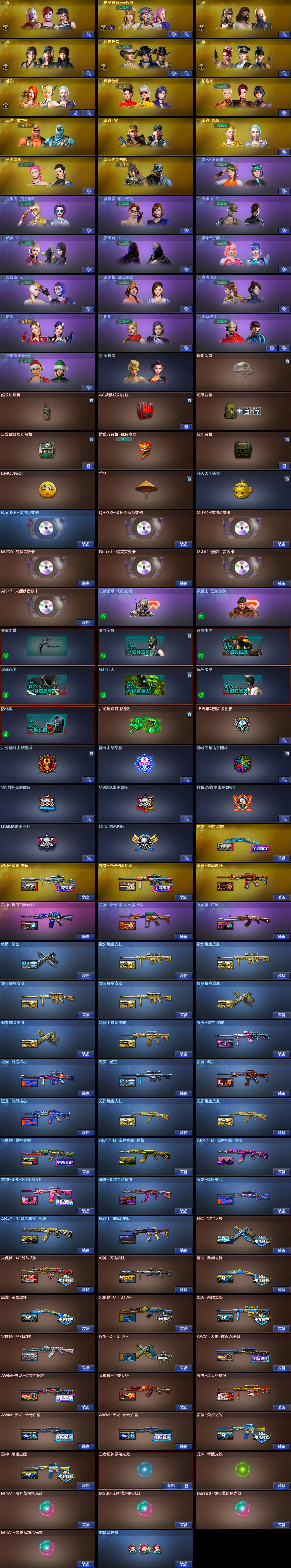 【稀有武器】:传说圣灵/传说幽瞳/M200-幻神/Kar98K-星神/G36C-幻影/ScarLight-白虎(2)/HK417-朱雀/AK47-雷暴/USP-雷暴/柯尔特-电竞装甲(4)/COP357-幻灵/柯尔特-竞技荣光/天神-动感闪耀/修罗-古蛇迷踪/金色蔷薇-古蛇迷踪/QBZ03-金色蔷薇/AK47-火麒麟(6)/M4A1-黑龙(2)/M4A1-雷神(5)/M4A1-黑骑士(6)/AK47-黑武士/Barrett-毁灭(5)/Barrett-极光/Barrett-电竞装甲/M200-竞技荣光/RPK-盘龙(6)/加特林-炼狱(5)/汤姆逊-烈龙(8)/AA-12-雷霆(6)/斩神刀-雷暴/尼泊尔-电竞装甲/擎天-竞技荣光 【王者武器】:王者之心-觉醒版(4)/王者之魄-觉醒版/王者白虎-觉醒版/王者之光-觉醒版(2)/王者之决-觉醒版/王者之决 【热门角色】:春/电竞教官-云悠悠/沙漠玫瑰/魅影/乔伊教练/蛇隐宗/王者-零/王者-魅影/王者涂鸦/新海豹突击队/灵狐者-职业经理/潘多拉-X/职业选手 【热门音效卡】:M200-幻神音效卡/Kar98K-星神音效卡/QBZ03-金色蔷薇音效卡/M4A1-雷神音效卡/Barrett-毁灭音效卡/M4A1-黑骑士音效卡/AK47-火麒麟音效卡 【热门皮肤】:幻神-星耀皮肤/幻神-周瑜皮肤/屠龙-星耀皮肤/火麒麟-战神关羽/雷神-宠儿-2019MVP/屠龙-荣耀之锋(2)/毁灭-荣耀之怒/雷神-荣耀之魄(2) 【其他亮点】:斯泰尔-蝴蝶/异变清道夫;USP-雷暴,沙漠玫瑰,电竞教官-云悠悠,RPK-盘龙,QBZ03-金色蔷薇,传说幽瞳,G36C-幻影,