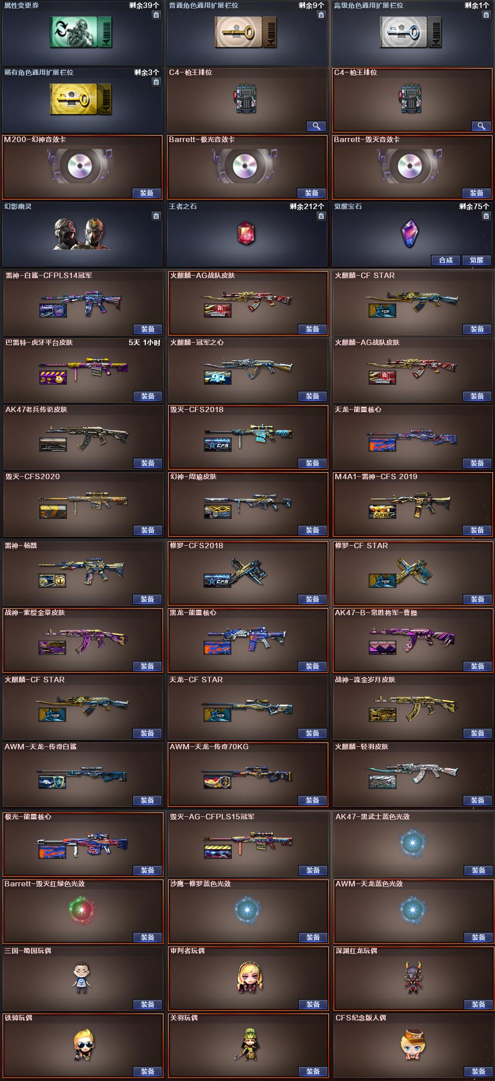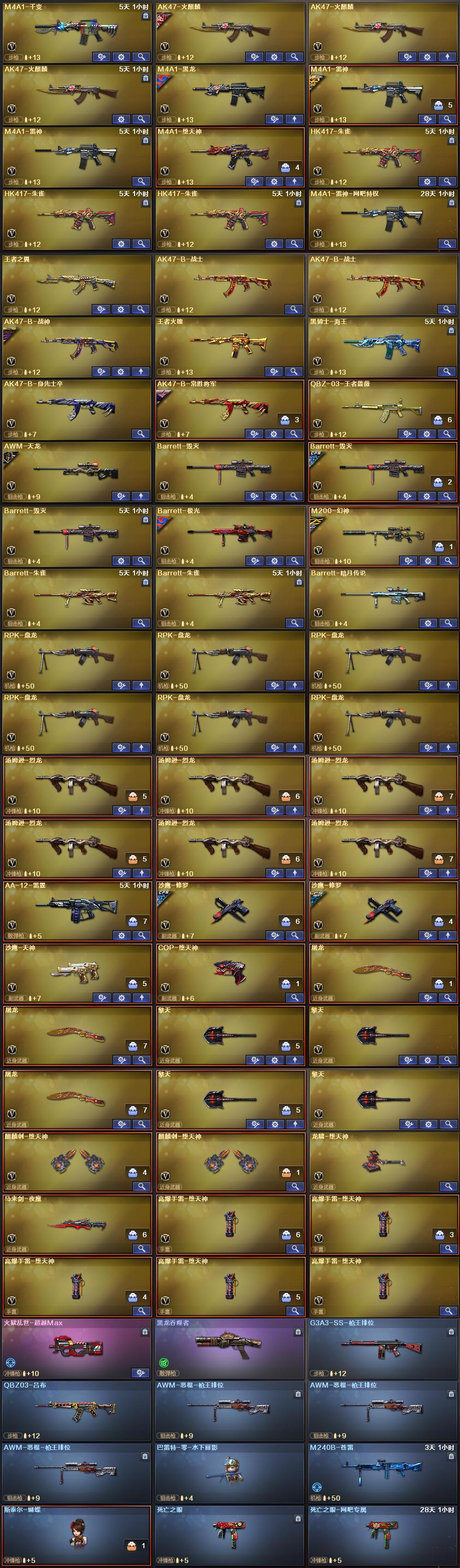北方大区,M200幻神+幻神周瑜+音效卡,堕天神套,王者火魄,QBZ王者蔷薇,COP堕天神,6盘6烈,斯太尔蝴蝶,死亡之眼两把,水下丽影,4英雄级角色,四防王者春,四防王者葵貂蝉,幻神音效卡,极光音效卡,毁灭音效卡,雷神白鲨冠军,火麒麟AG战队皮肤,STAR,火麒麟冠军之心,雷神2019,毁灭2020,杨戬,修罗2018,毁灭AG冠军,传奇白鲨,轻羽皮肤等等;RPK-盘龙,M200-幻神,
