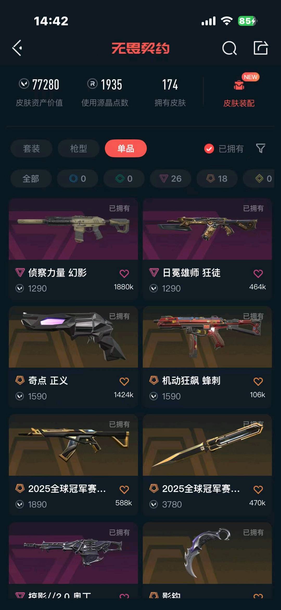 可排7.7w库存174皮✨双冠军套✨盖亚紫金混沌流脓离子狮子侦察✨显卡vct掠夺爪太刀✨奇点西部正义;VCT 2025 爪刀,盖亚的复仇 狂徒,虚空遗器 狂徒,掠影 戍卫,洪荒怒焰 狂徒,掠影 狂徒,侦察力量 幻影,