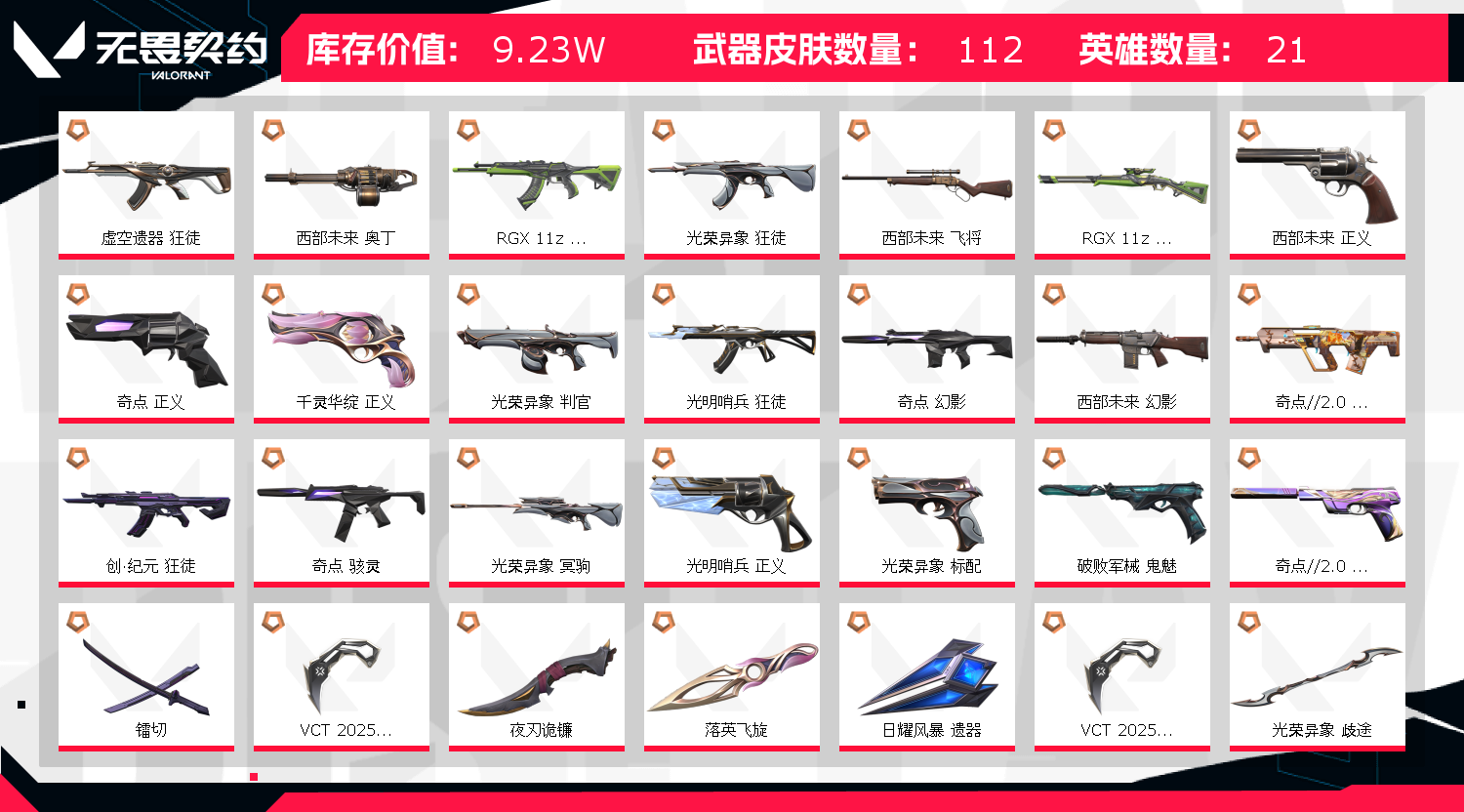 1:10把精品狂徒 英雄20 武器皮肤数量109 2:描述的套装全部都是有的 不可能有账号不符合一说 看清楚再租 不包括套装所有炫彩 乱投诉 拉黑 举报。不要开挂炸鱼 否则后果自负。;西部未来 奥丁,镭切,VCT 2025 爪刀,上古龙炎 判官,虚空遗器 狂徒,掠影 戍卫,掠影 狂徒,