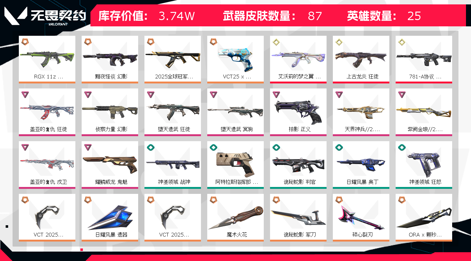 首页 > 租号大厅 > 无畏契约-wegame > wegame/wegame > 3.7w库存 可排位禁止挂机25vct爪刀魔术花火颗秒军刀,盖亚猫猫显卡弃王ak,侦查古神781幻影